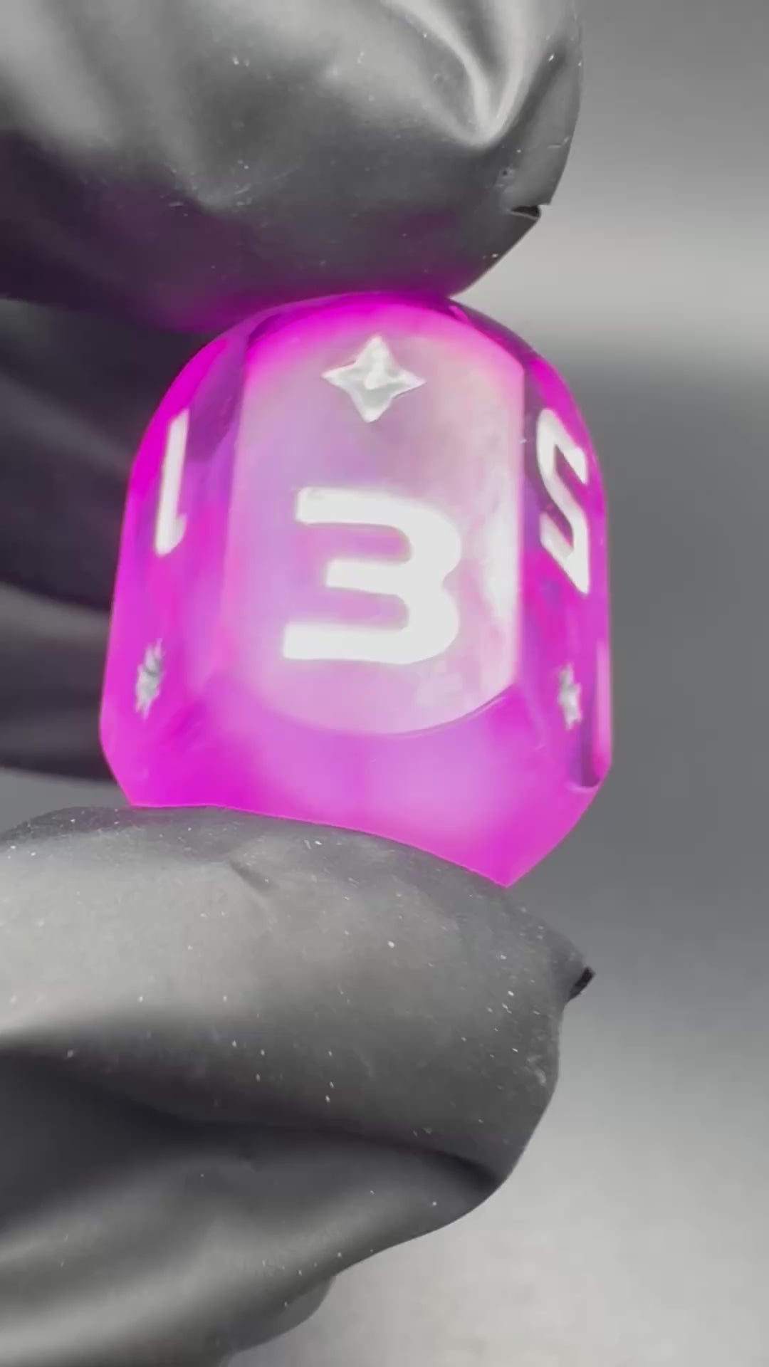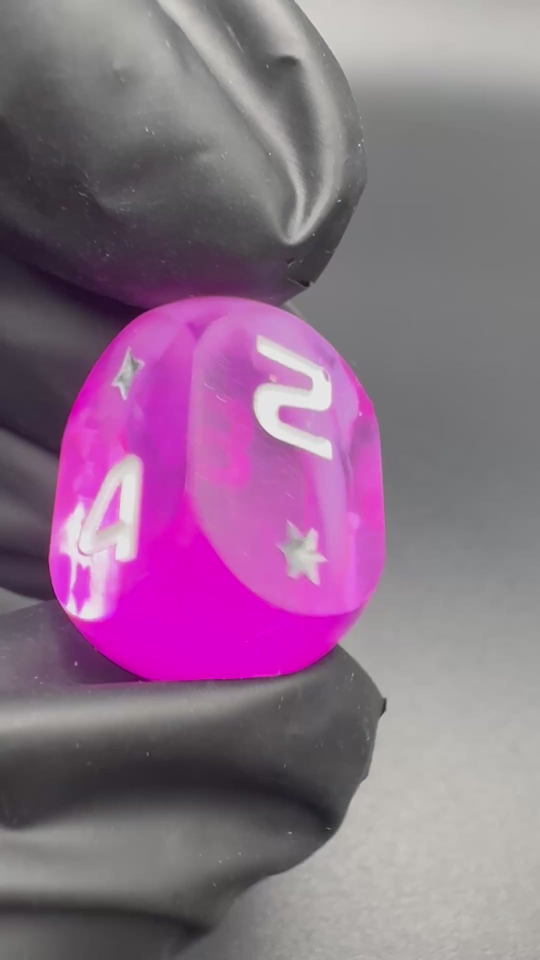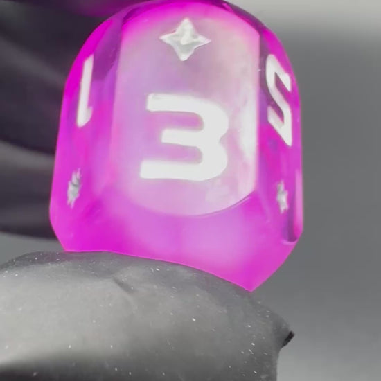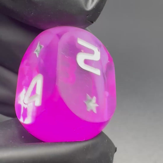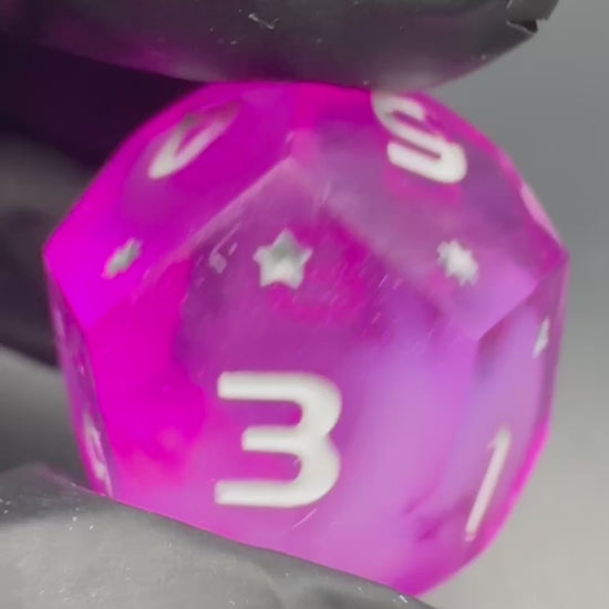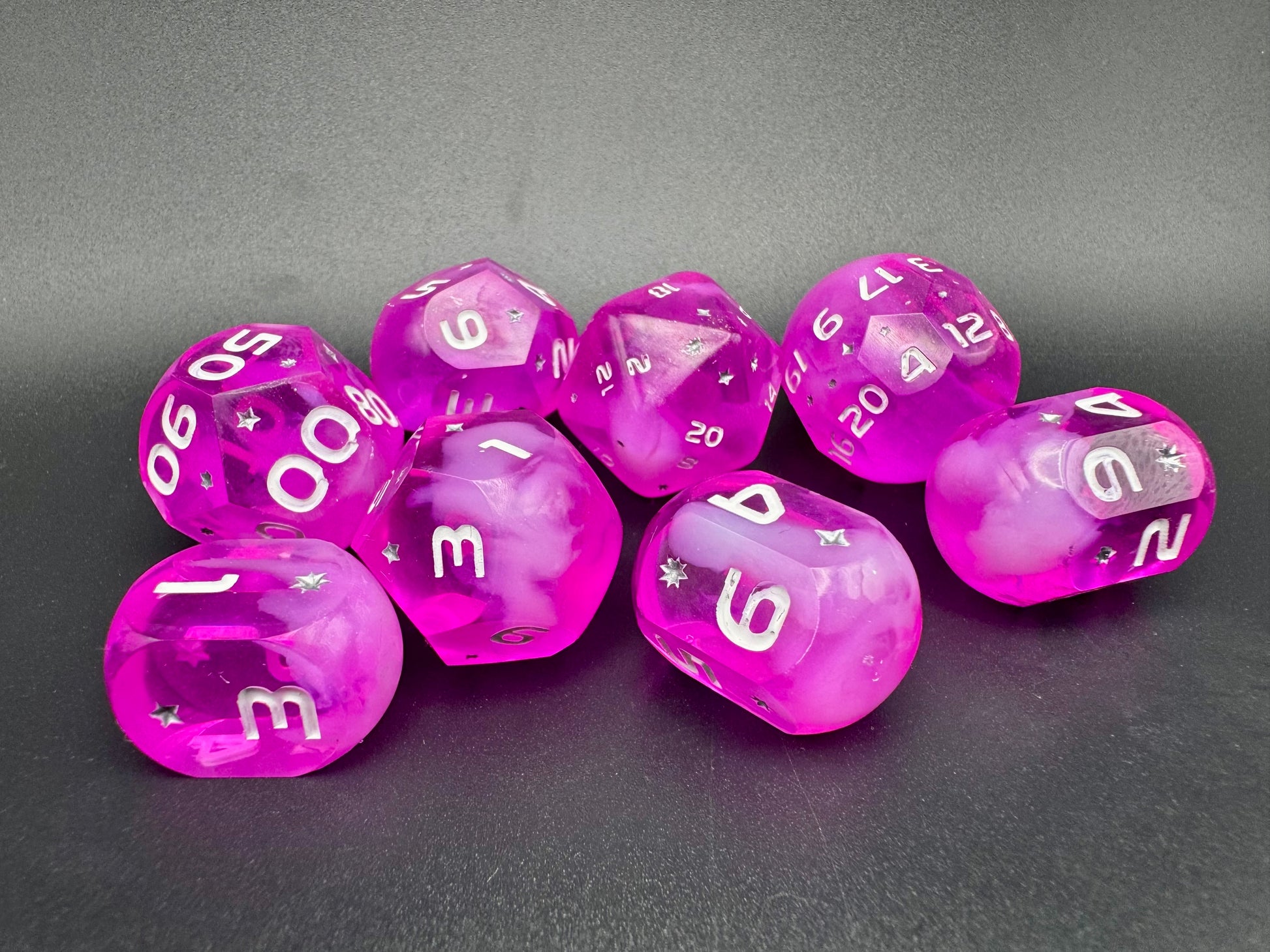 Bright pink orb style dice with wisps of white clouds and fine pink-gold shimmer. Numbers inked in white with star detailing in chrome silver.