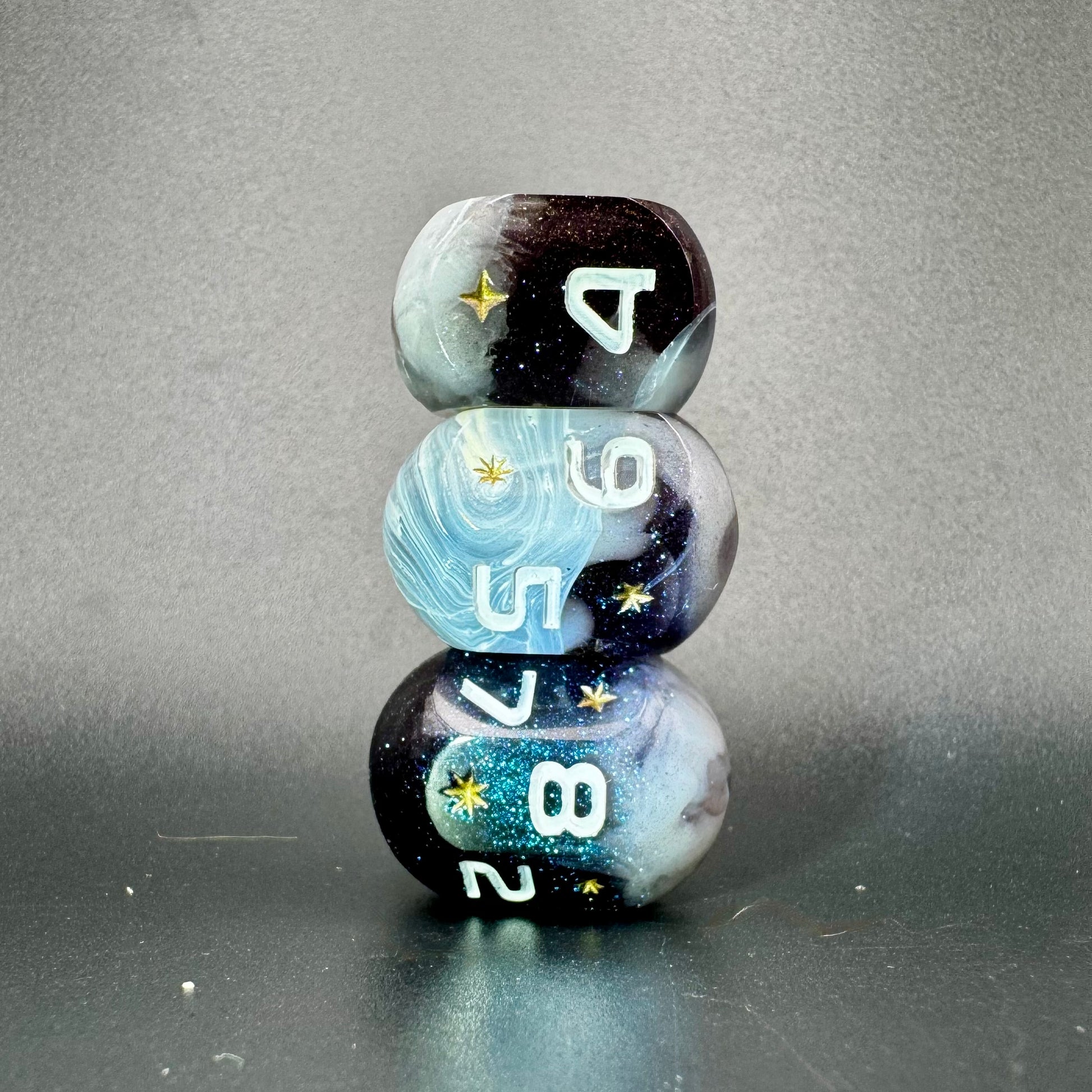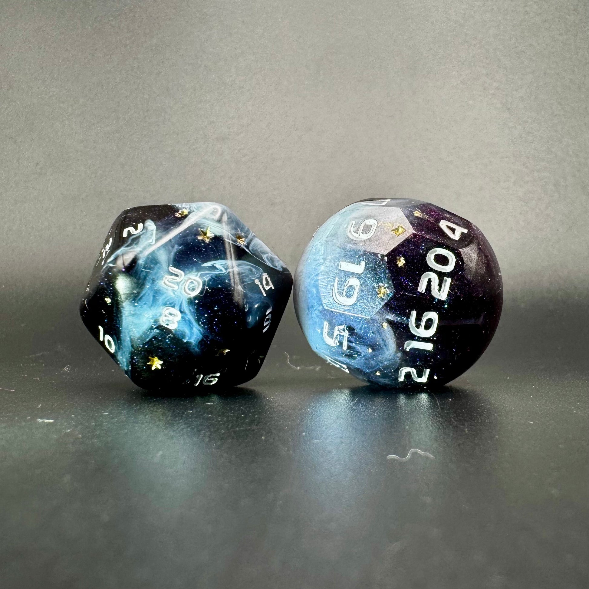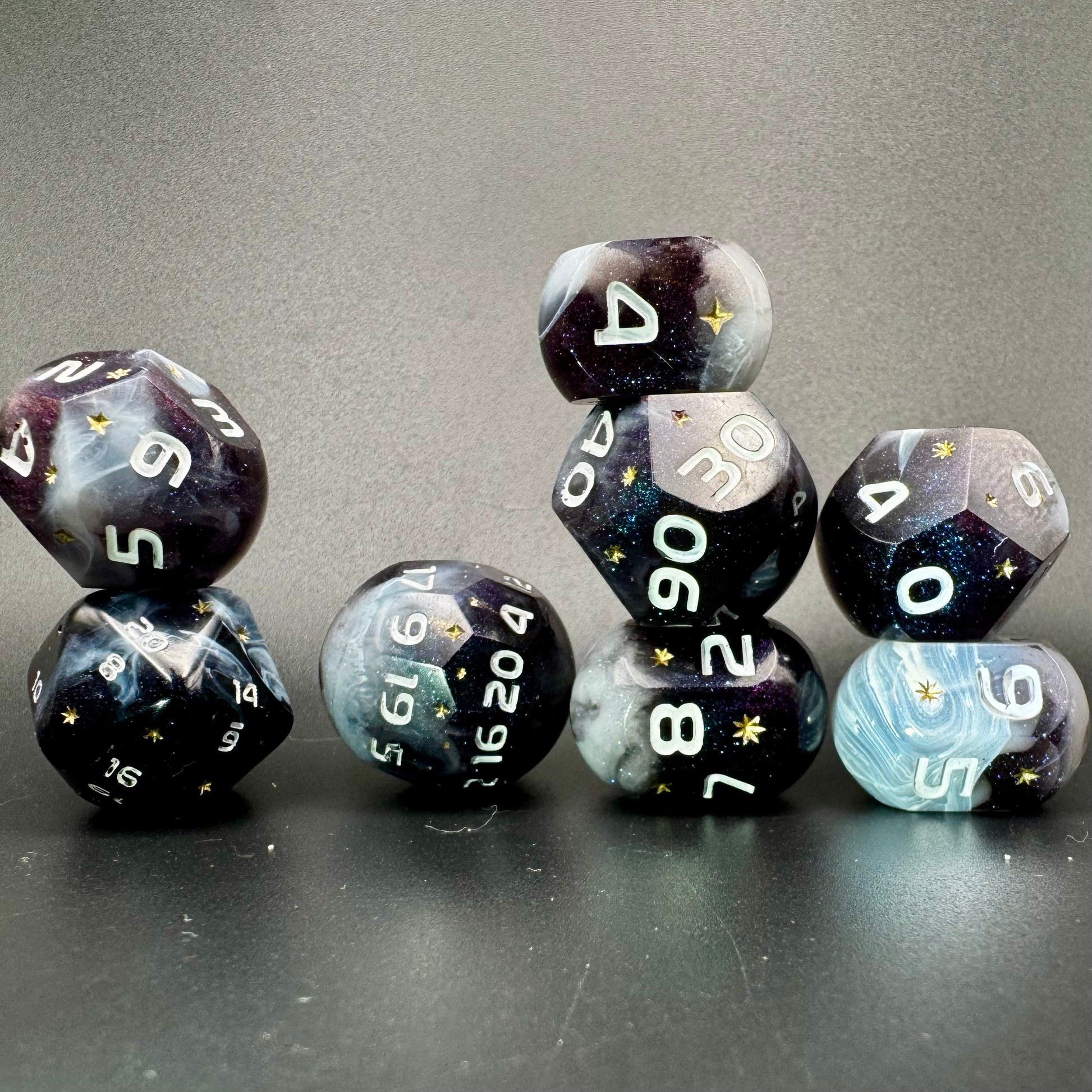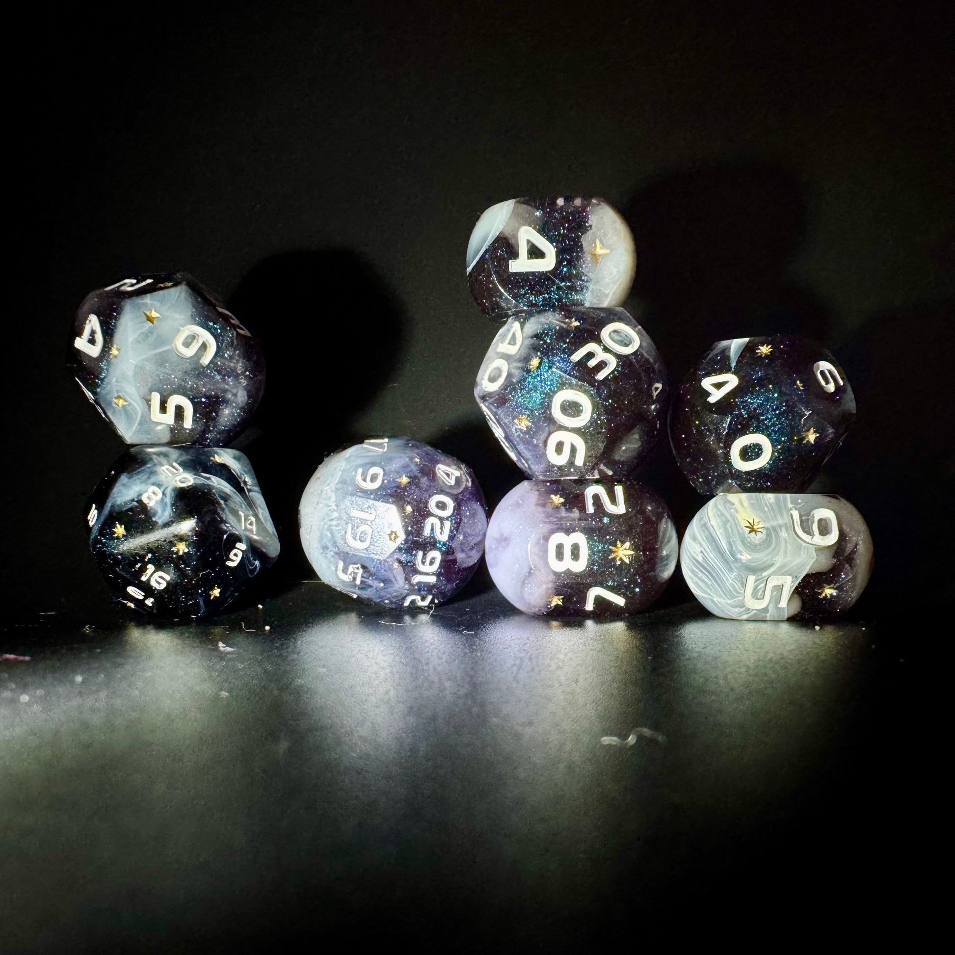 Marbled cloud white and iridescent blue-black-purple orb style dice. Numbers inked in white with star detailing in metallic gold.