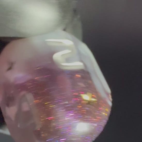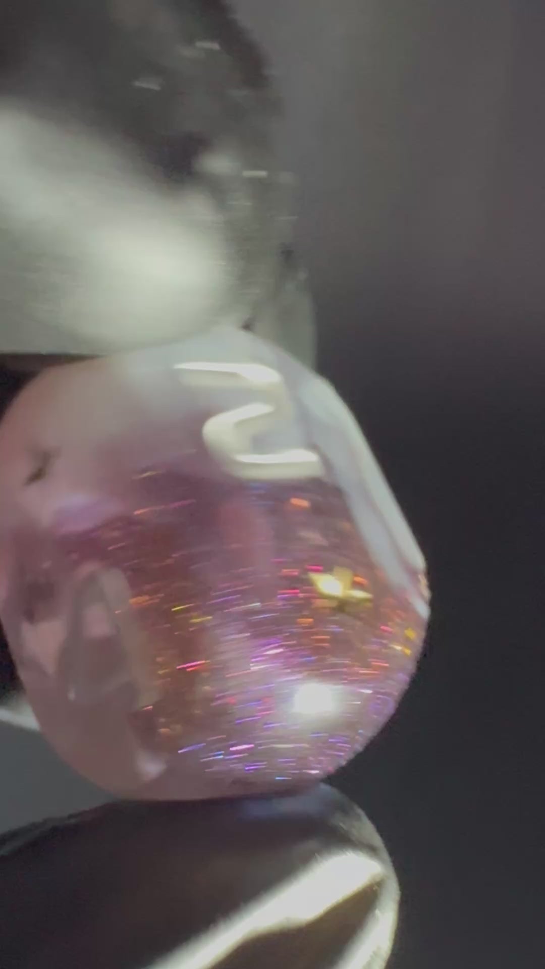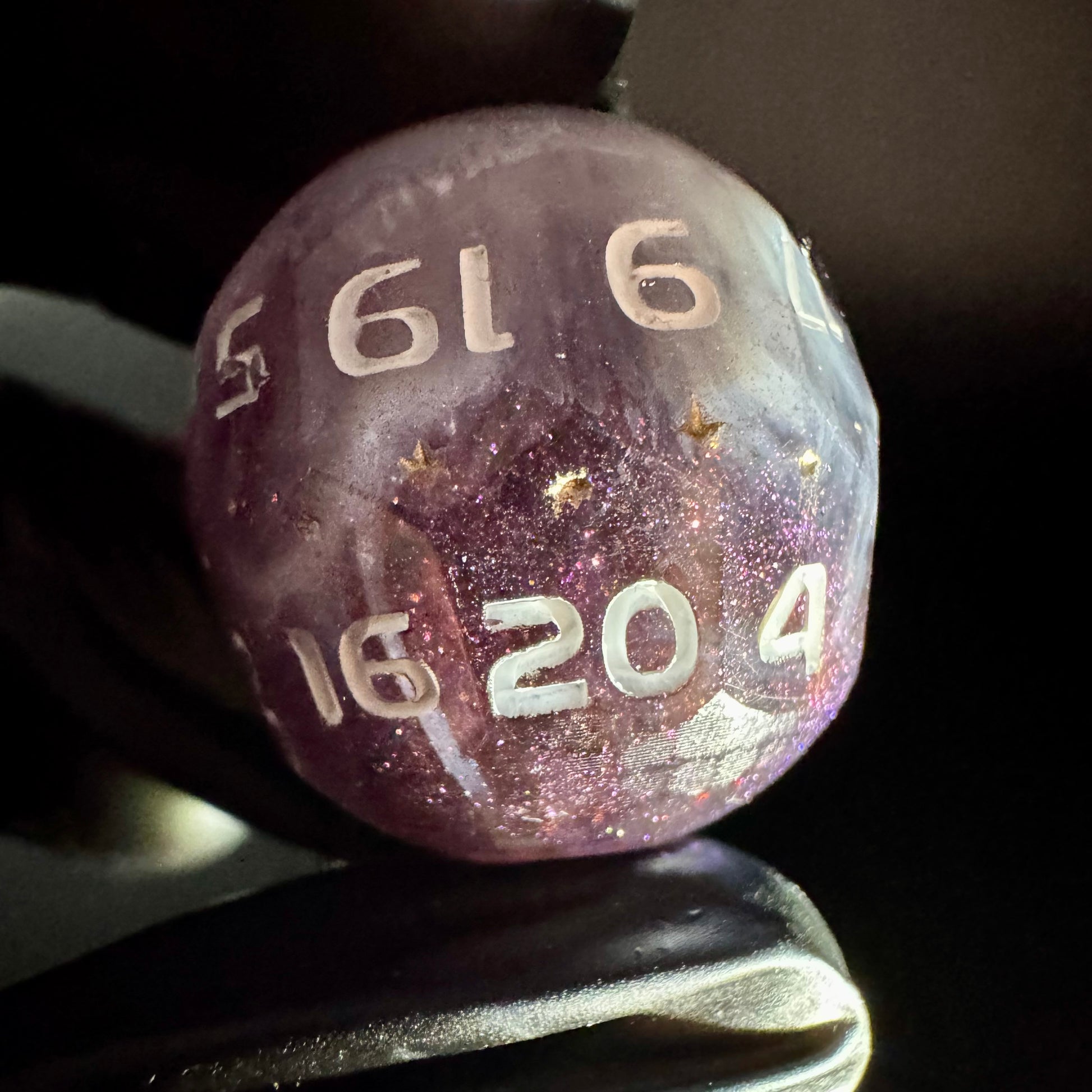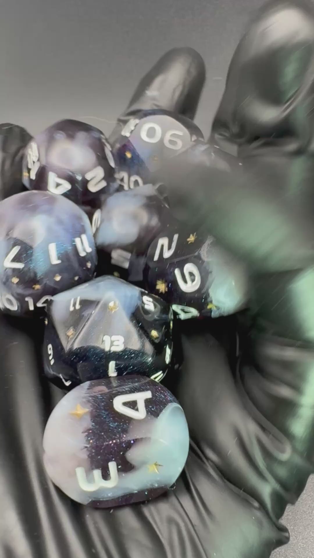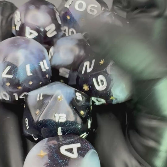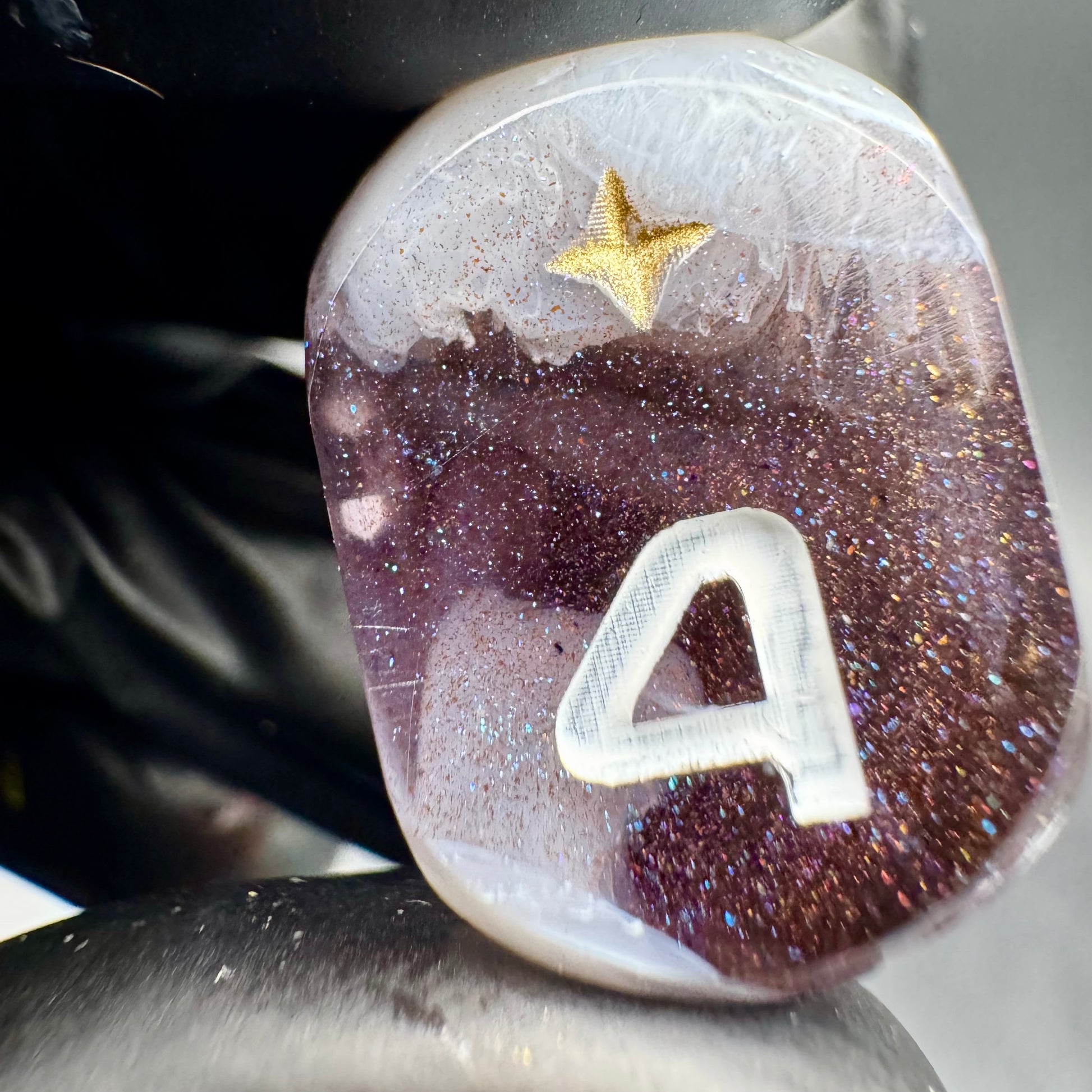 Marbled cloud white and iridescent blue-black-purple orb style dice. Numbers inked in white with star detailing in metallic gold.
