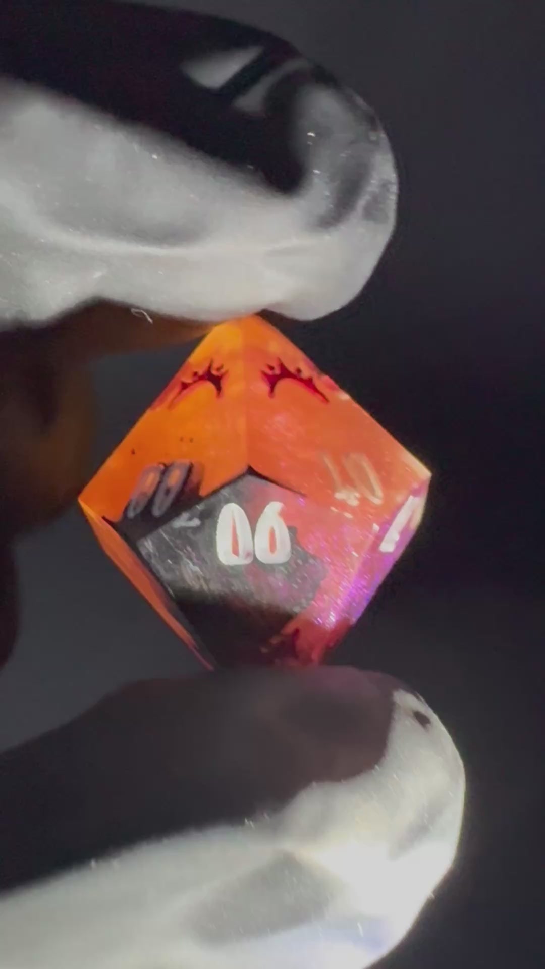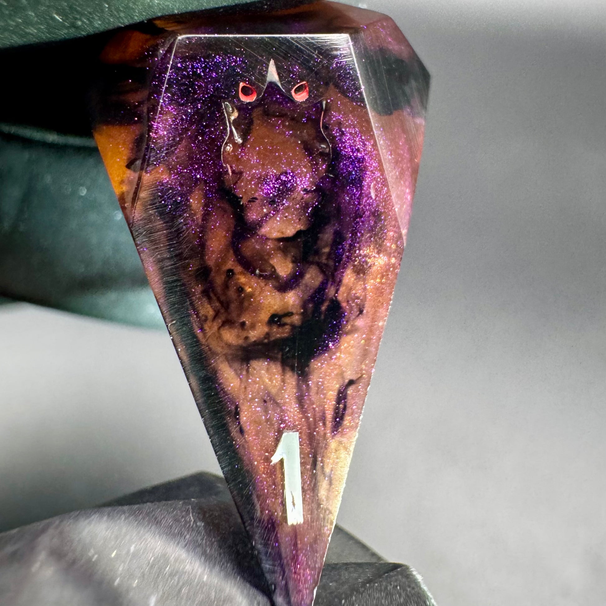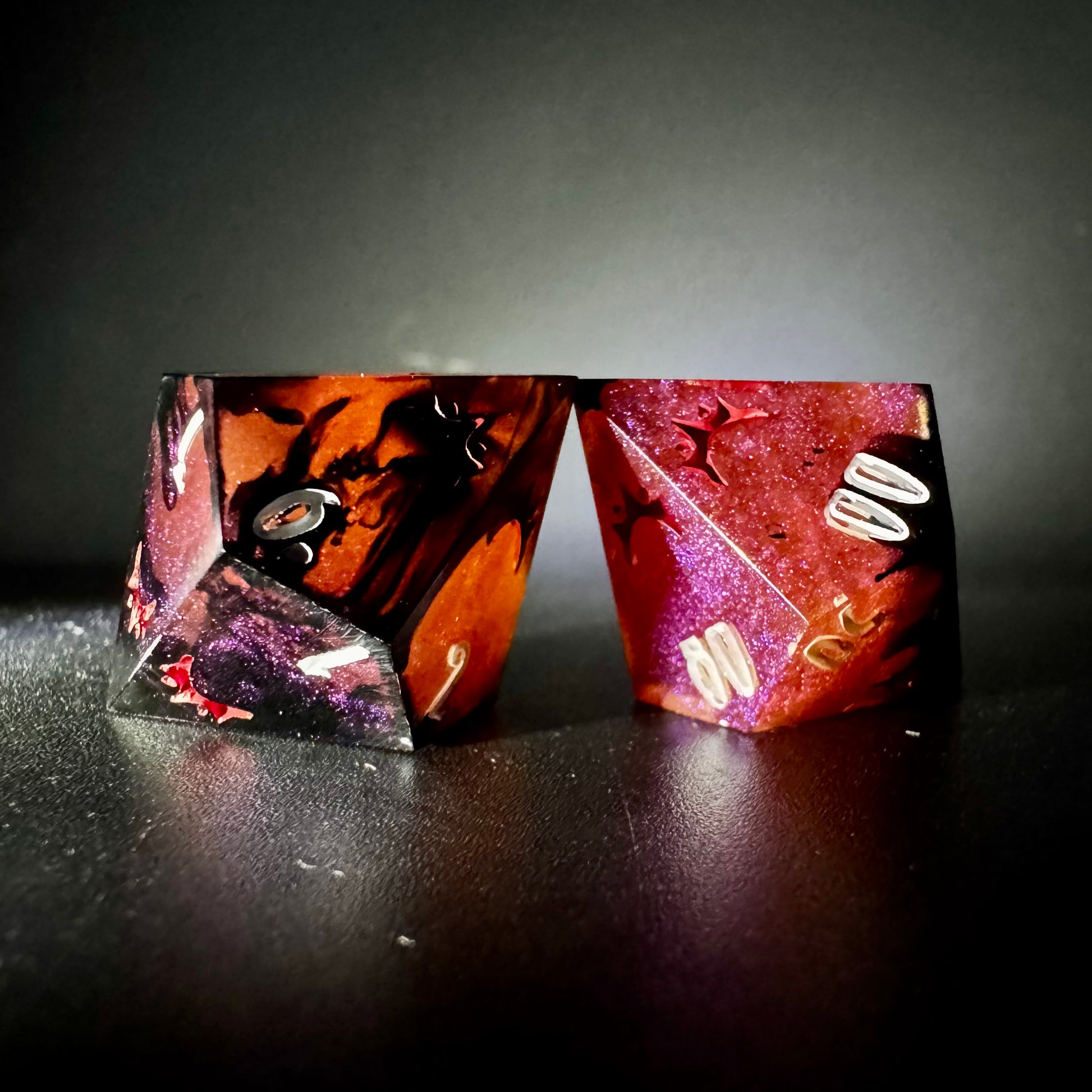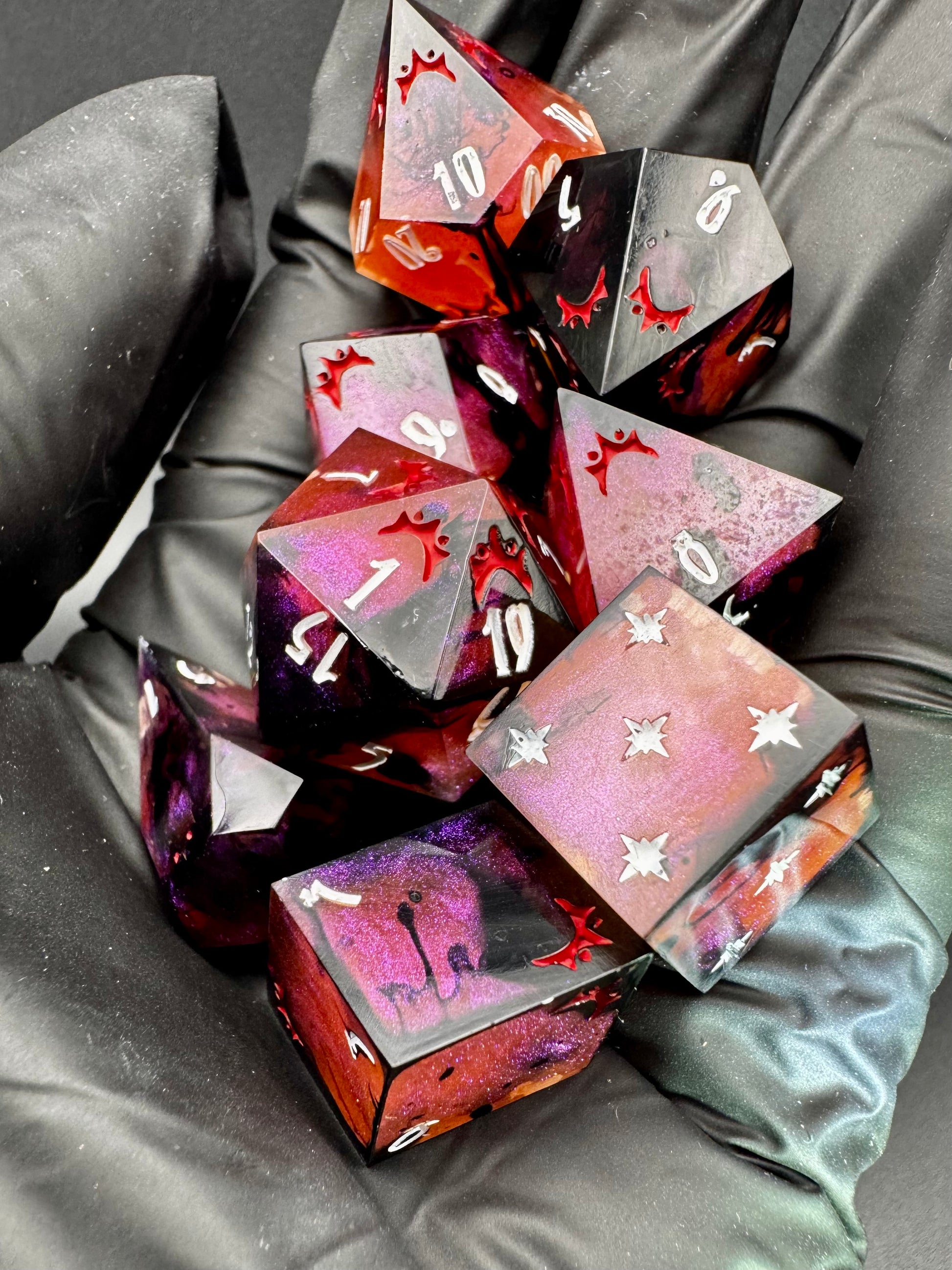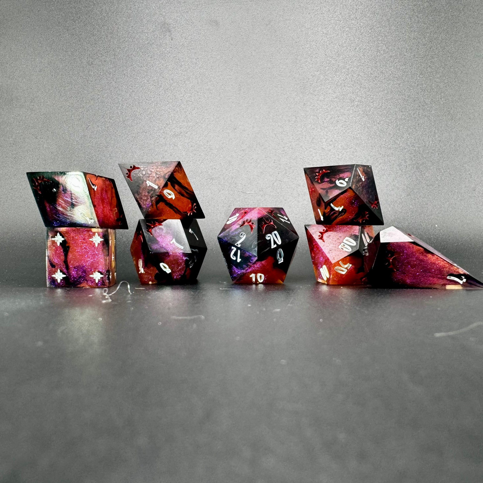 Intricate eight piece set in colour shifting magenta-purple-red with creeping black tendrils. Numbers inked in bright matte white with crown detailing in blood red.