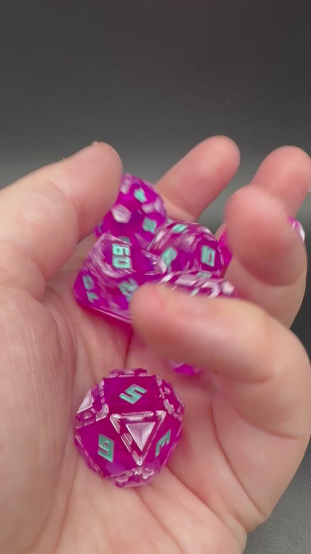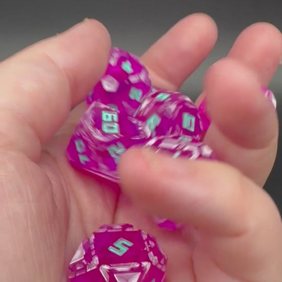 7 piece intricate sci fi dice set in neon pink resin. Detailed inked in white with bright blue numbers.