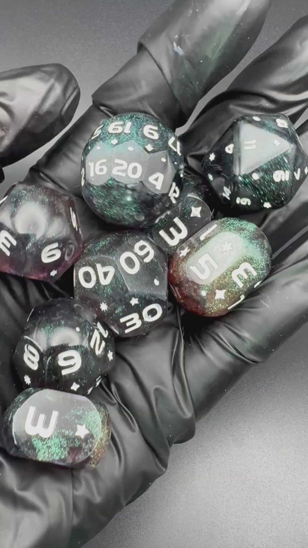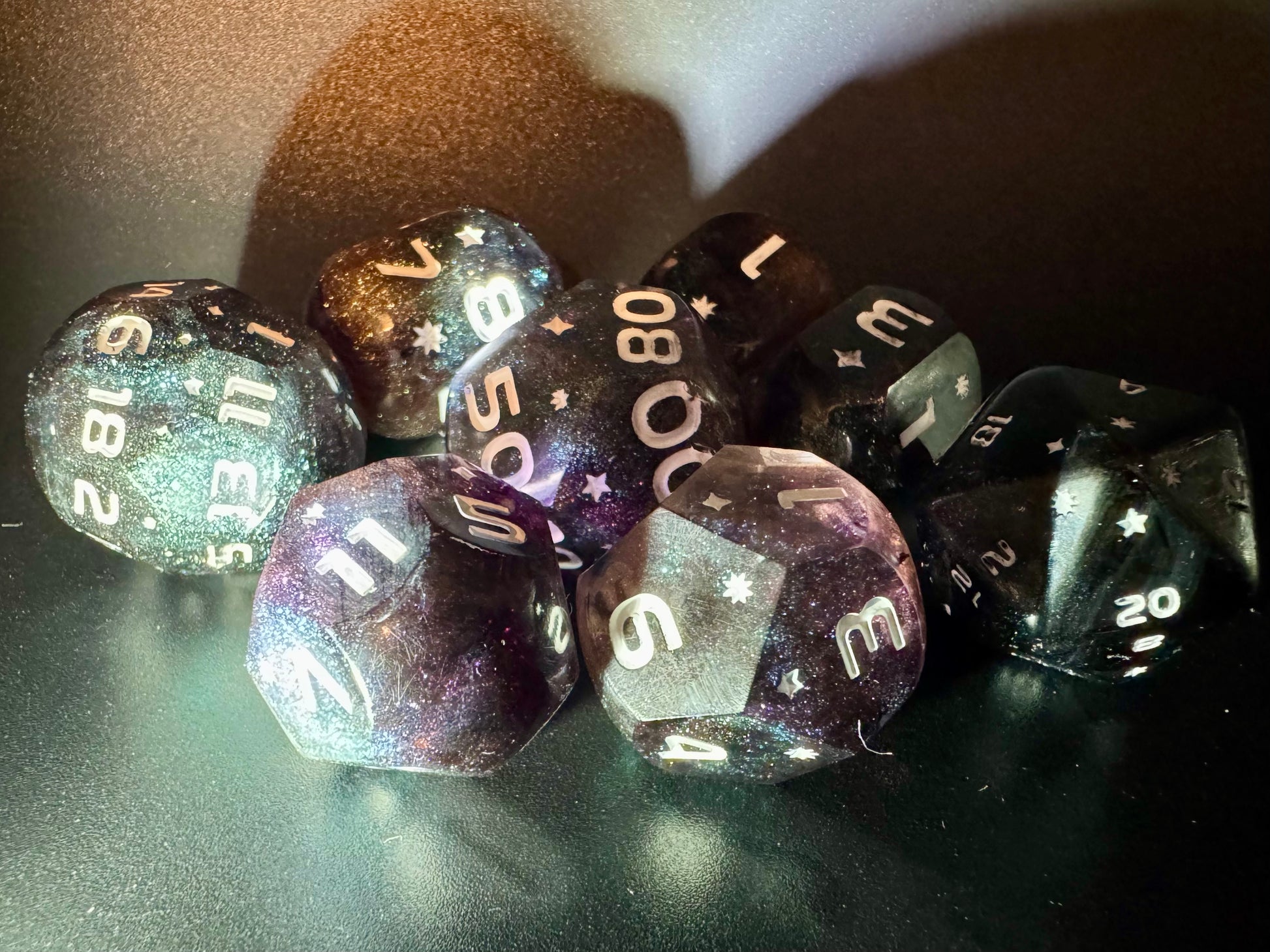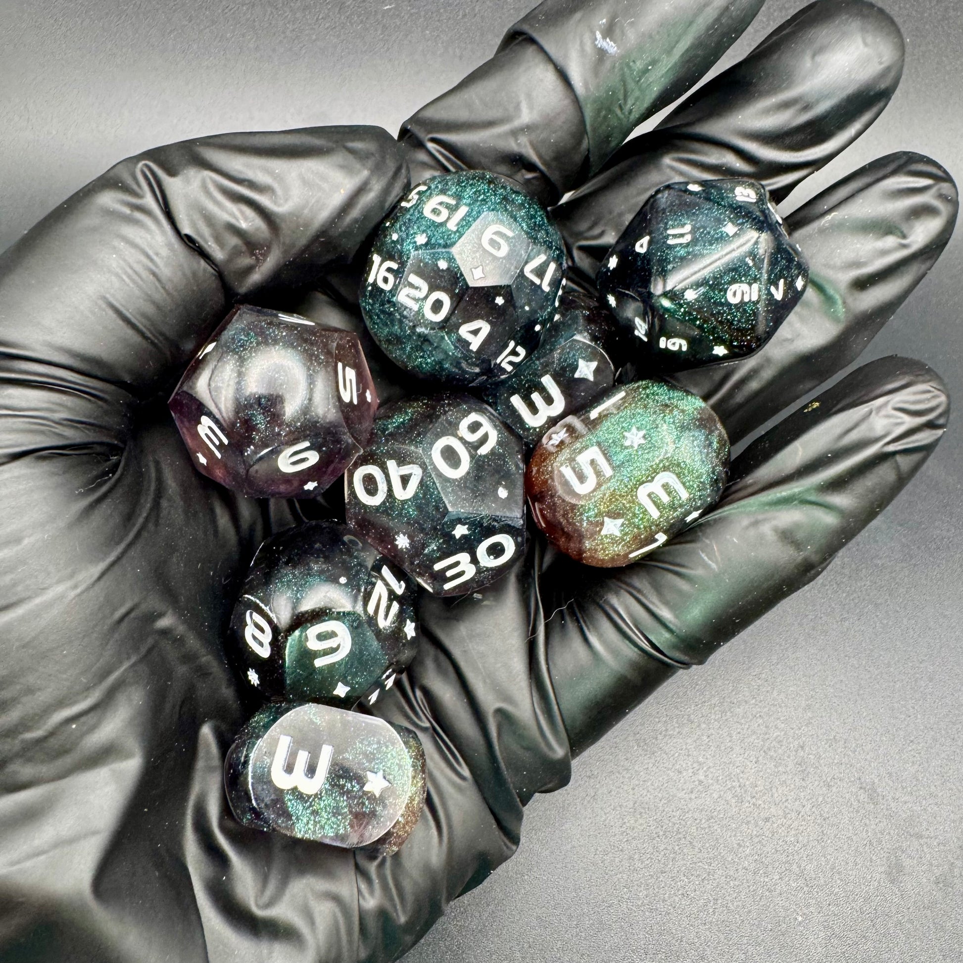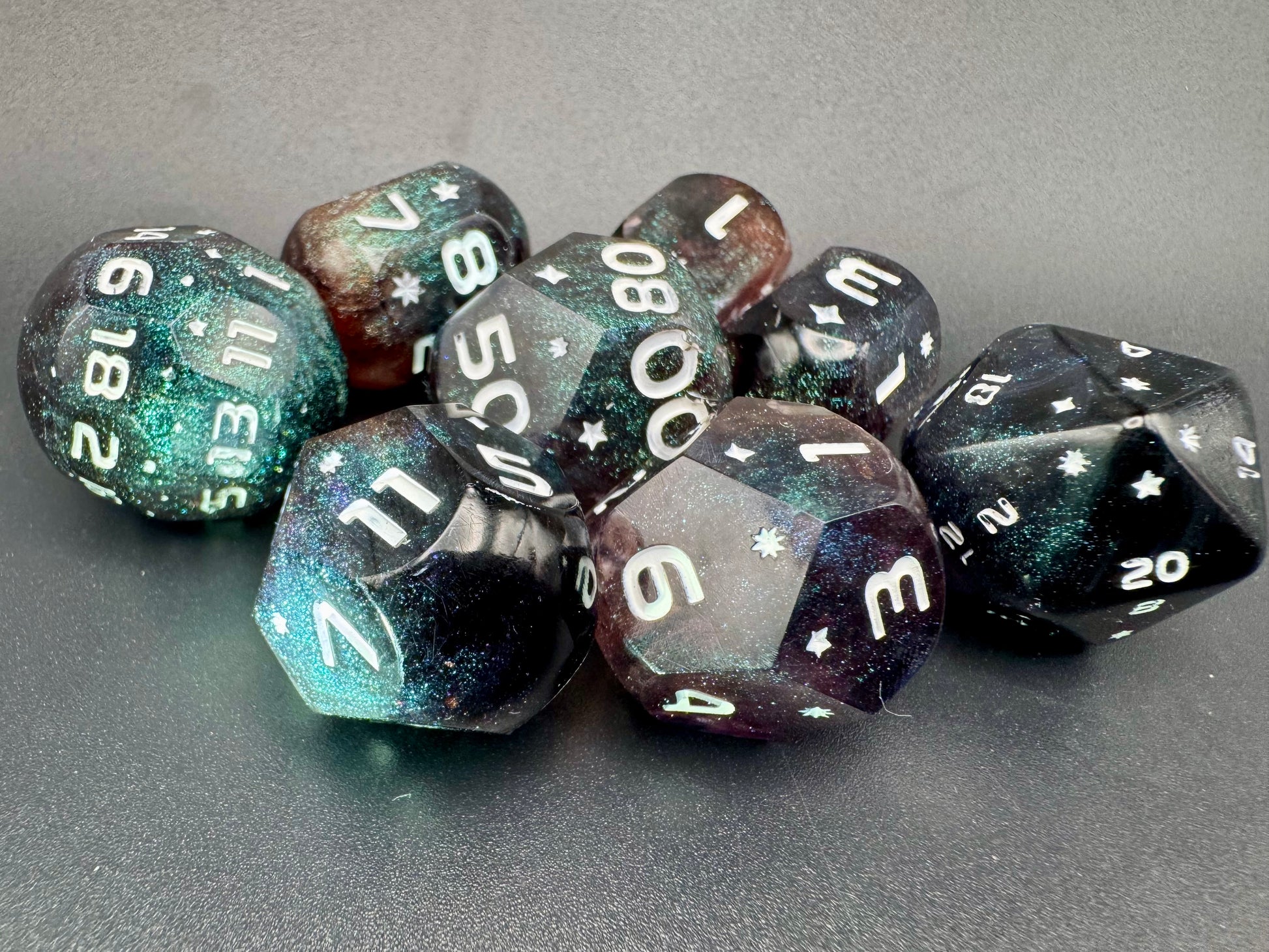8 piece star detailed orb style dice set in shimmering colourshift blue and black with hints of bronze. Inked in white.