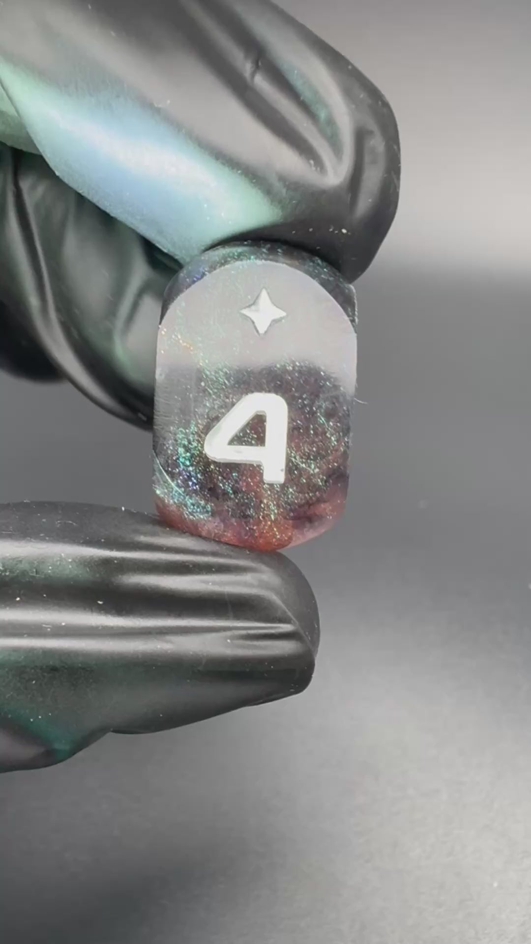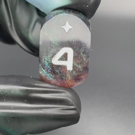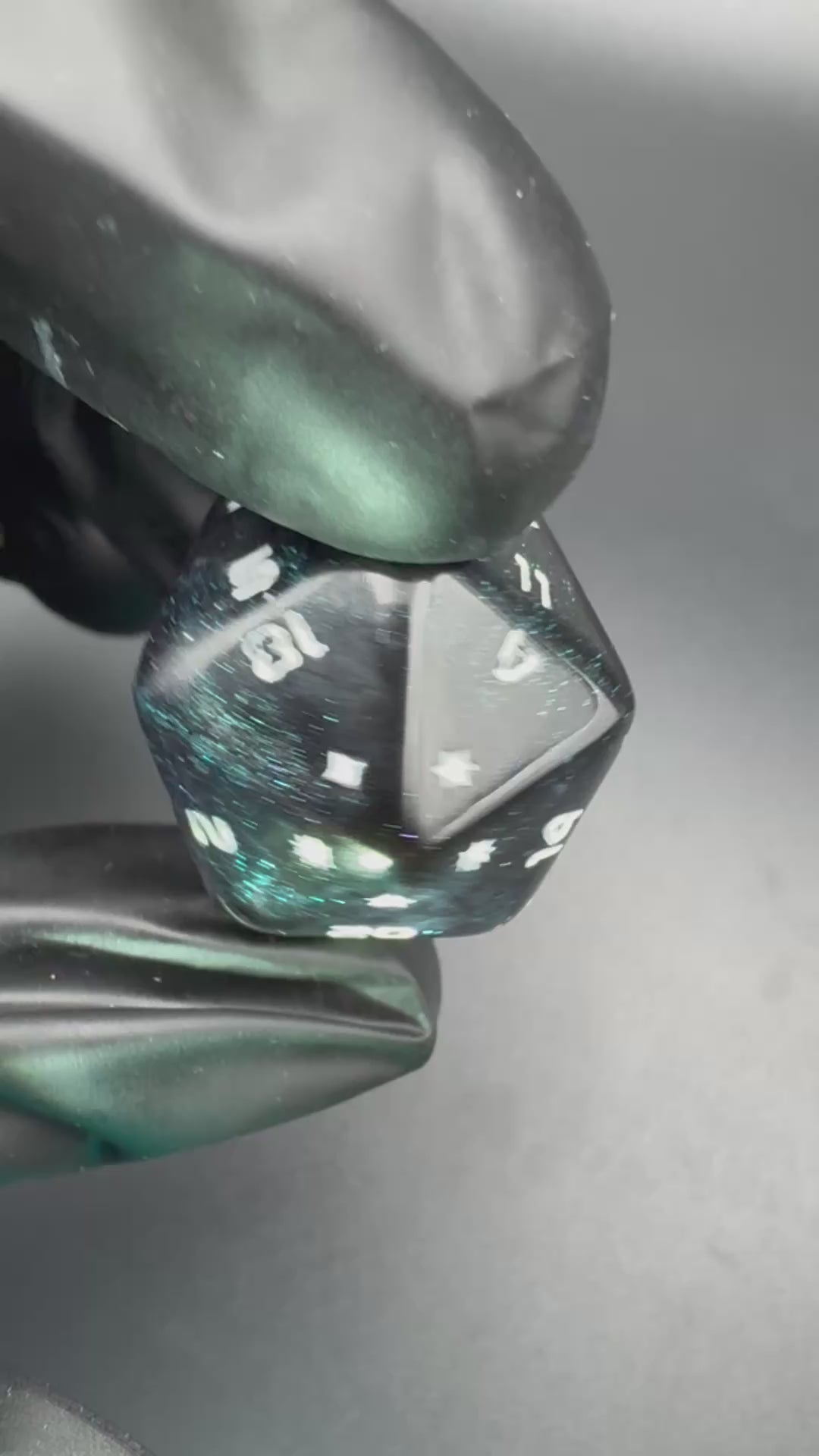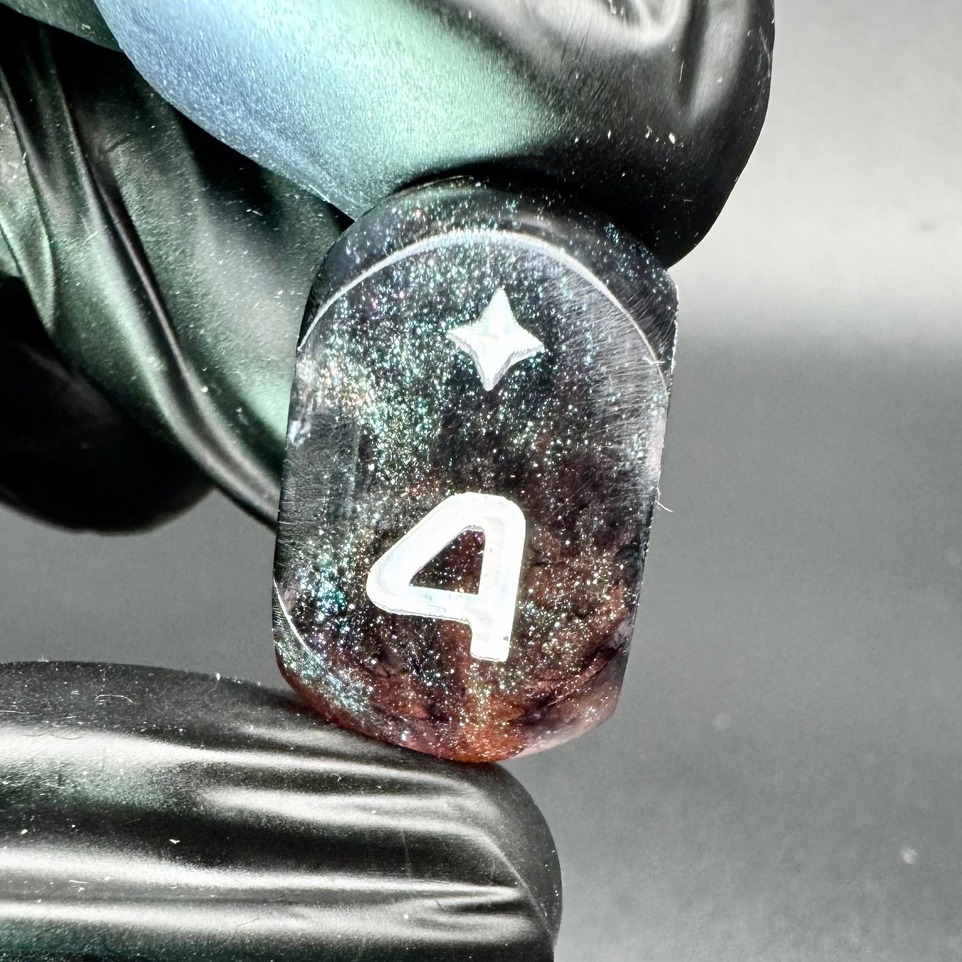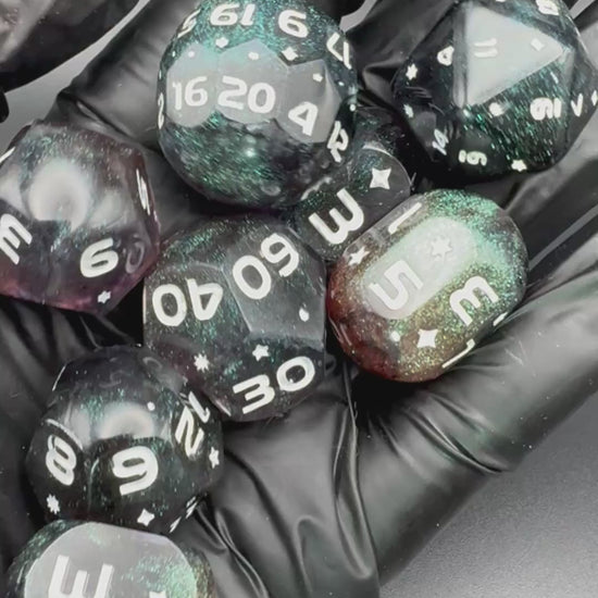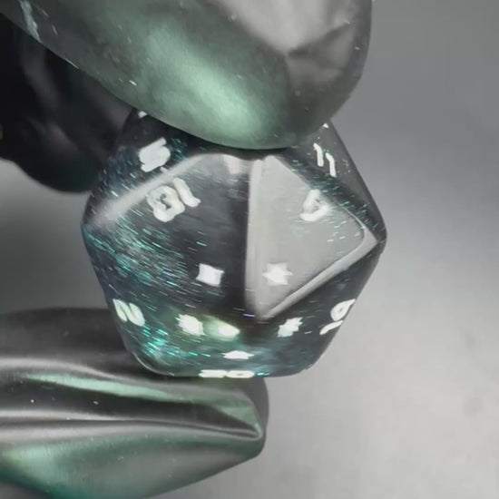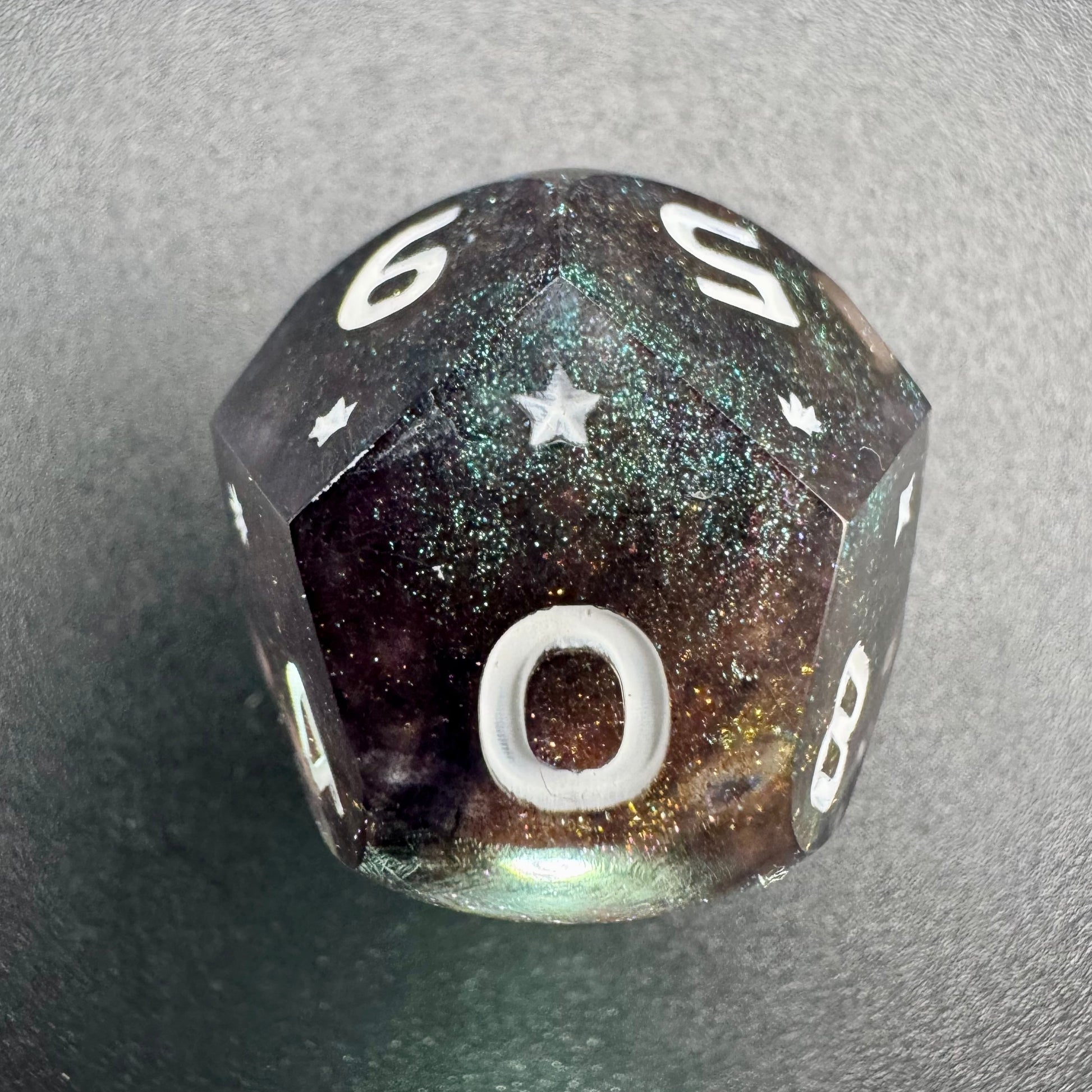 8 piece star detailed orb style dice set in shimmering colourshift blue and black with hints of bronze. Inked in white.