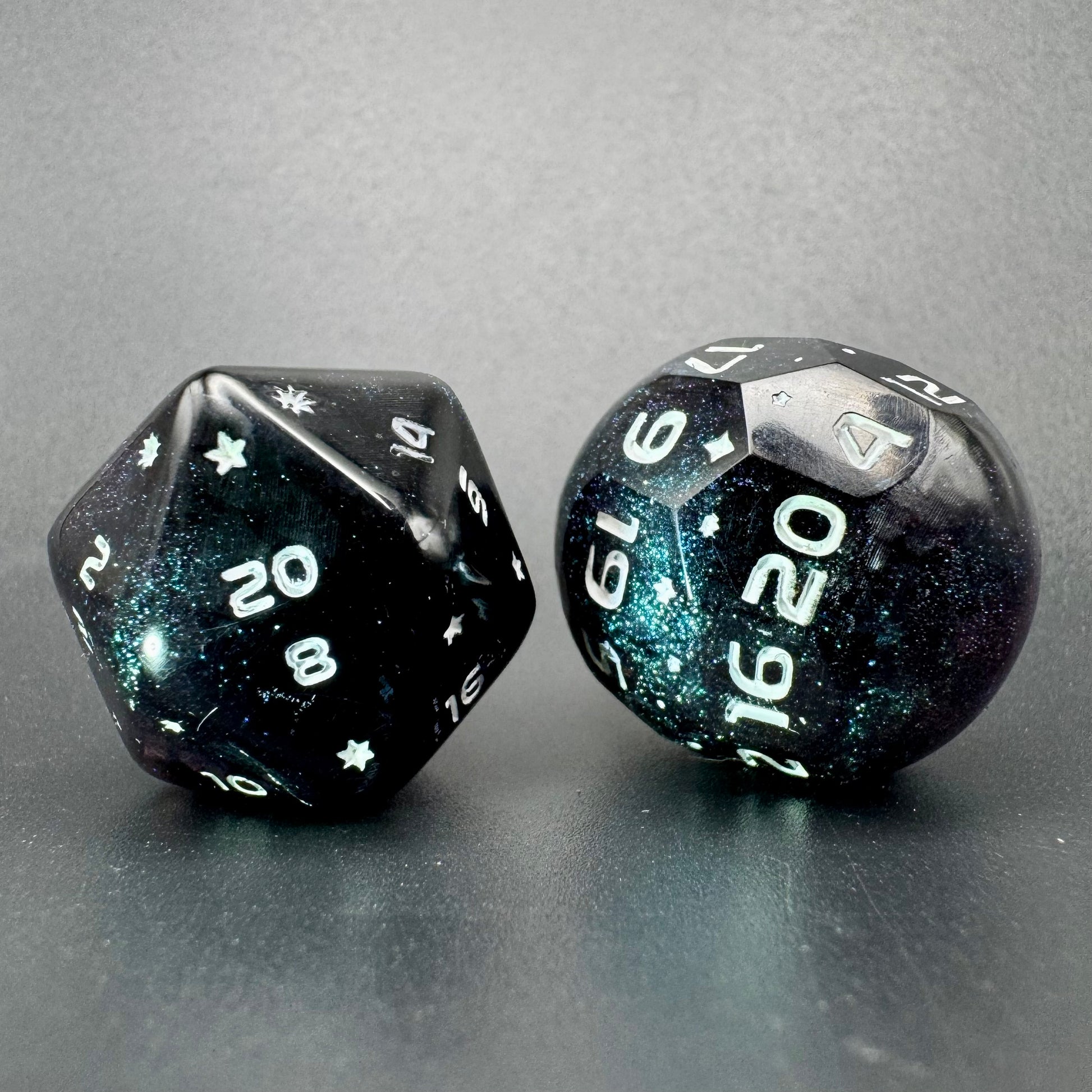 Note that this set includes 2 d20s: one orb style and one rounded standard d20.