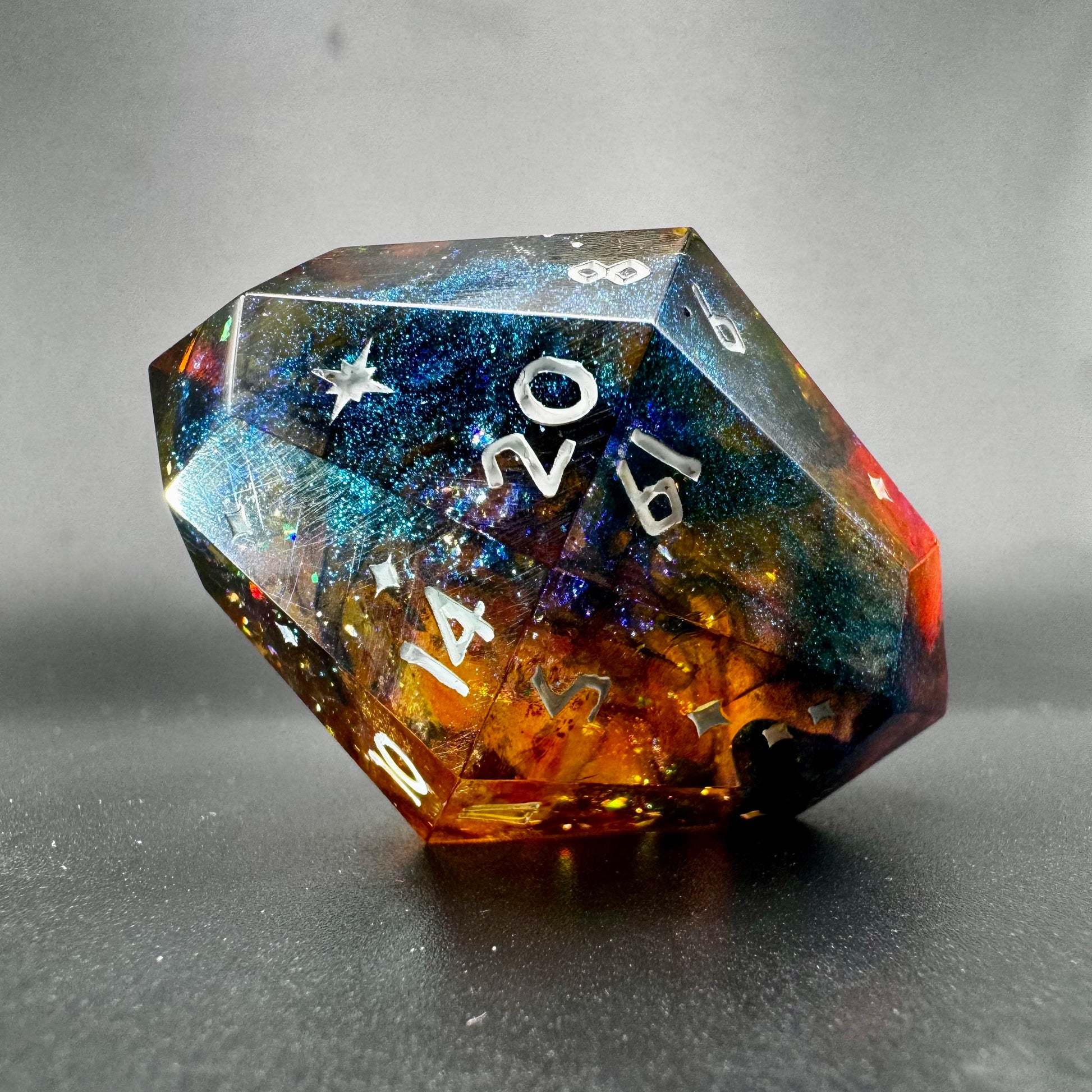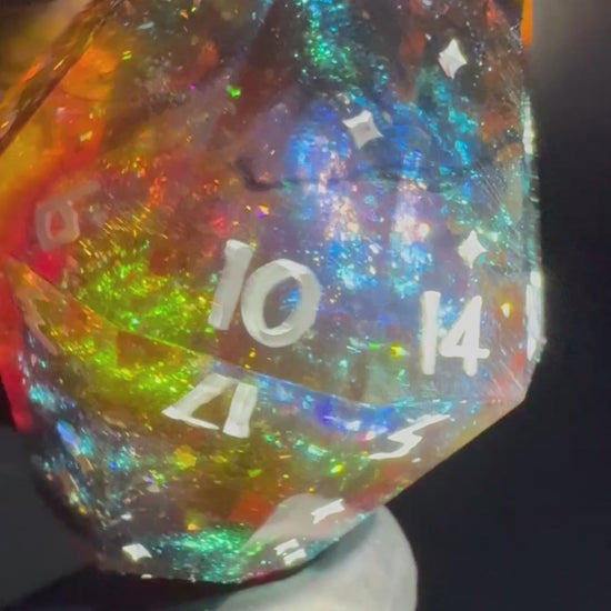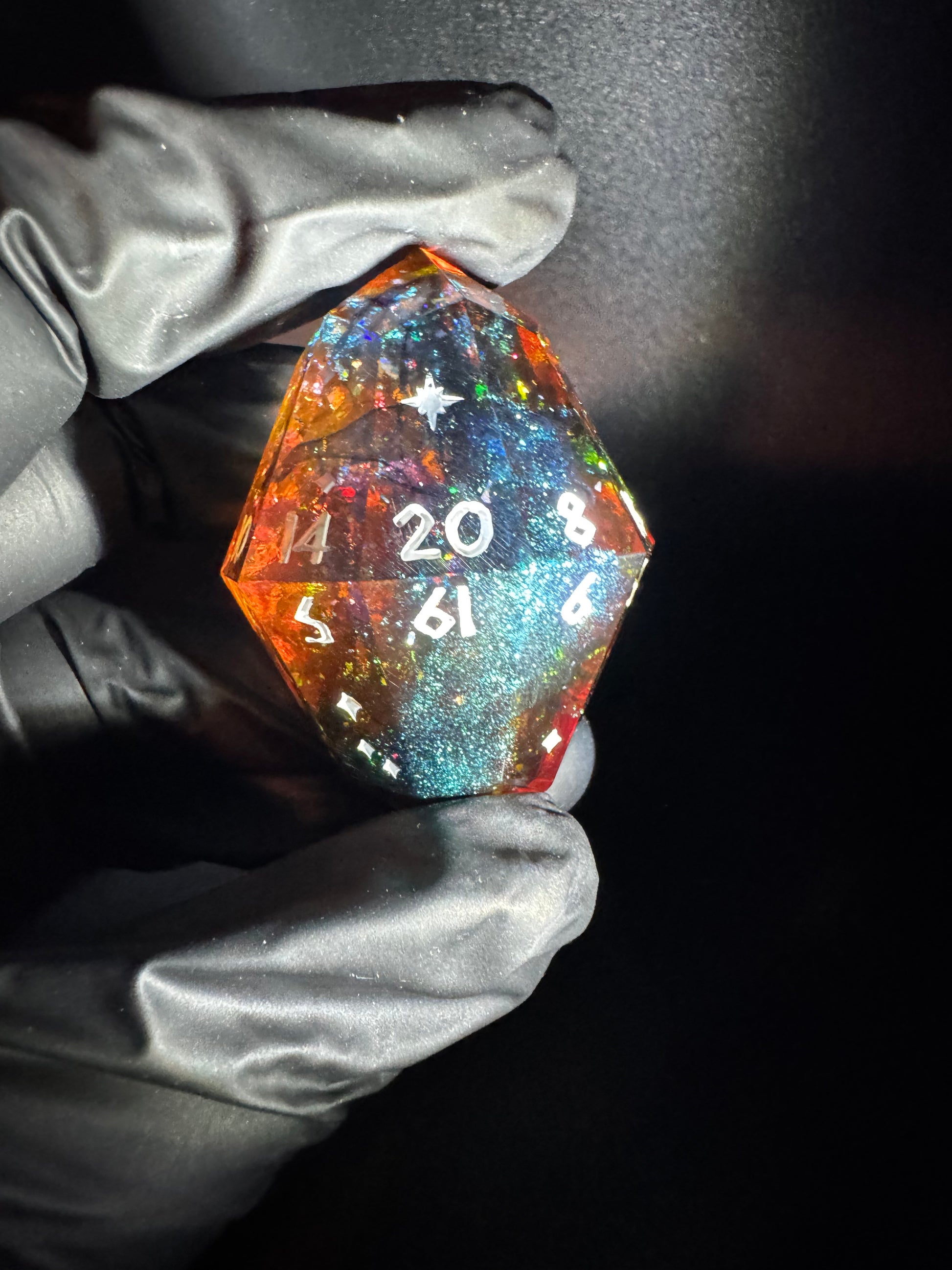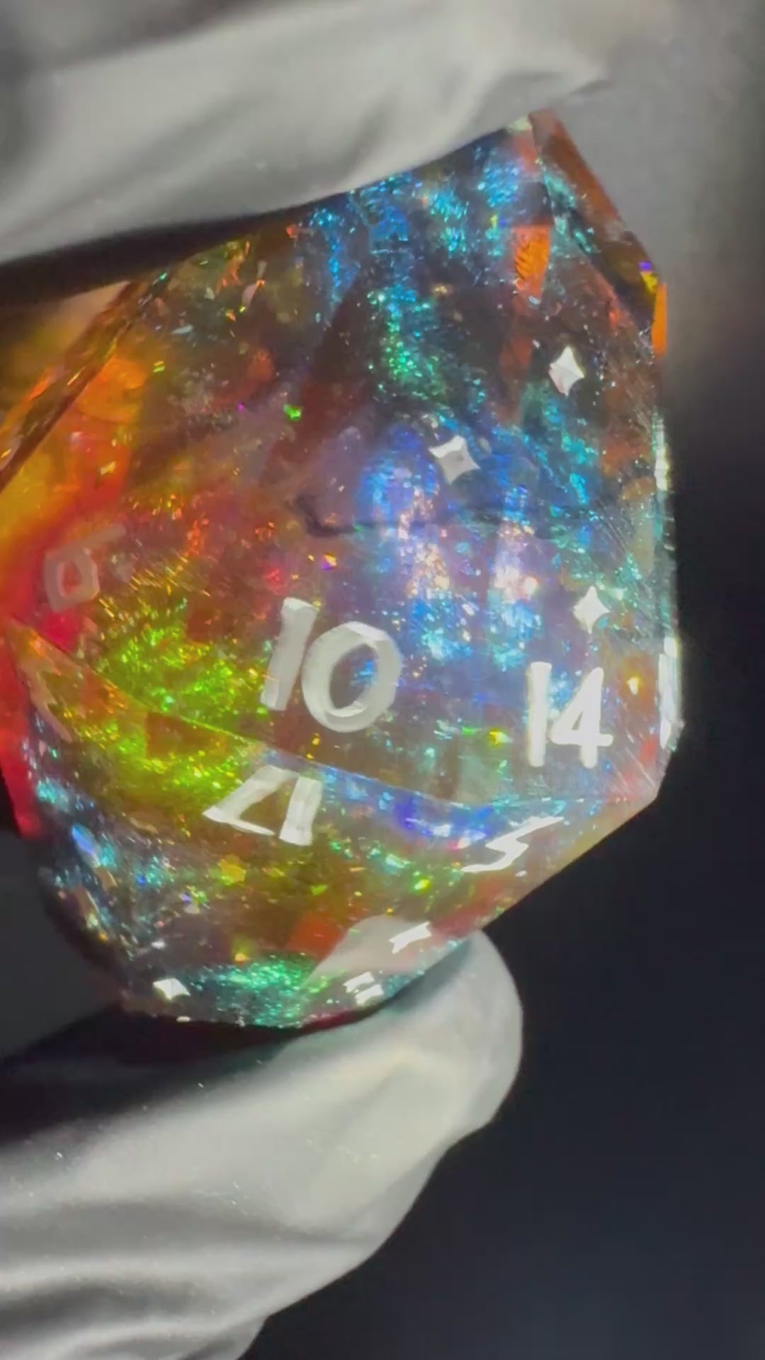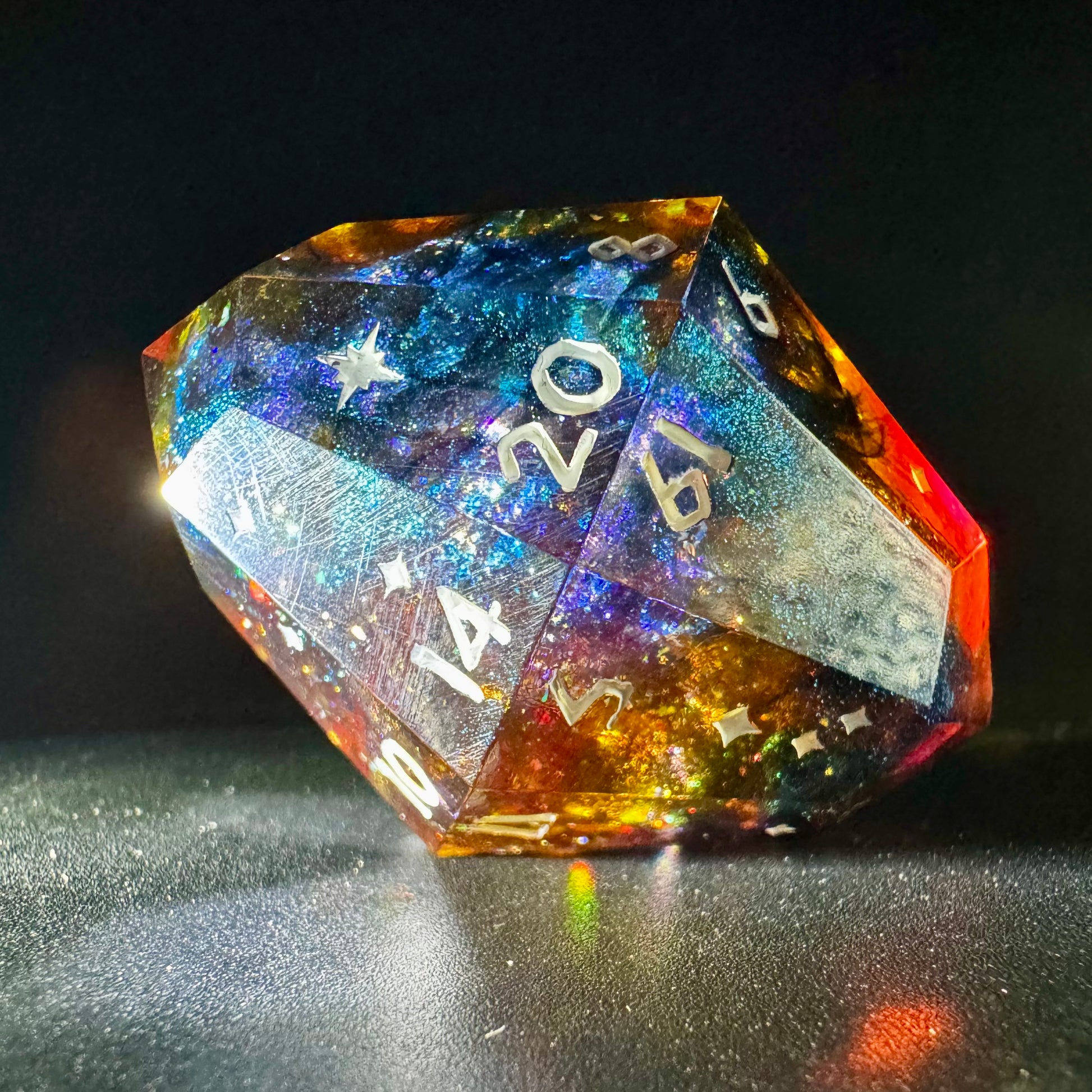 Crystal d20 in a mix of yellow, blue, green, red, and black, mixed with iridescent and colourshifting pigments. Inked in bright matte white.