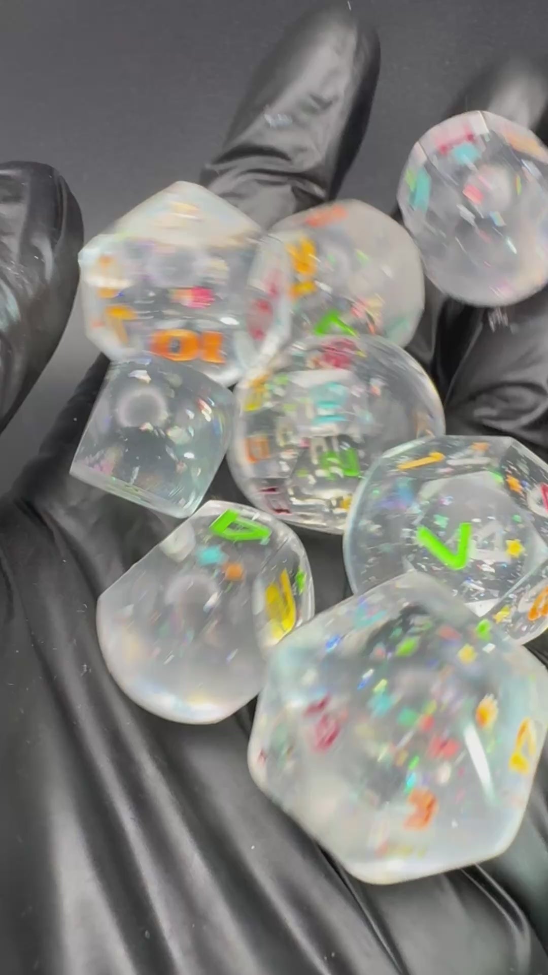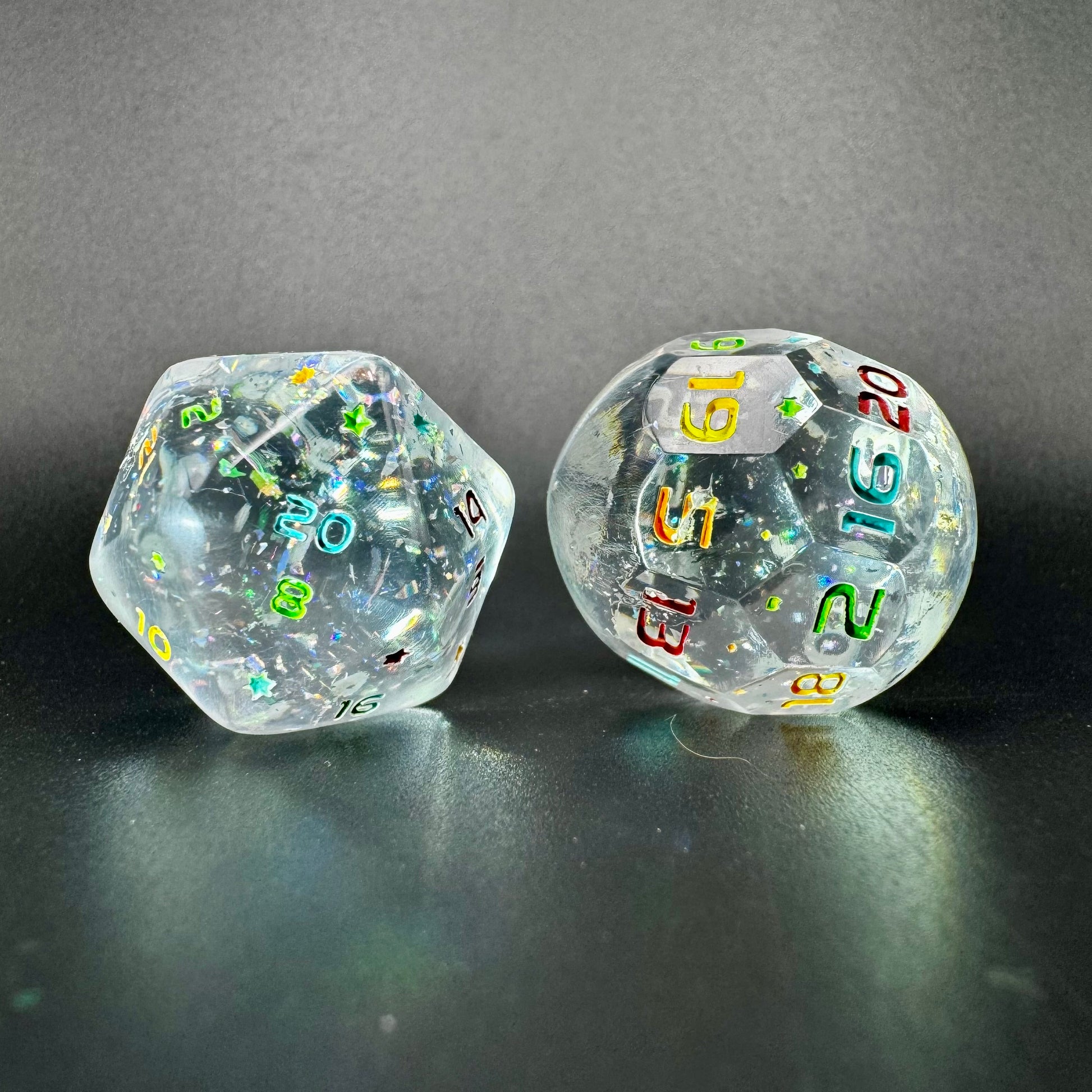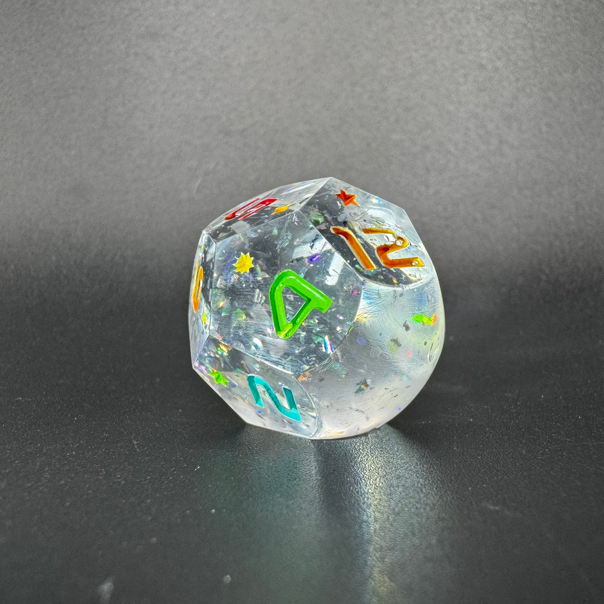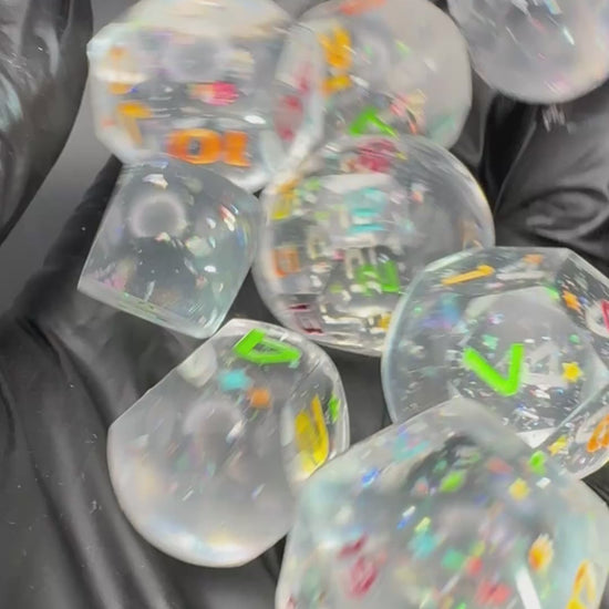 Crystal clear orb style dice with holographic flakes, inked in a rainbow of colours.