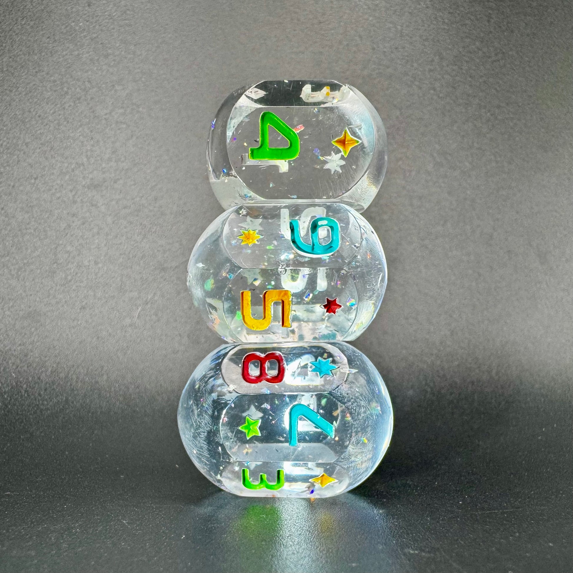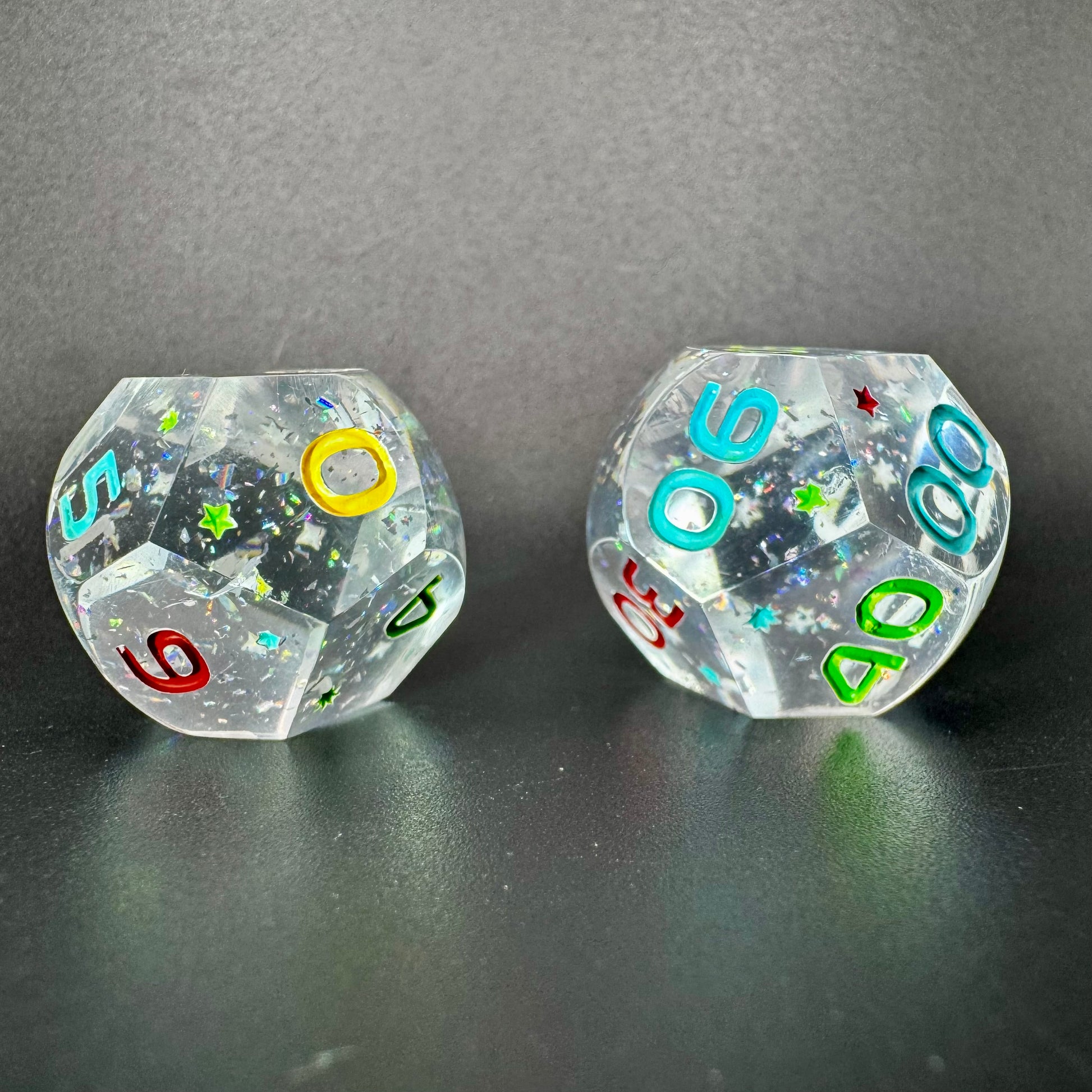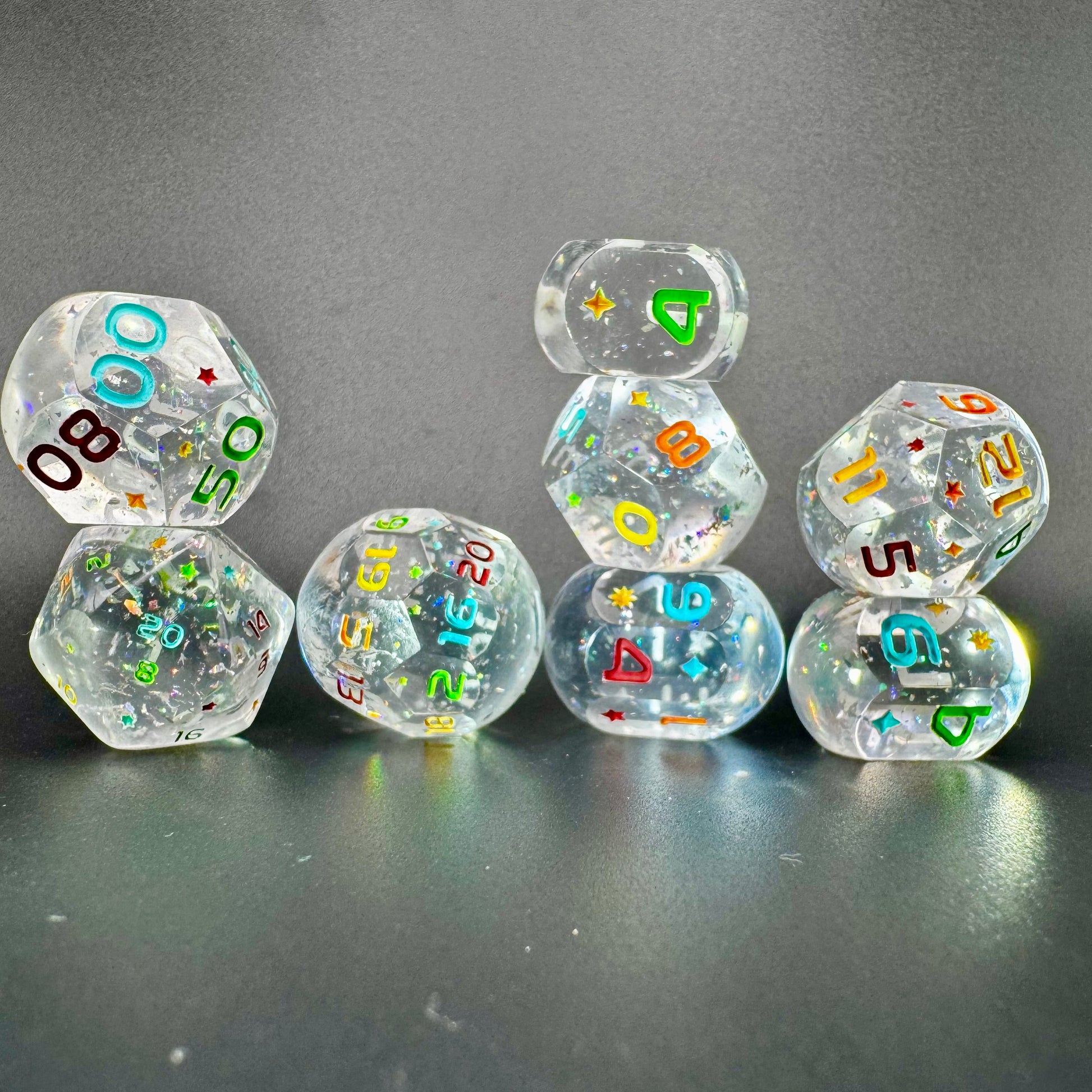 Crystal clear orb style dice with holographic flakes, inked in a rainbow of colours.