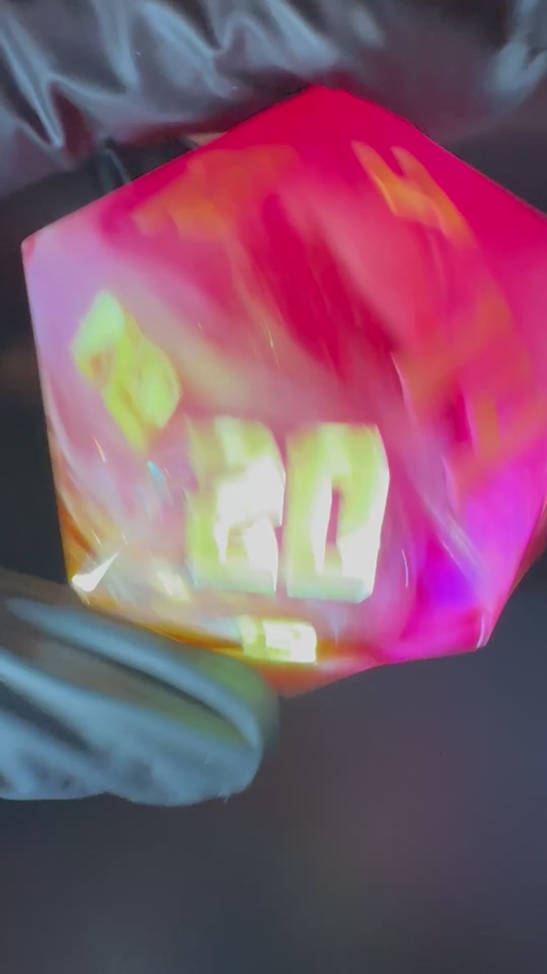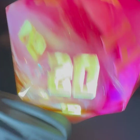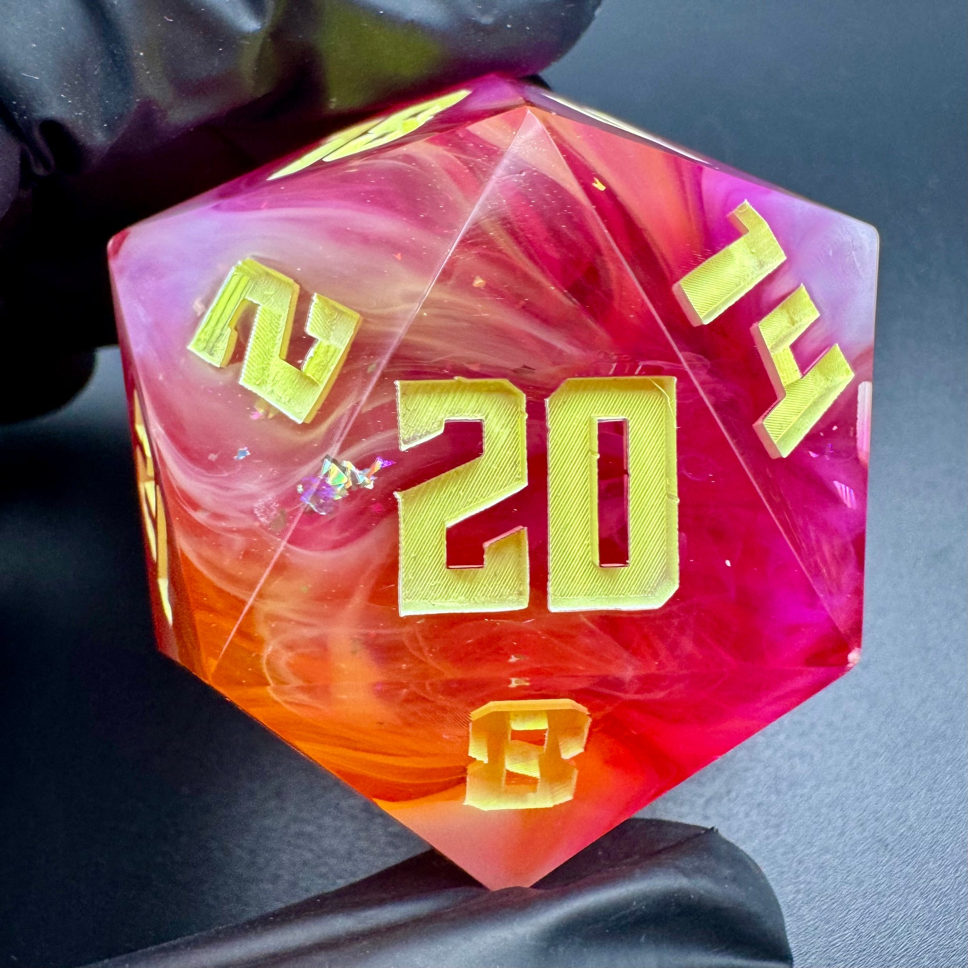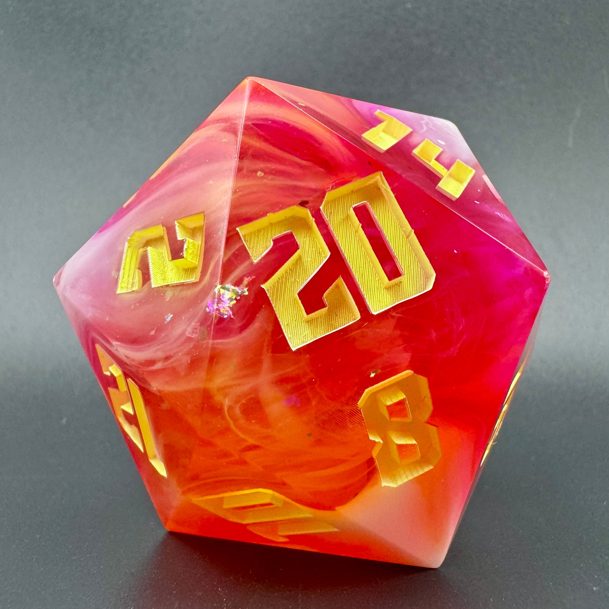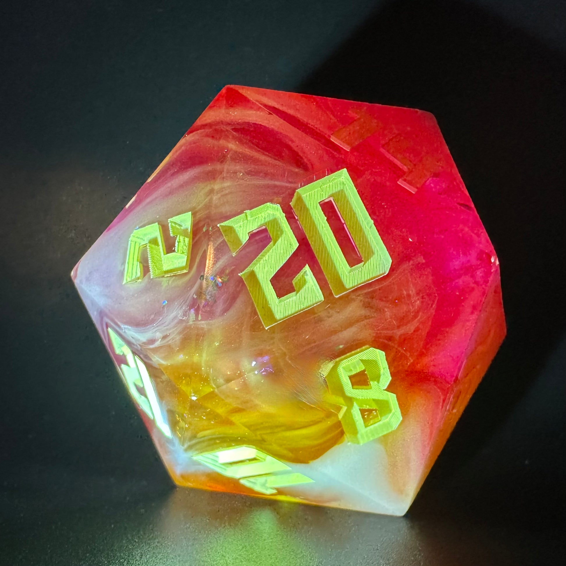 Huge 50mm d20 in shades of bright pink, orange, yellow, and white, with glitter and a few holographic flakes. Inked in fluorescent yellow.