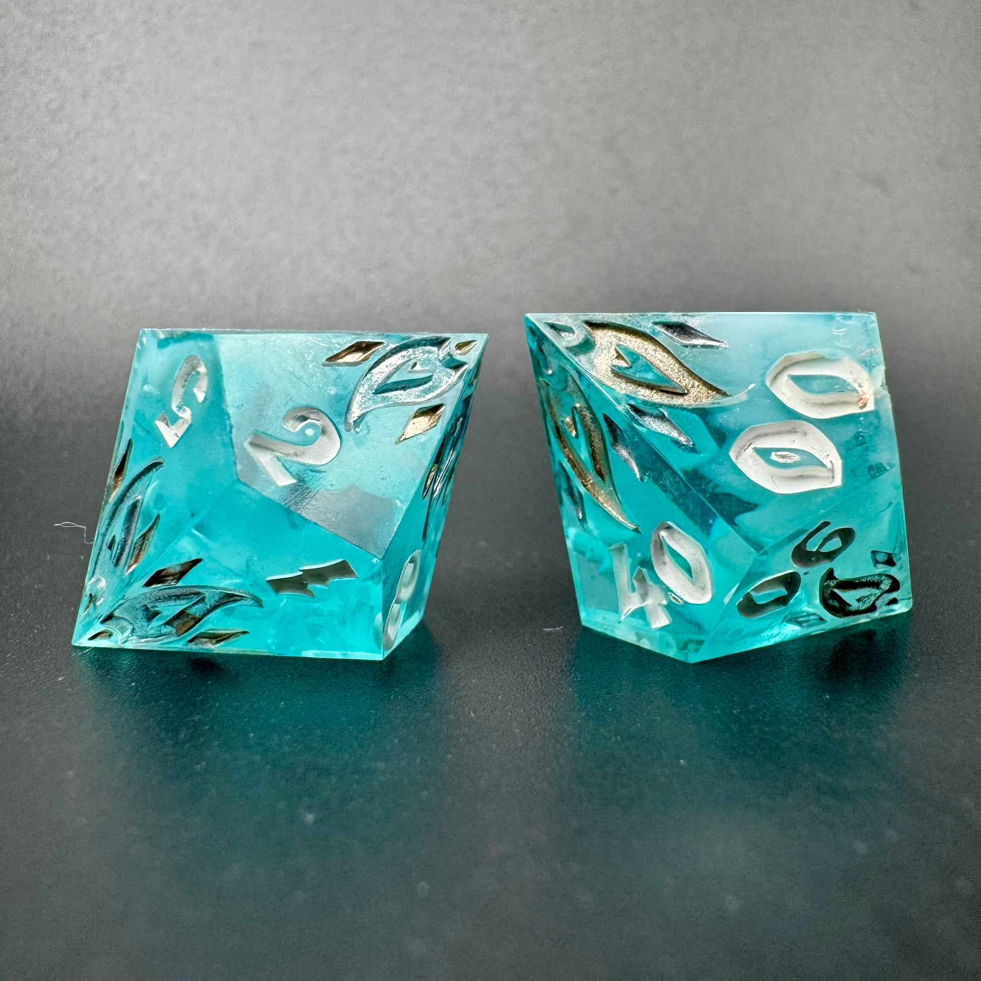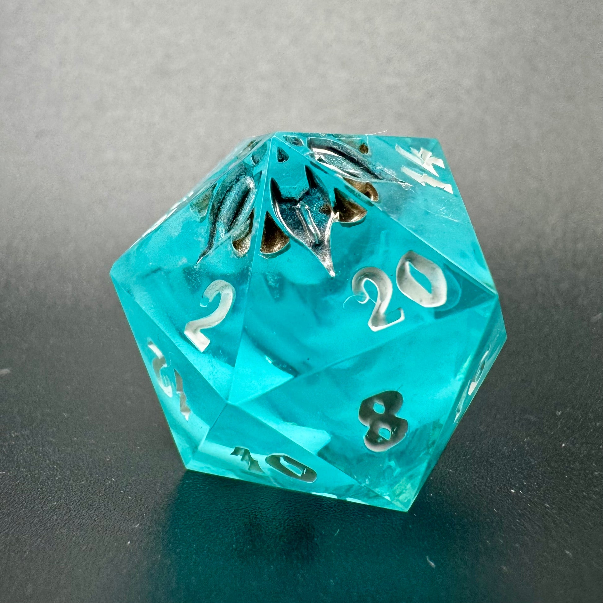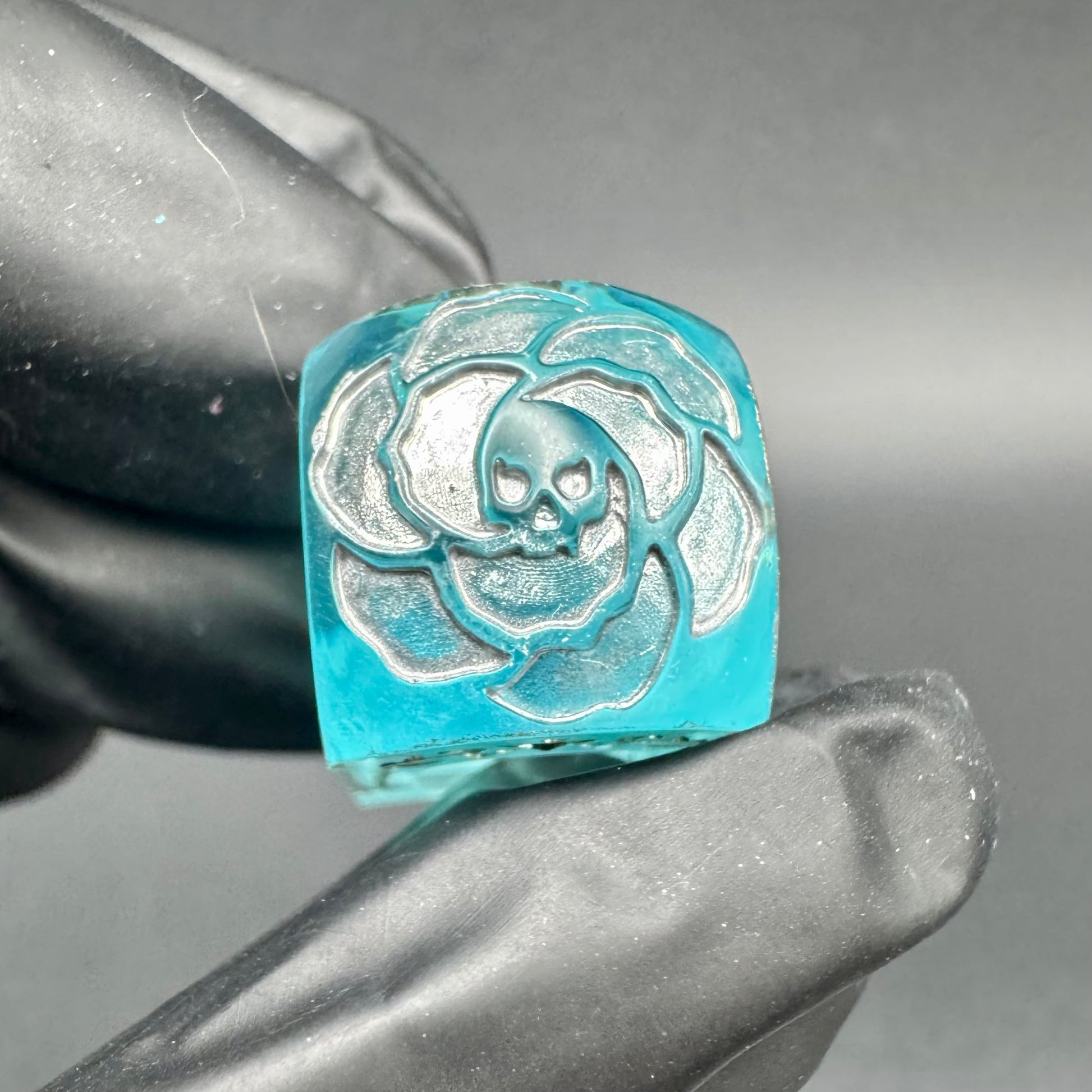 Intricate set in clear sky blue with wisps of white clouds. Floral and skull detailling inked in frosty chrome silver and pale gold. Numbers in frost white.