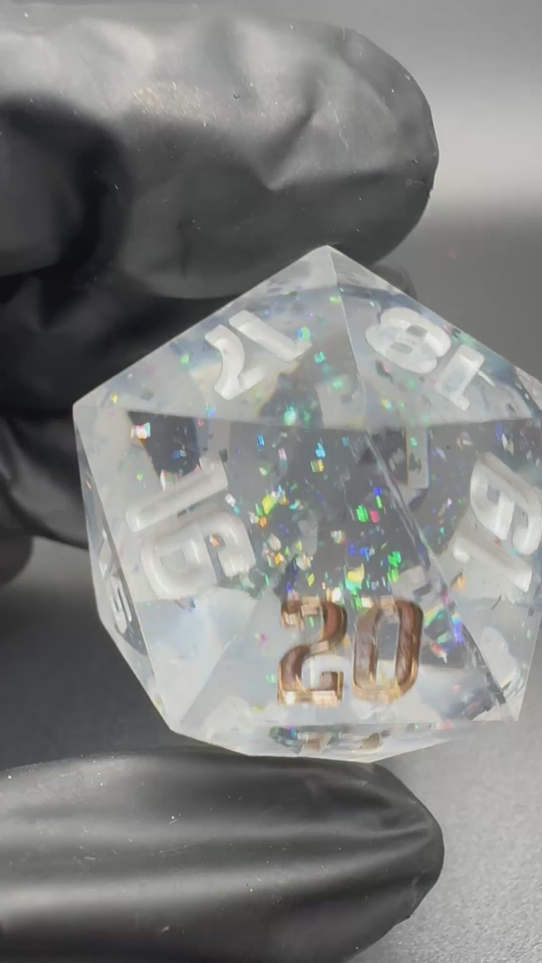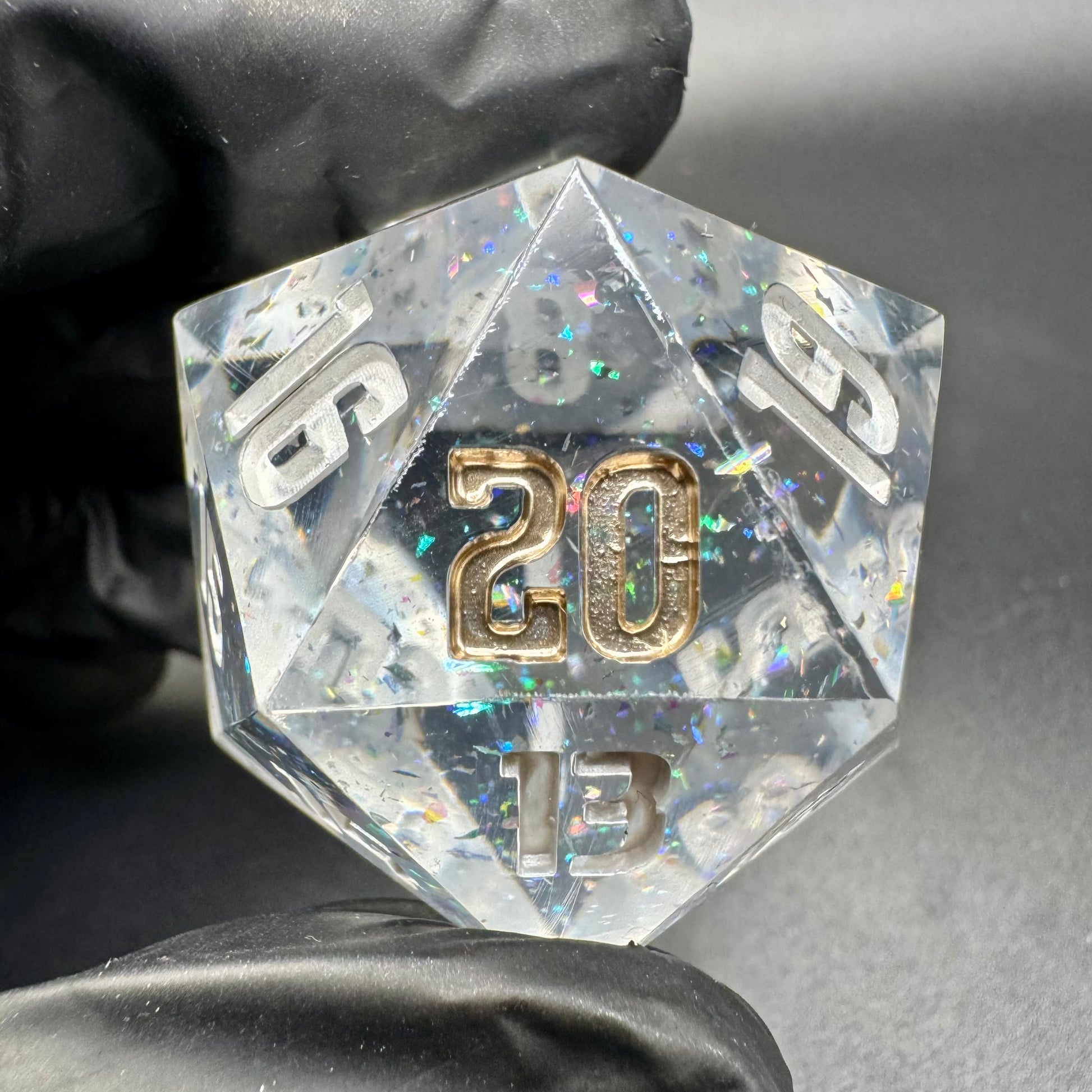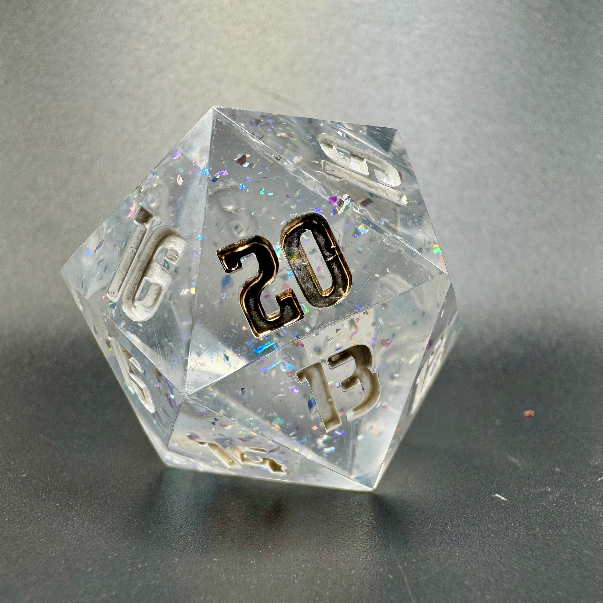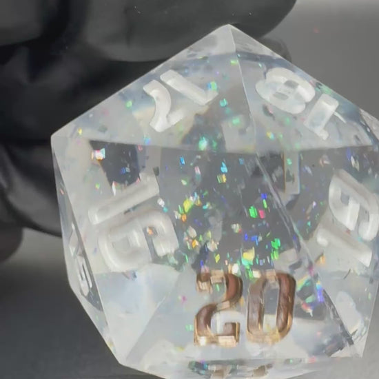 Clear 30mm spindown d20 with intense holographic flake.