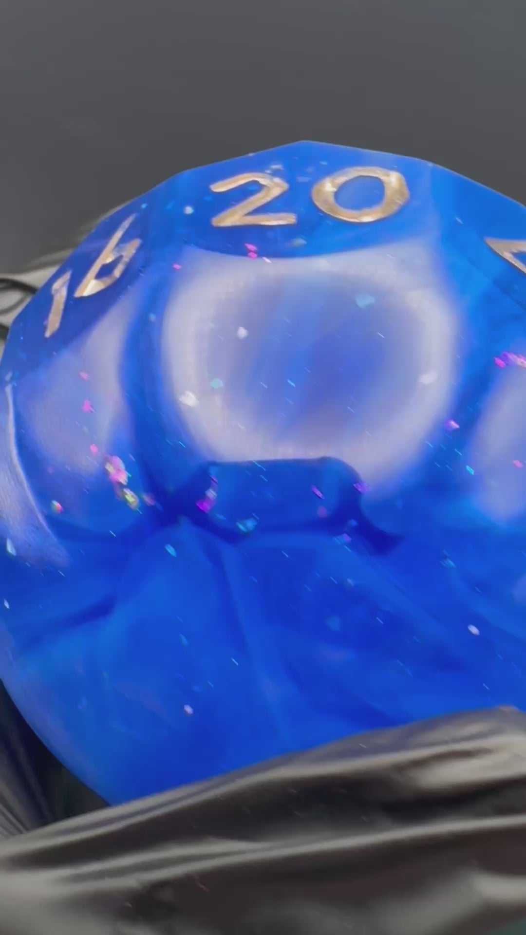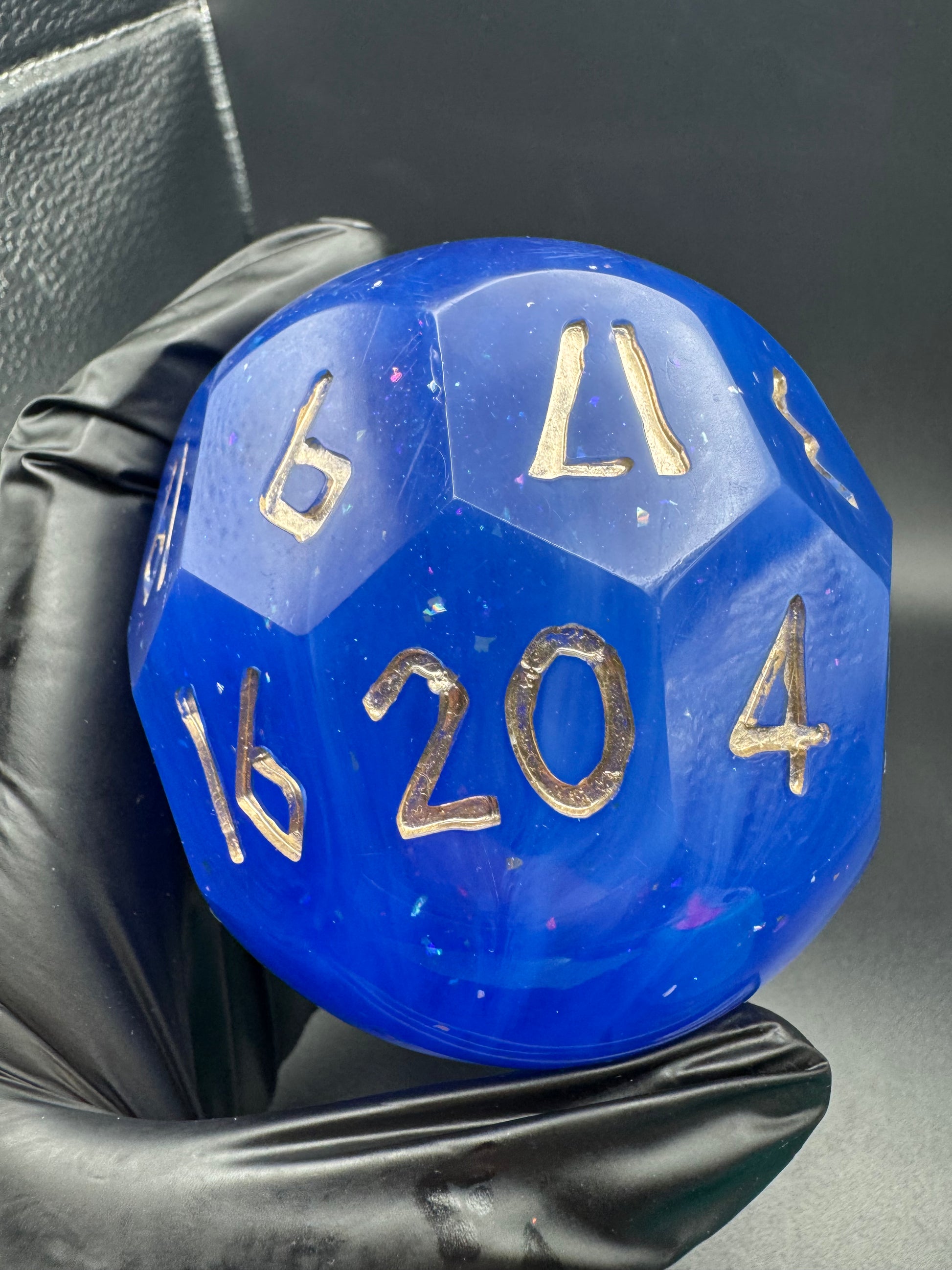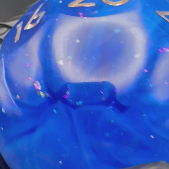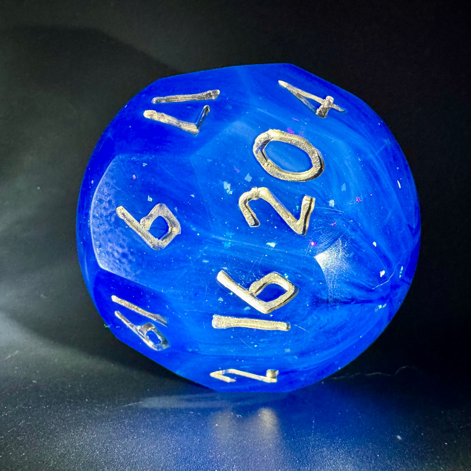 80mm monster size orb d20 in sapphire blue resin mixed with white streaks and holographic flakes. Numbers inked in soft gold.