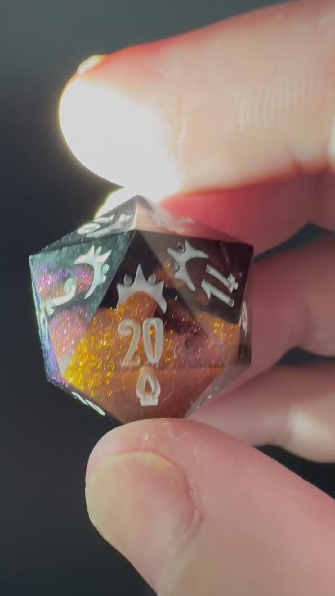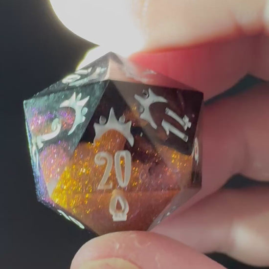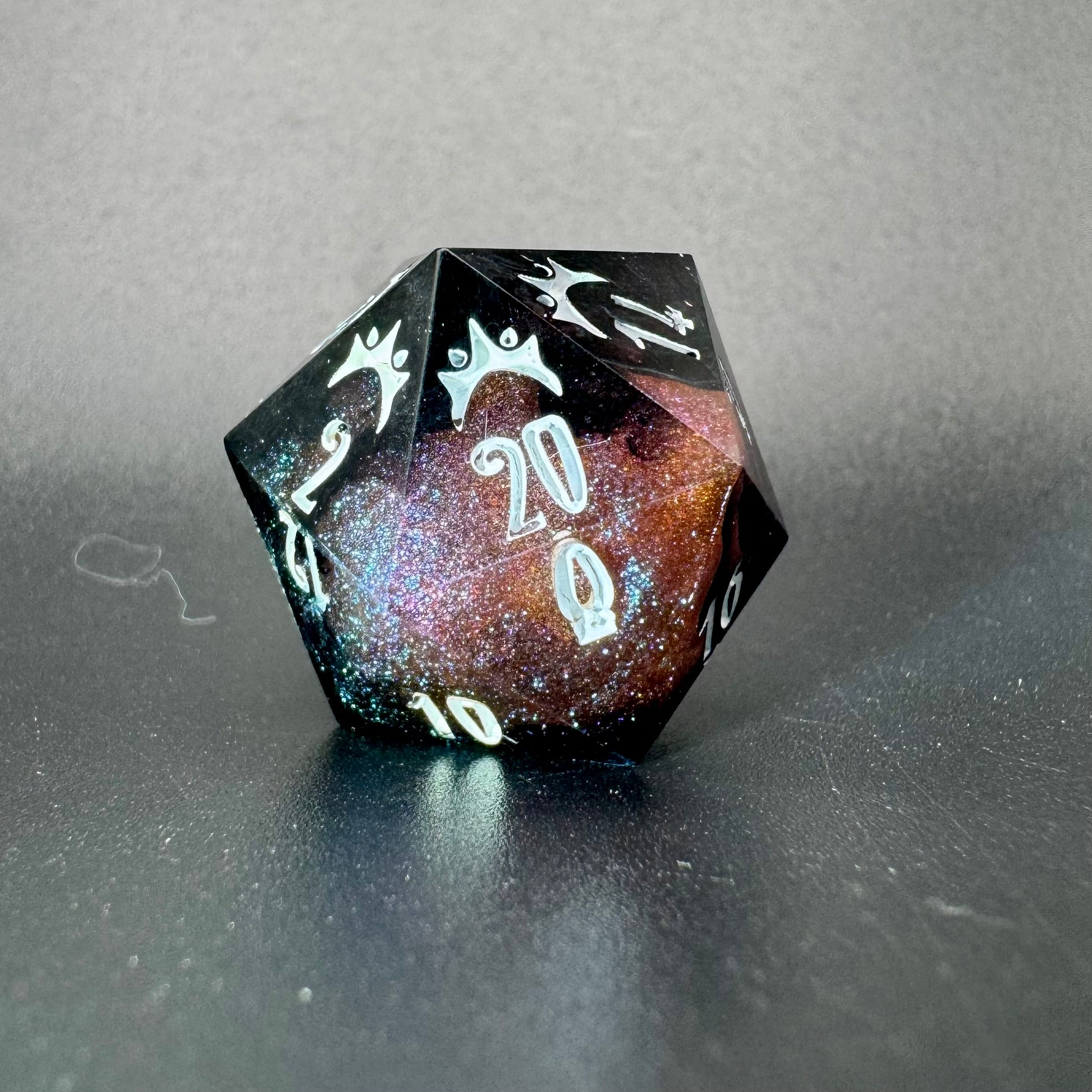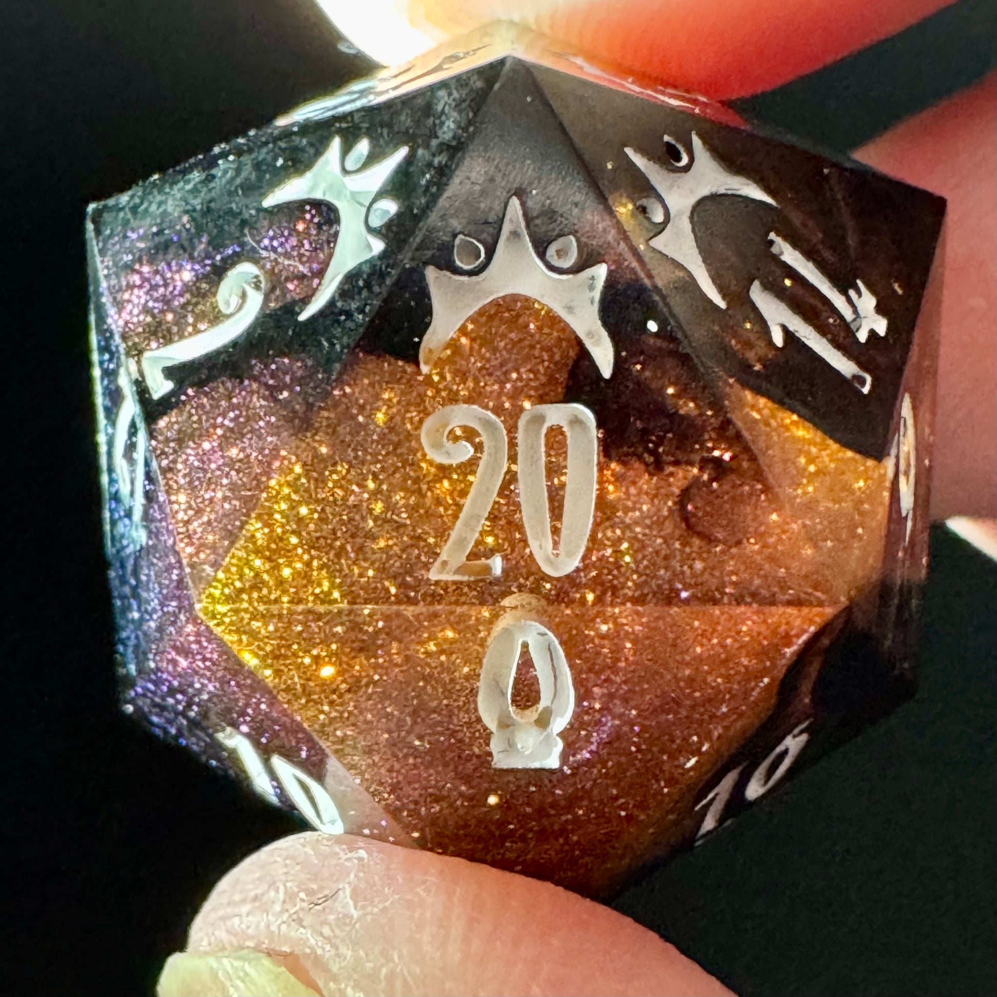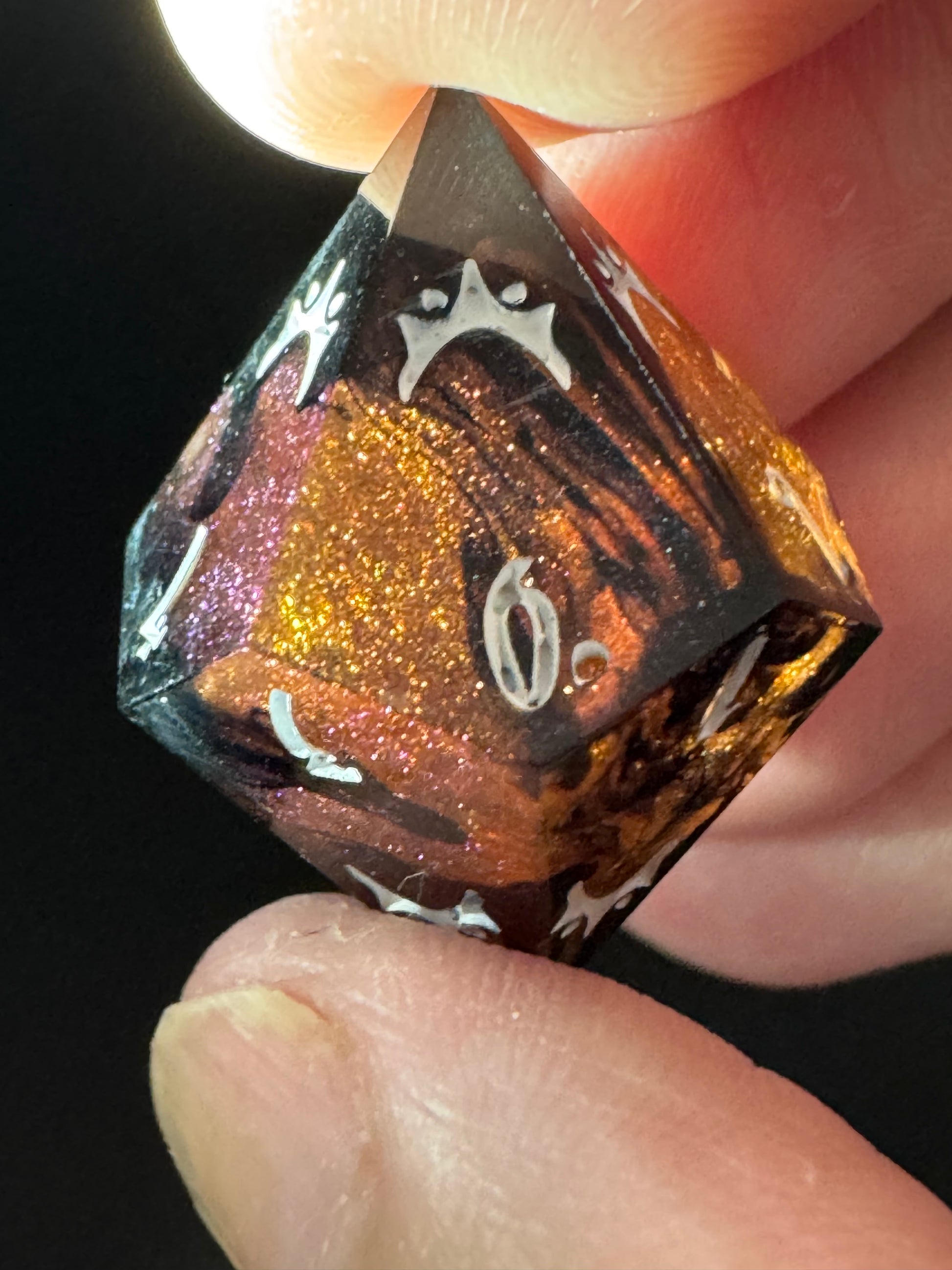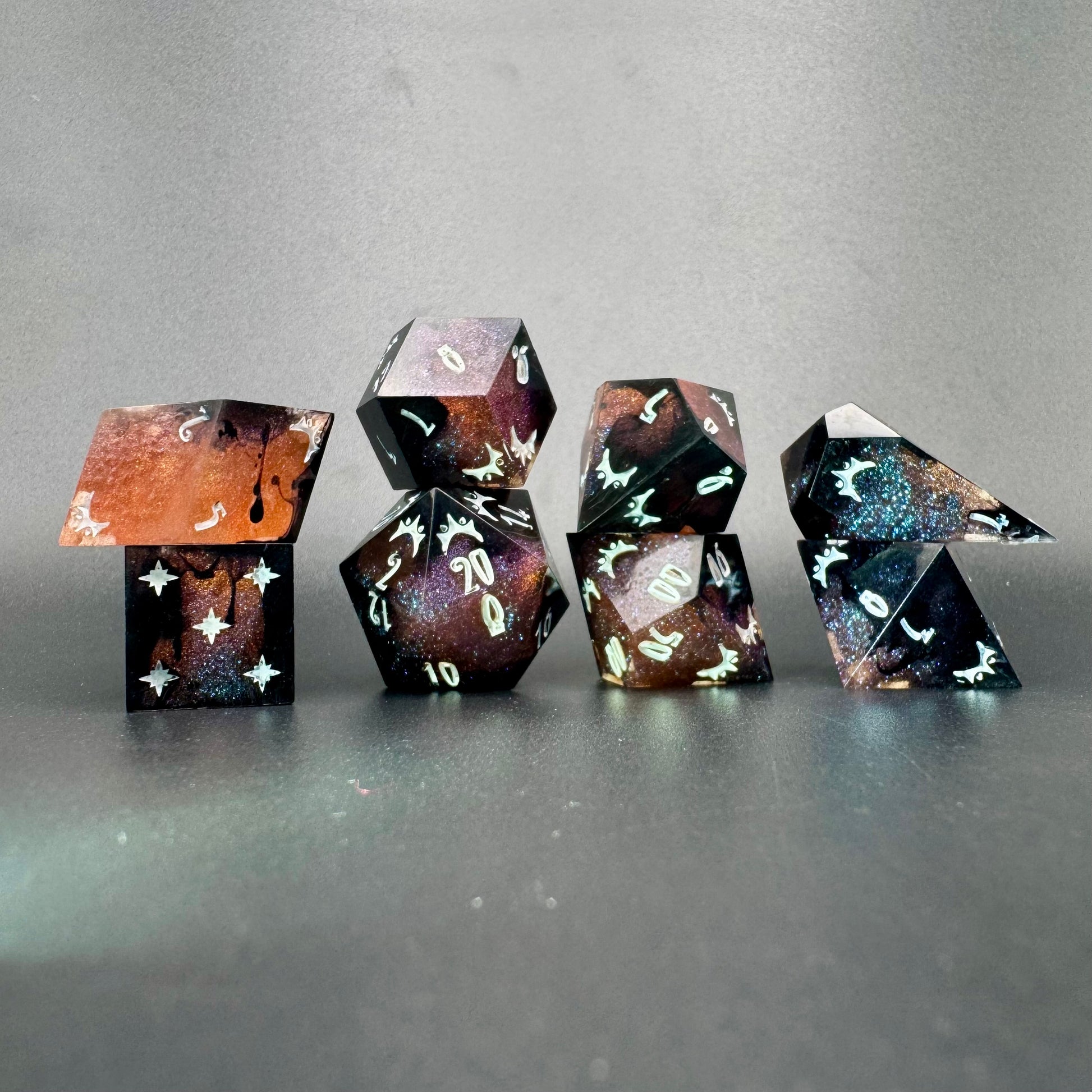 8 piece intricate dice set in inky black and colourshift bloodstained red that shifts to blue at some angles. Details inked in metallic gold with numbers in bone white.