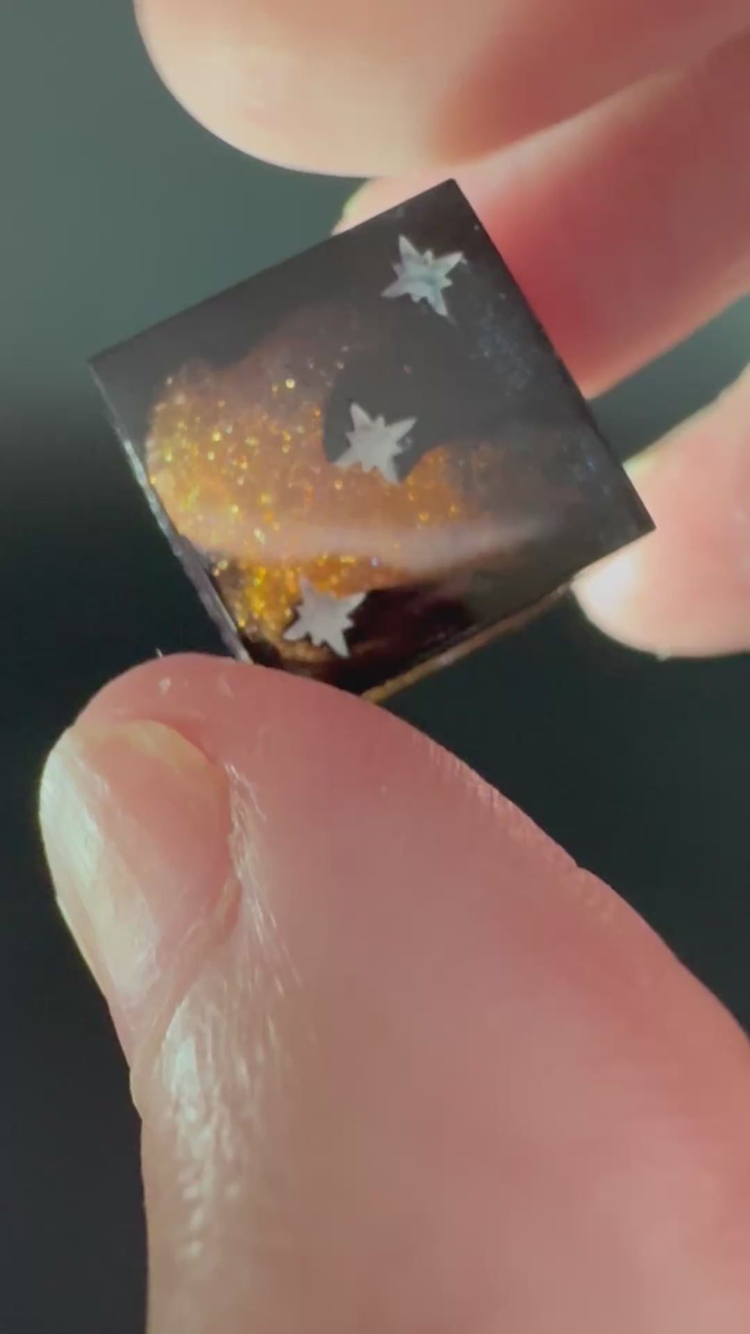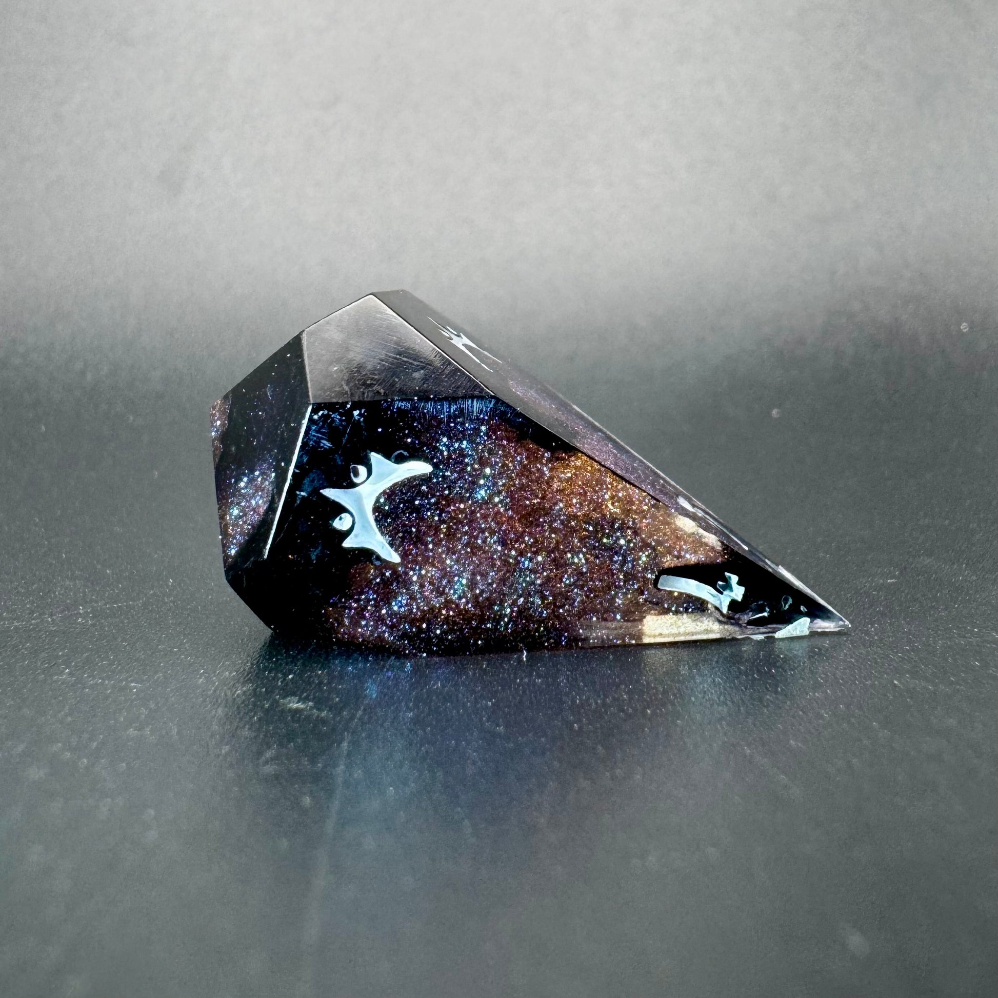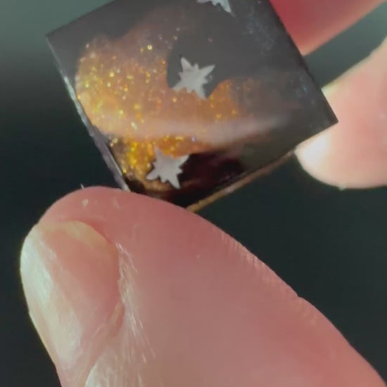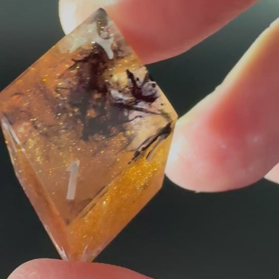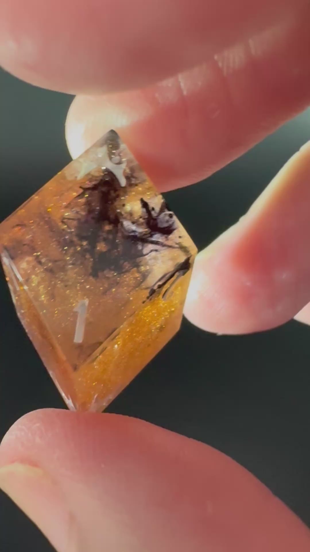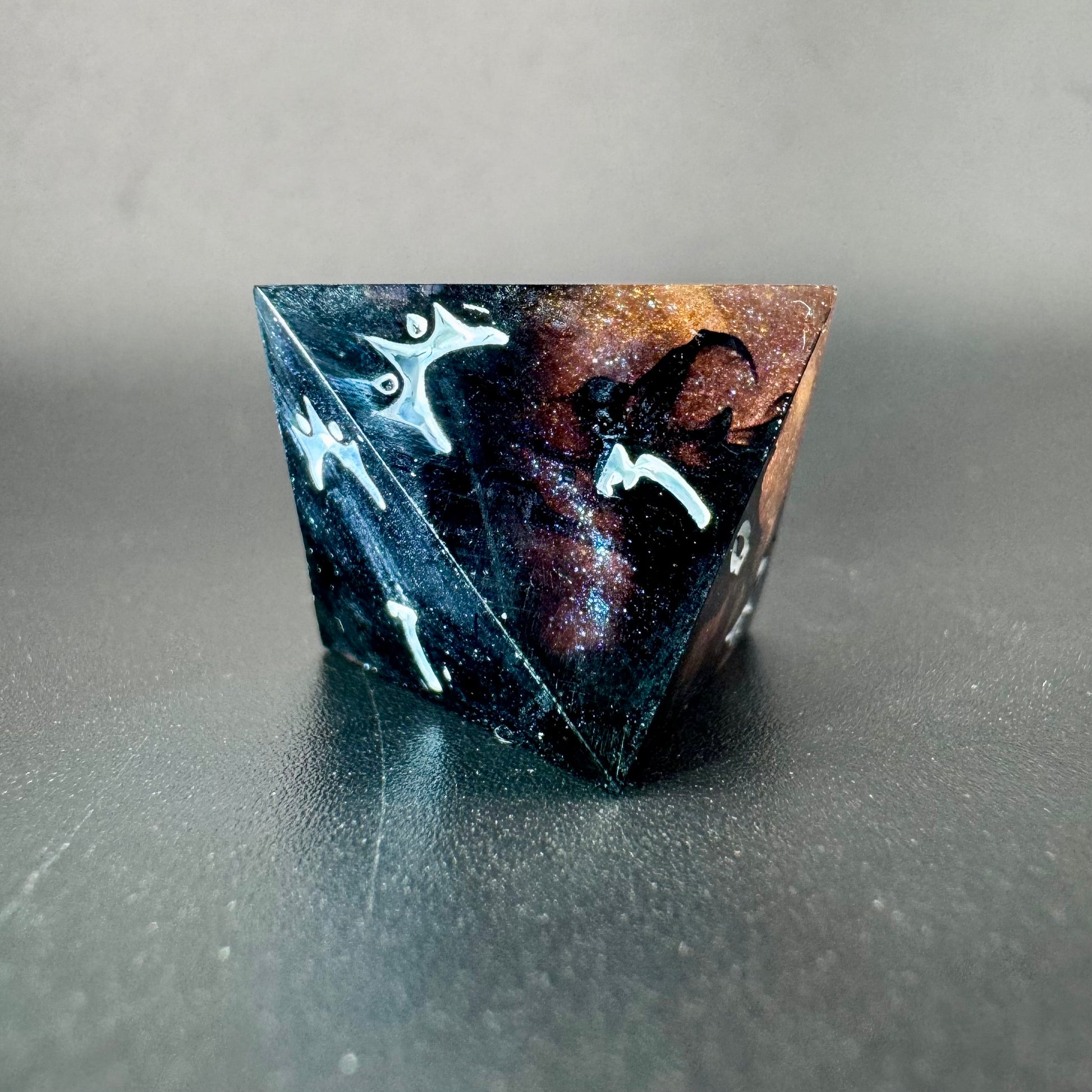 8 piece intricate dice set in inky black and colourshift bloodstained red that shifts to blue at some angles. Details inked in metallic gold with numbers in bone white.