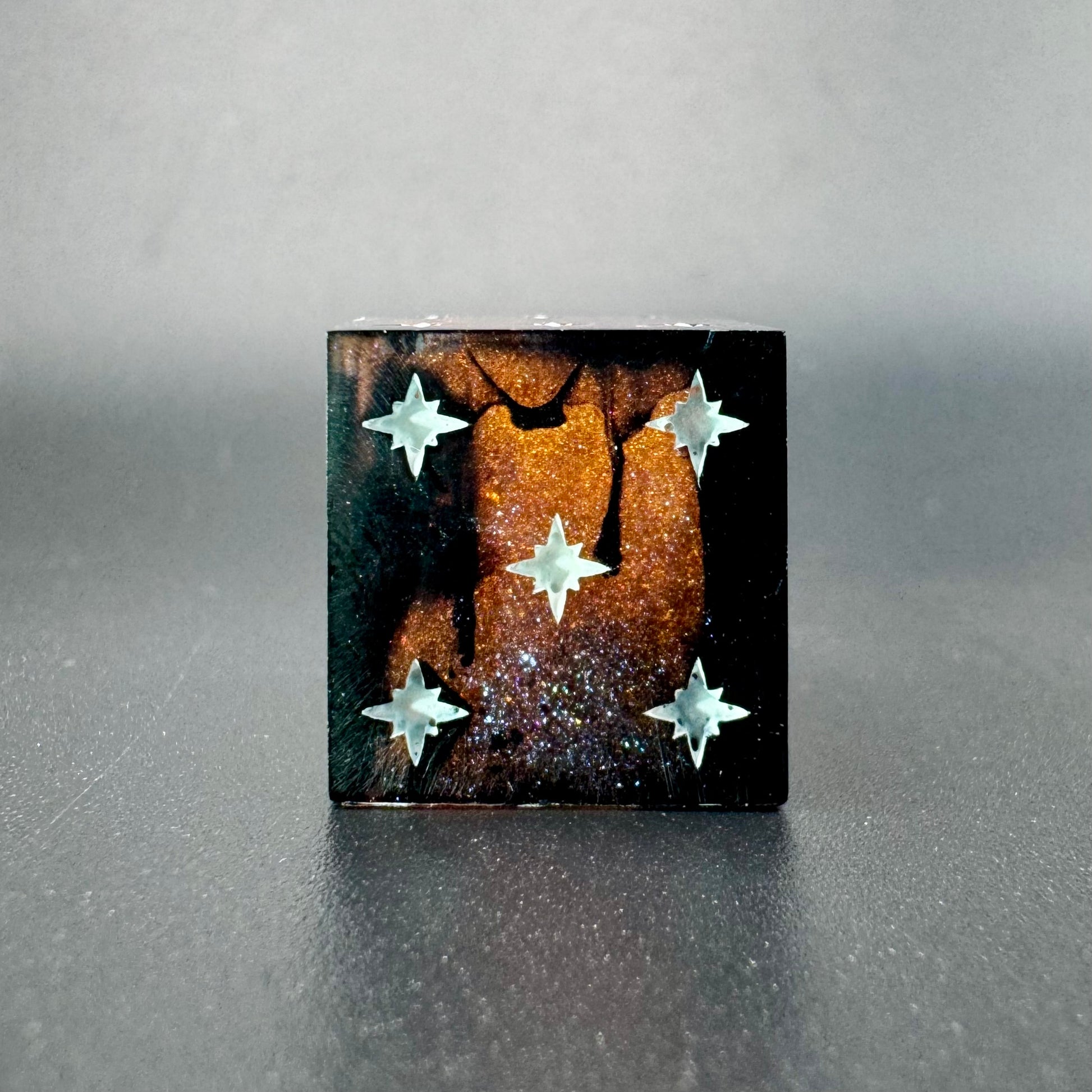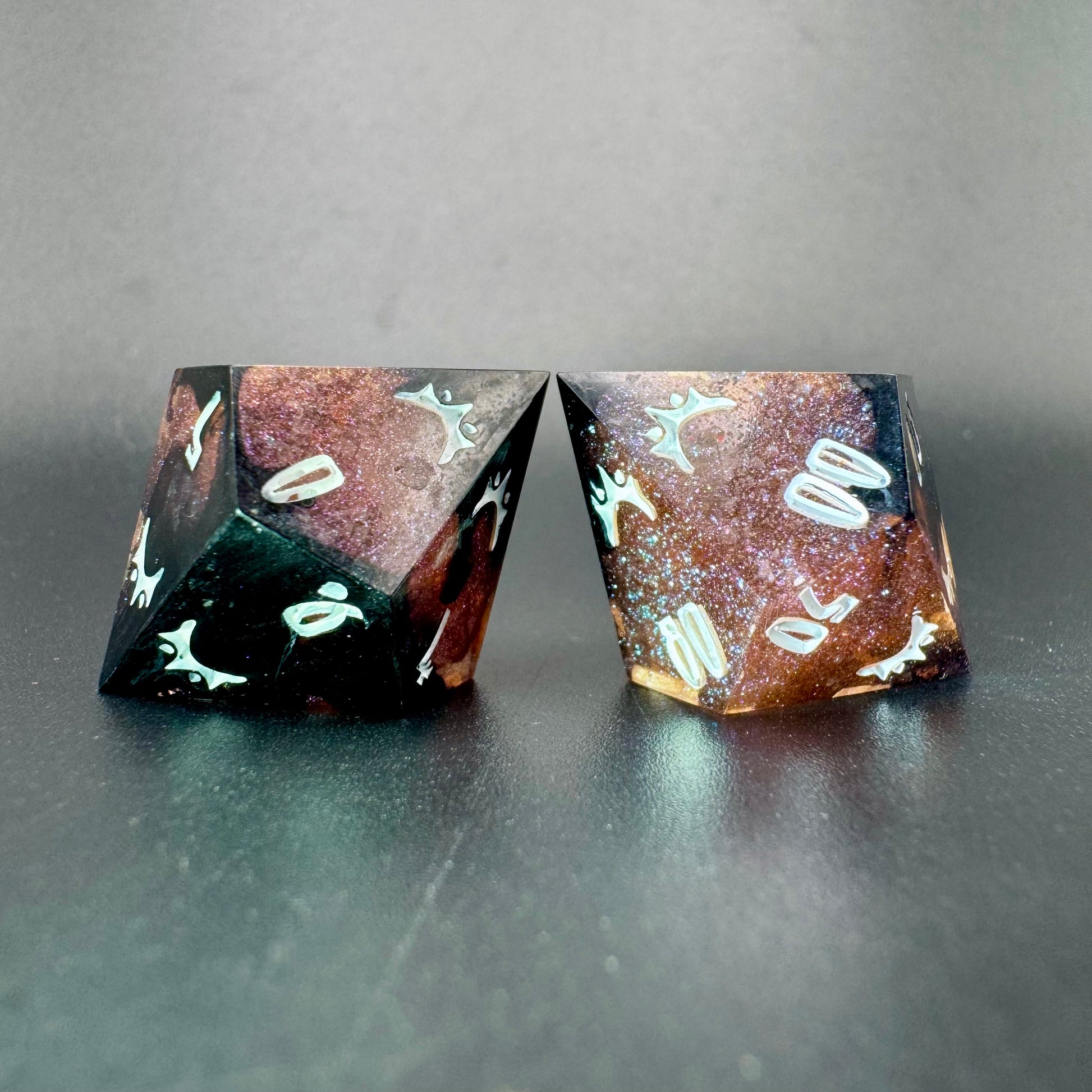 Note that this set includes 2 d6s, one skewed with numbers and one cube with starburst pips.