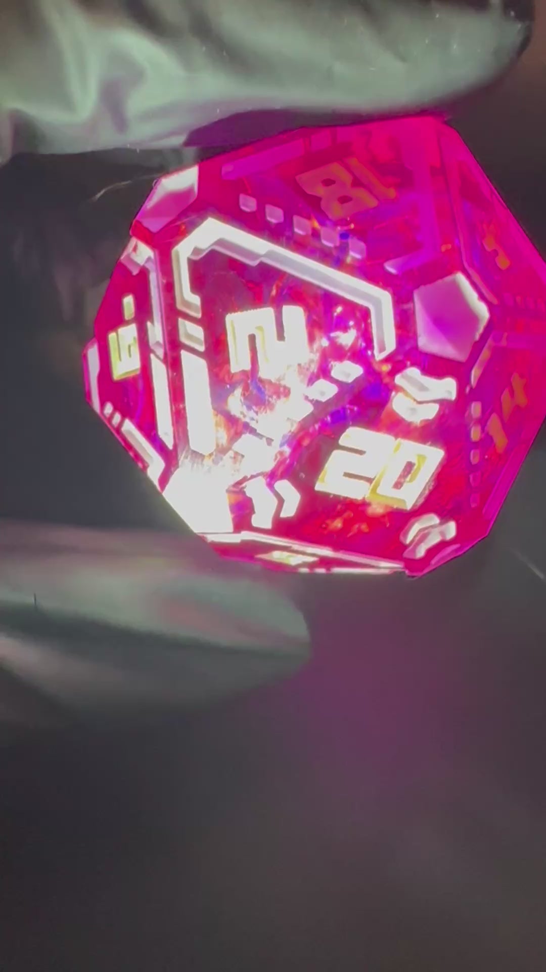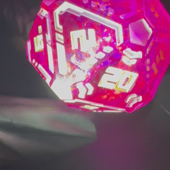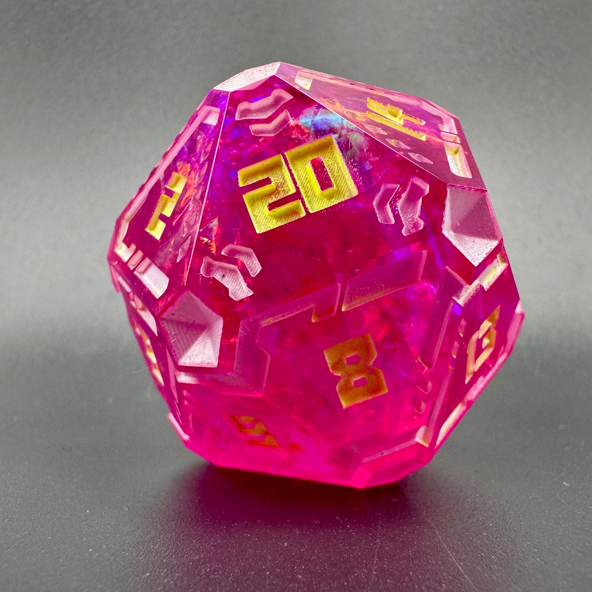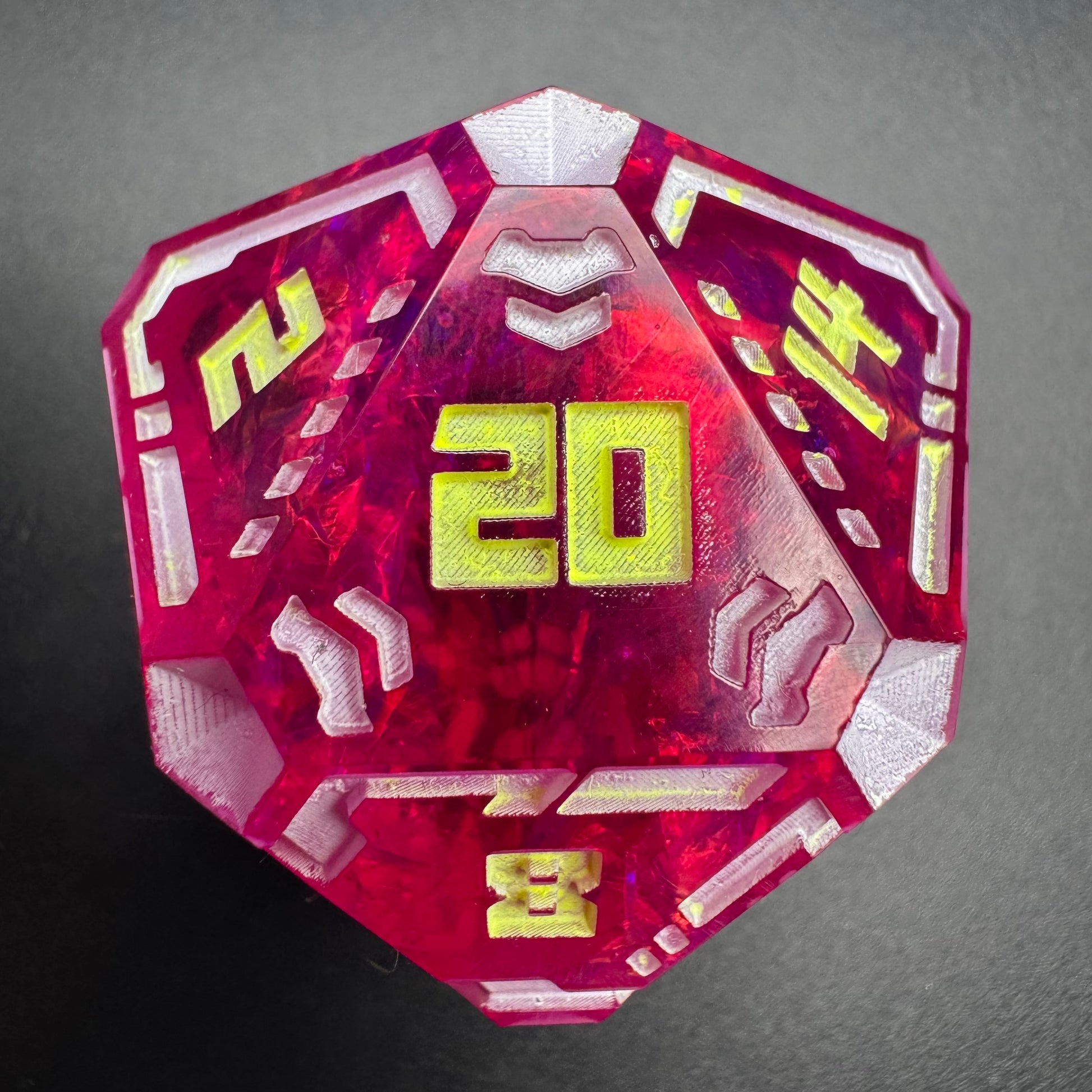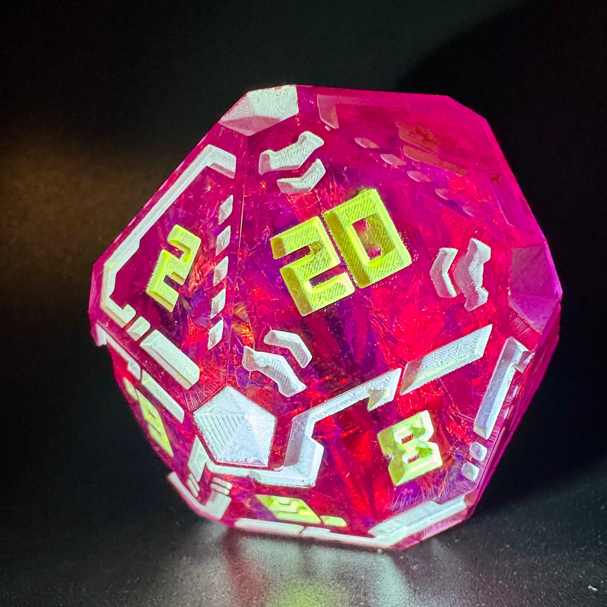 42mm intricate sci fi d20 in brightest pink resin and filled with holographic mylar. Details inked in white and numbers in fluorescent yellow.