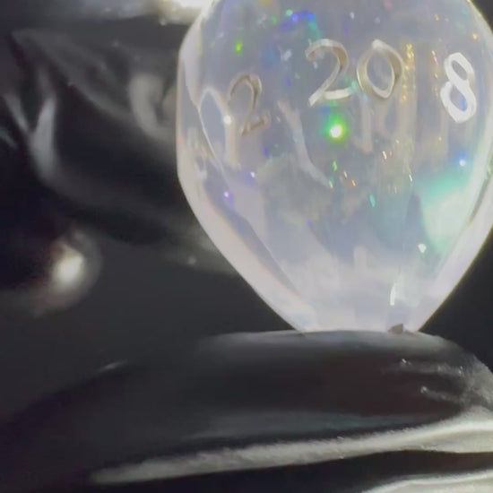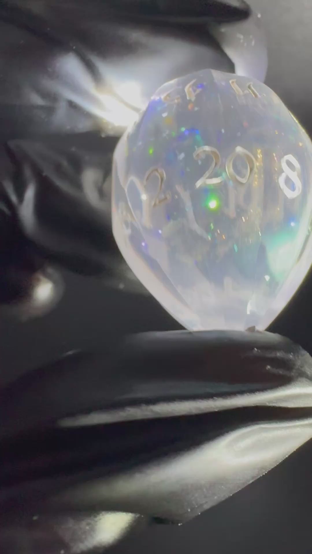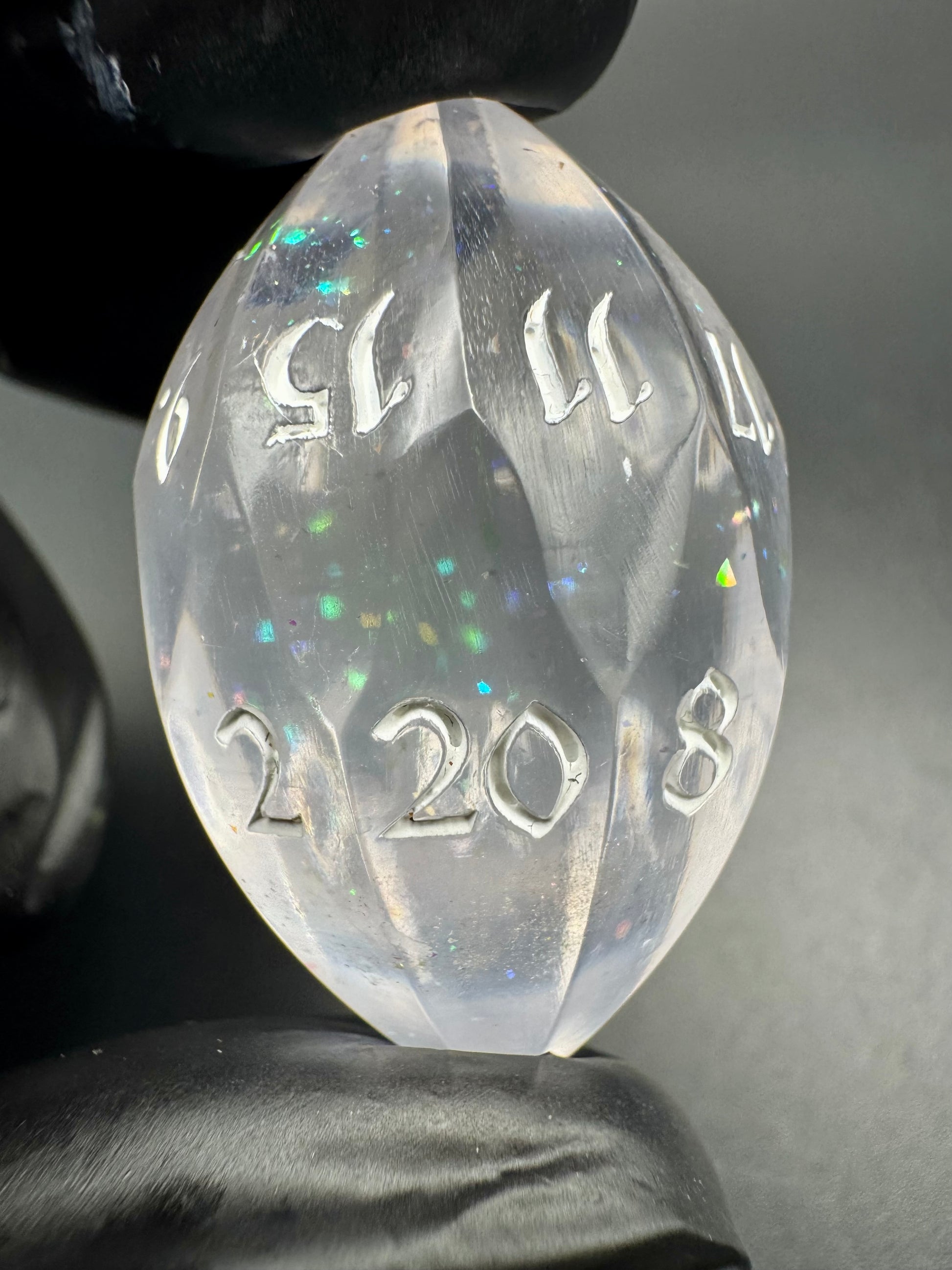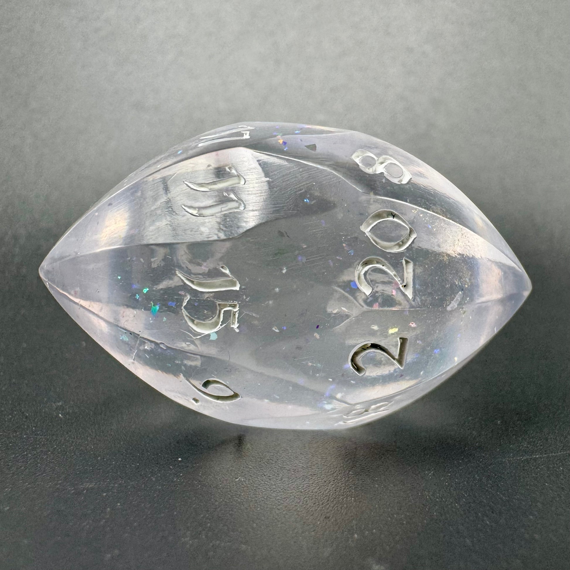 Unusually shaped d20 in foggy translucent resin with rainbow holographic flakes. This one is a real delight to roll and always a hit at the game table. Numbers inked in white.