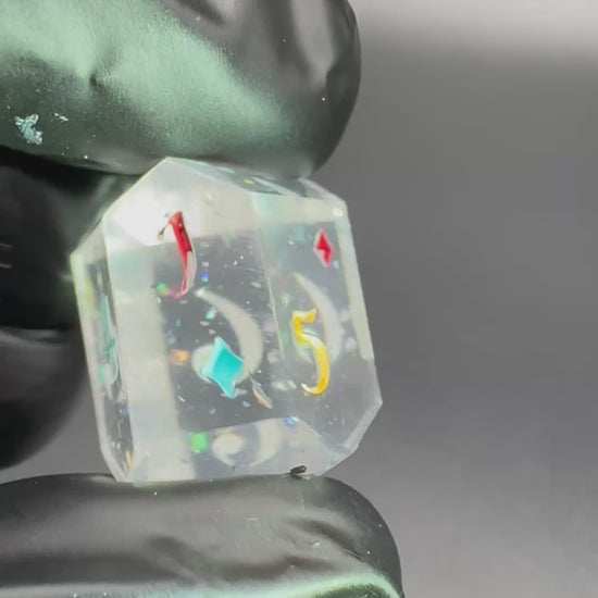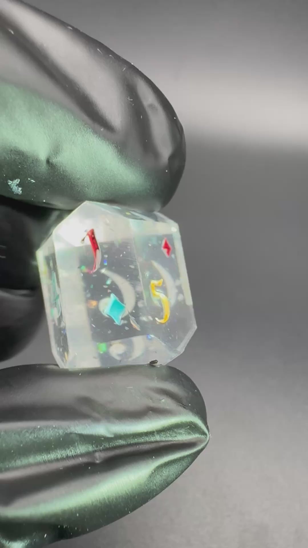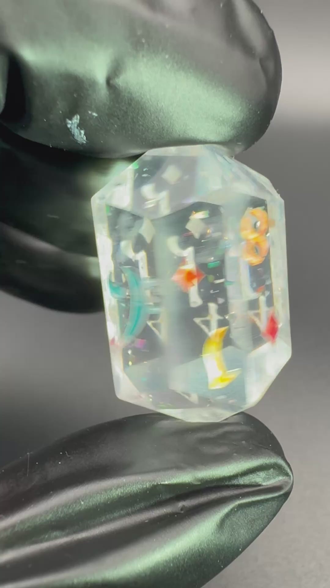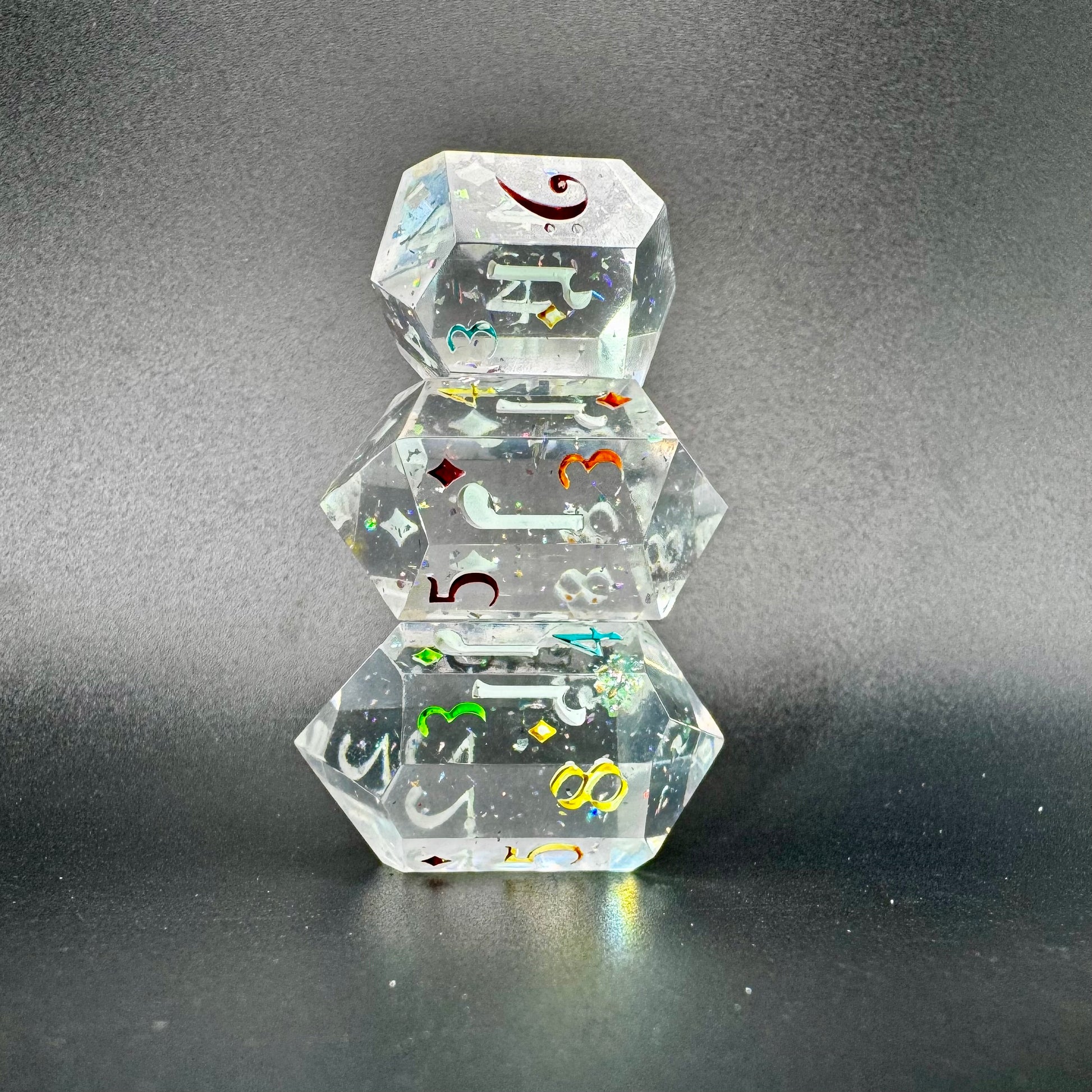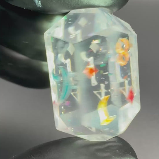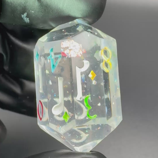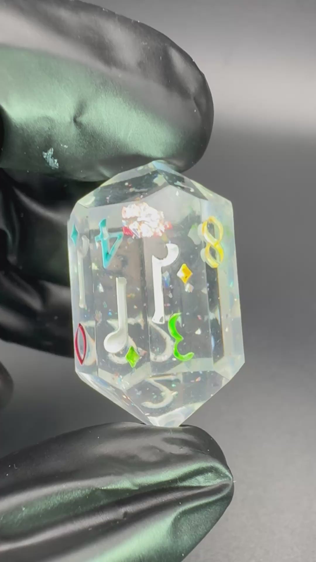 Intricate chunky crystal set in clear resin with holographic flake. Music note details and numbers inked in bright rainbow colours.