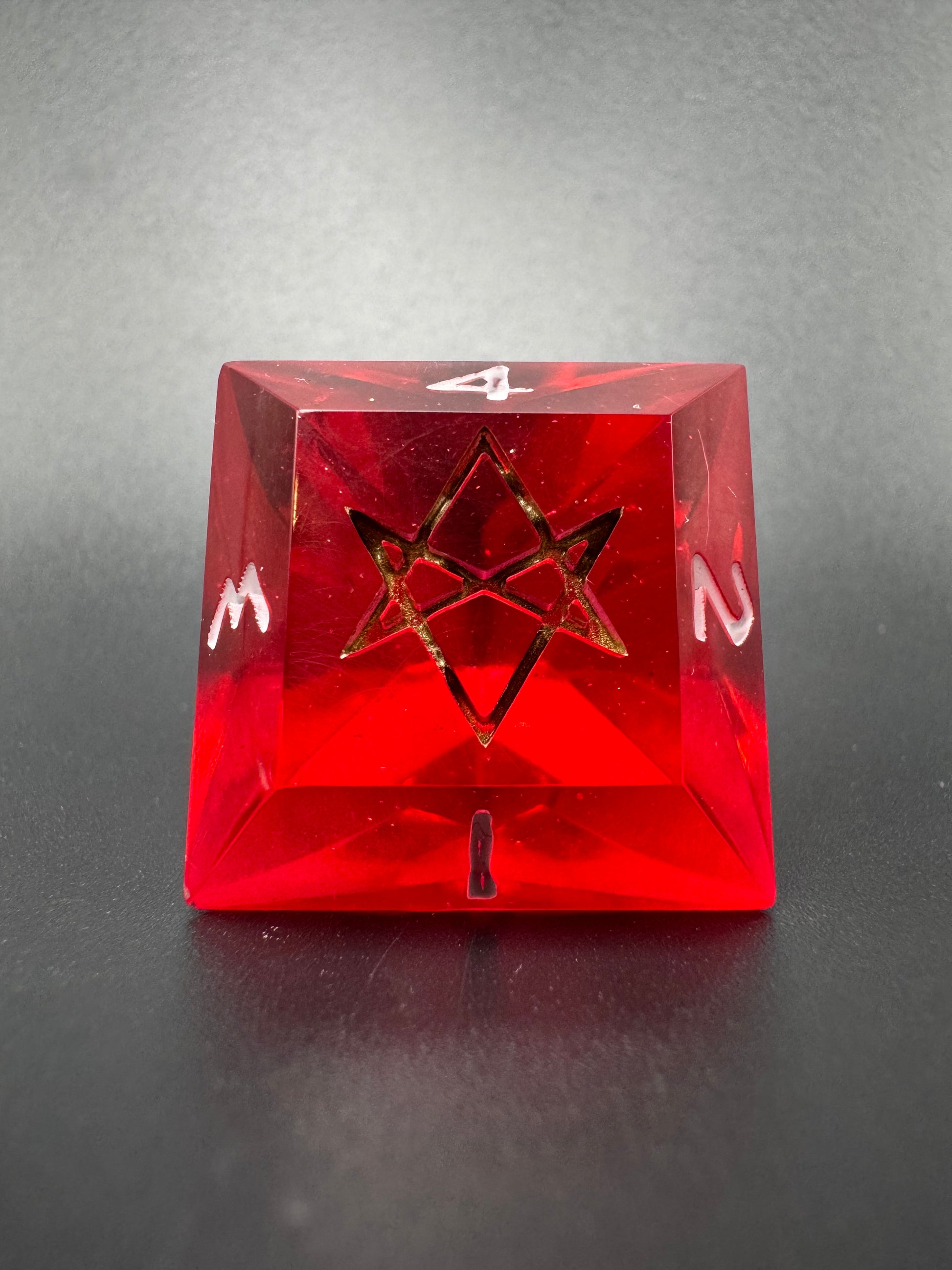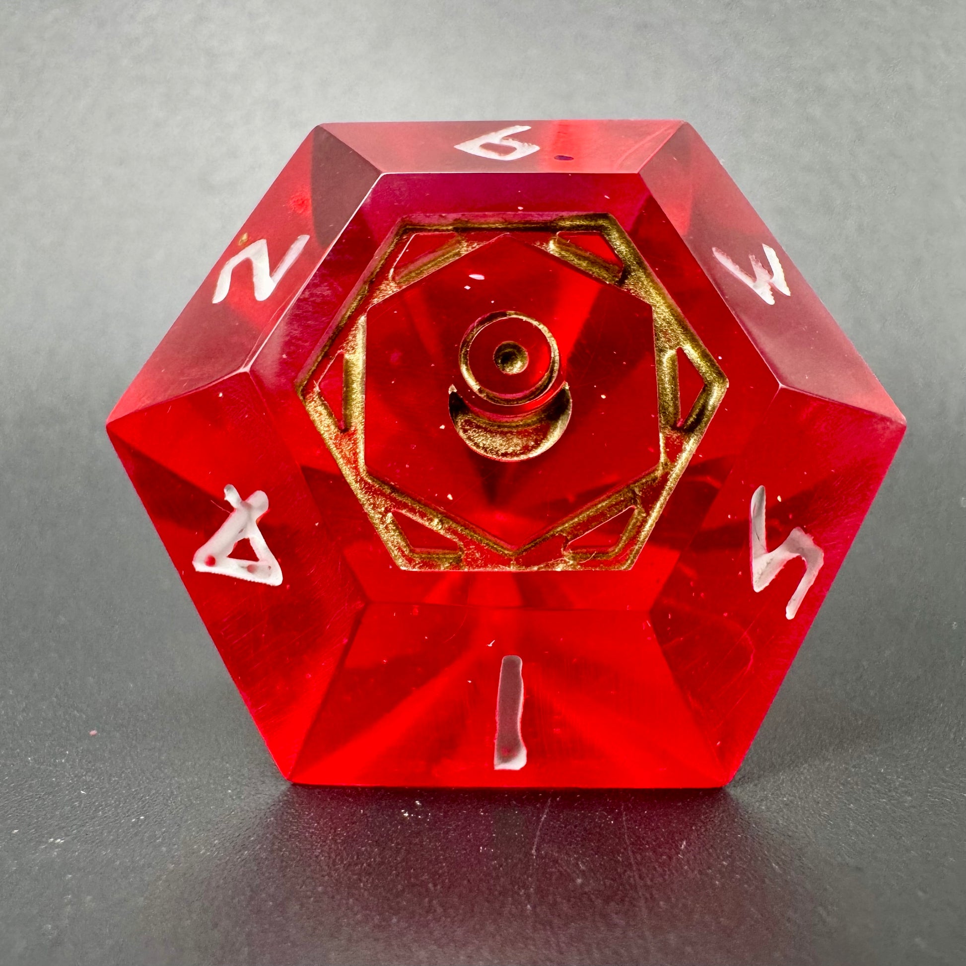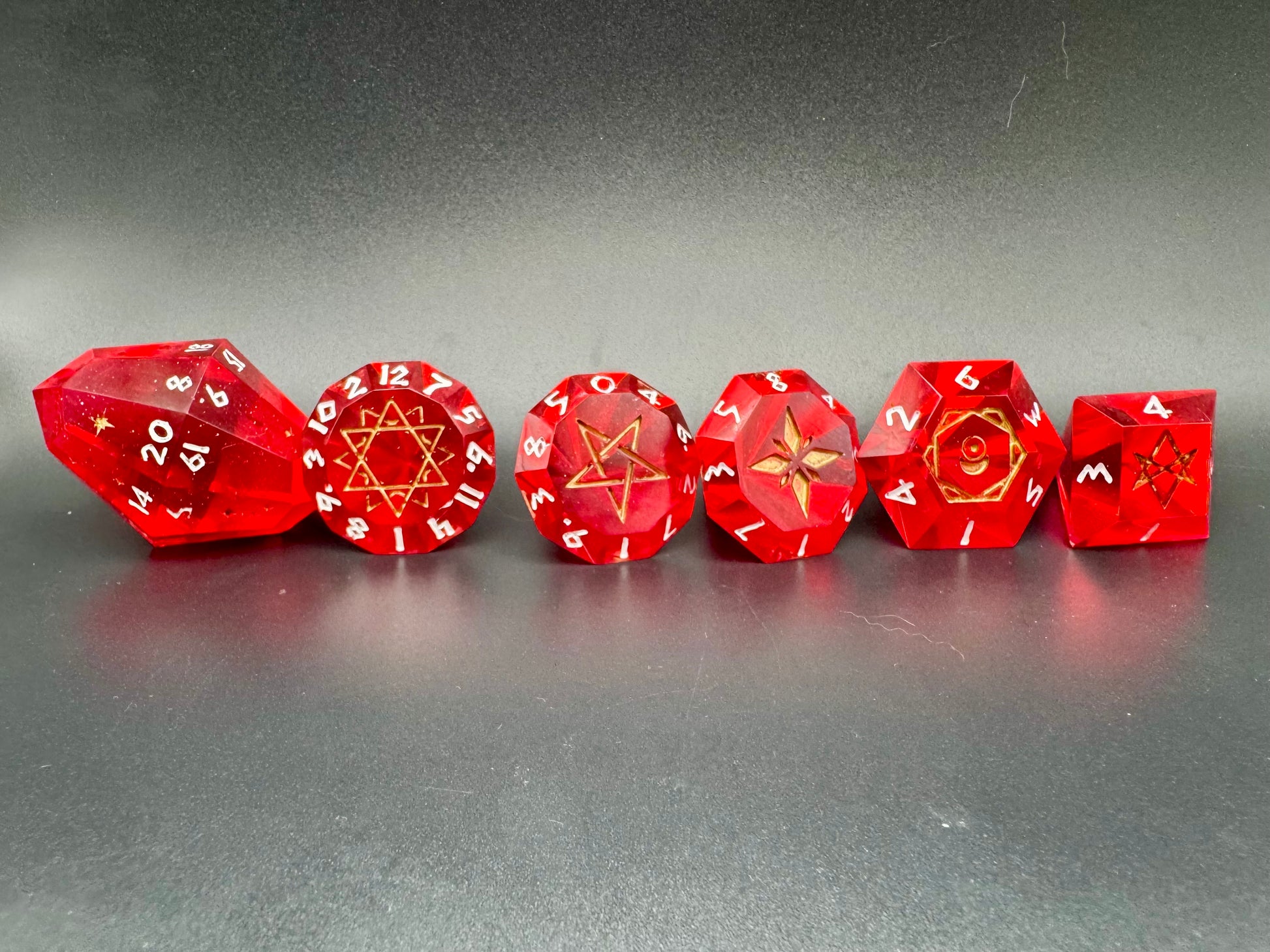 6 piece crystal set in bright translucent ruby red. Detailing inked in metallic gold with numbers in white.