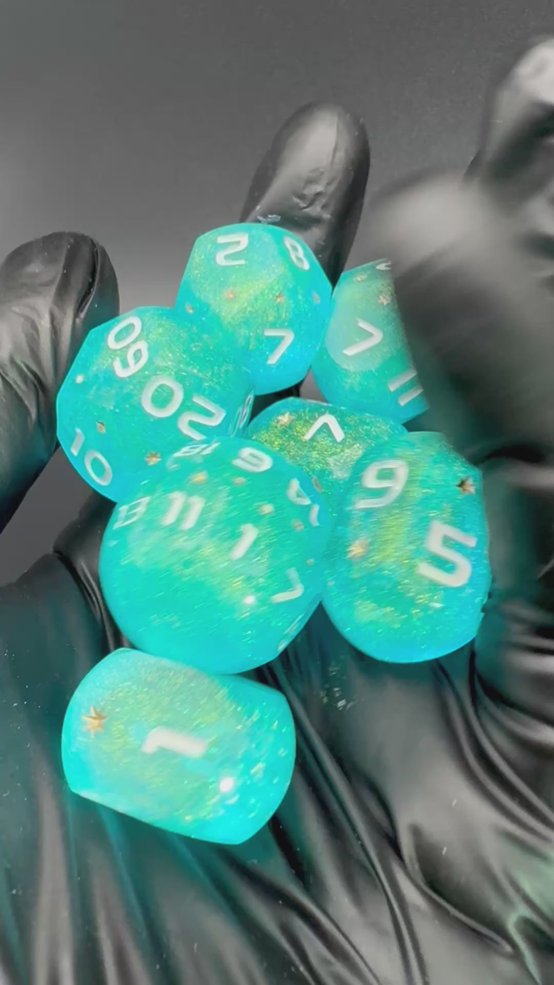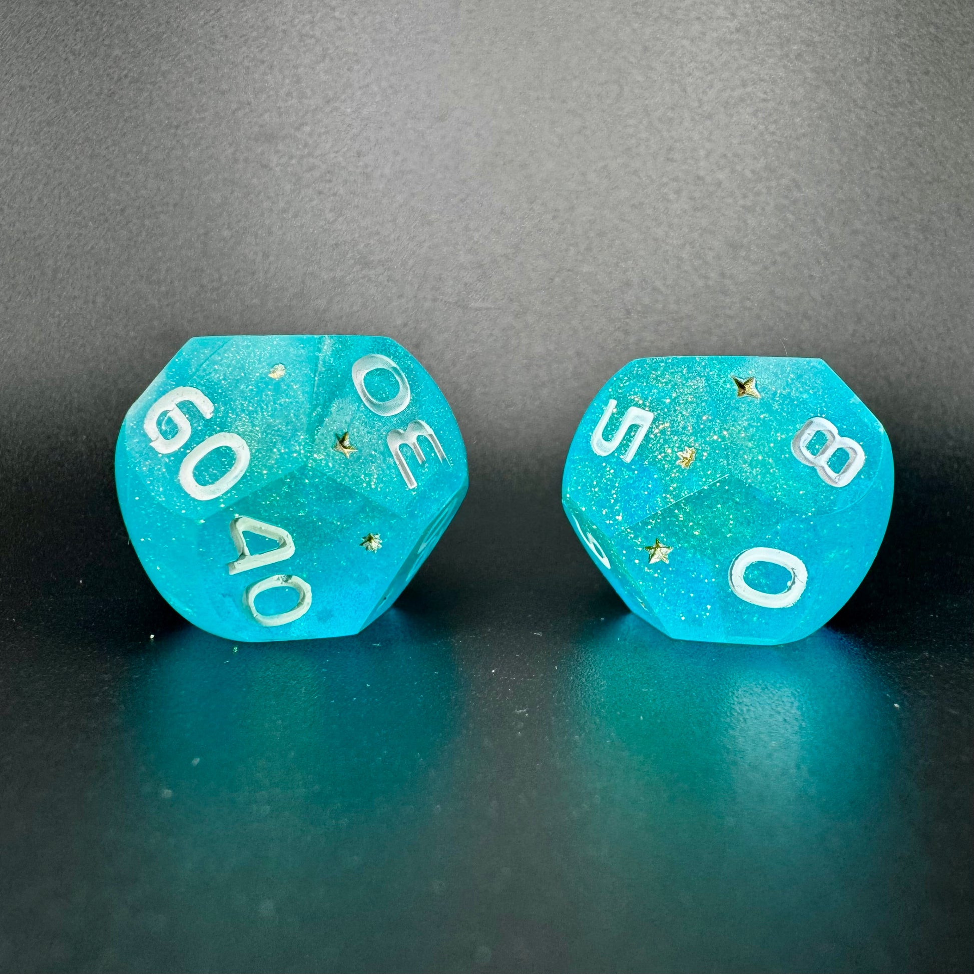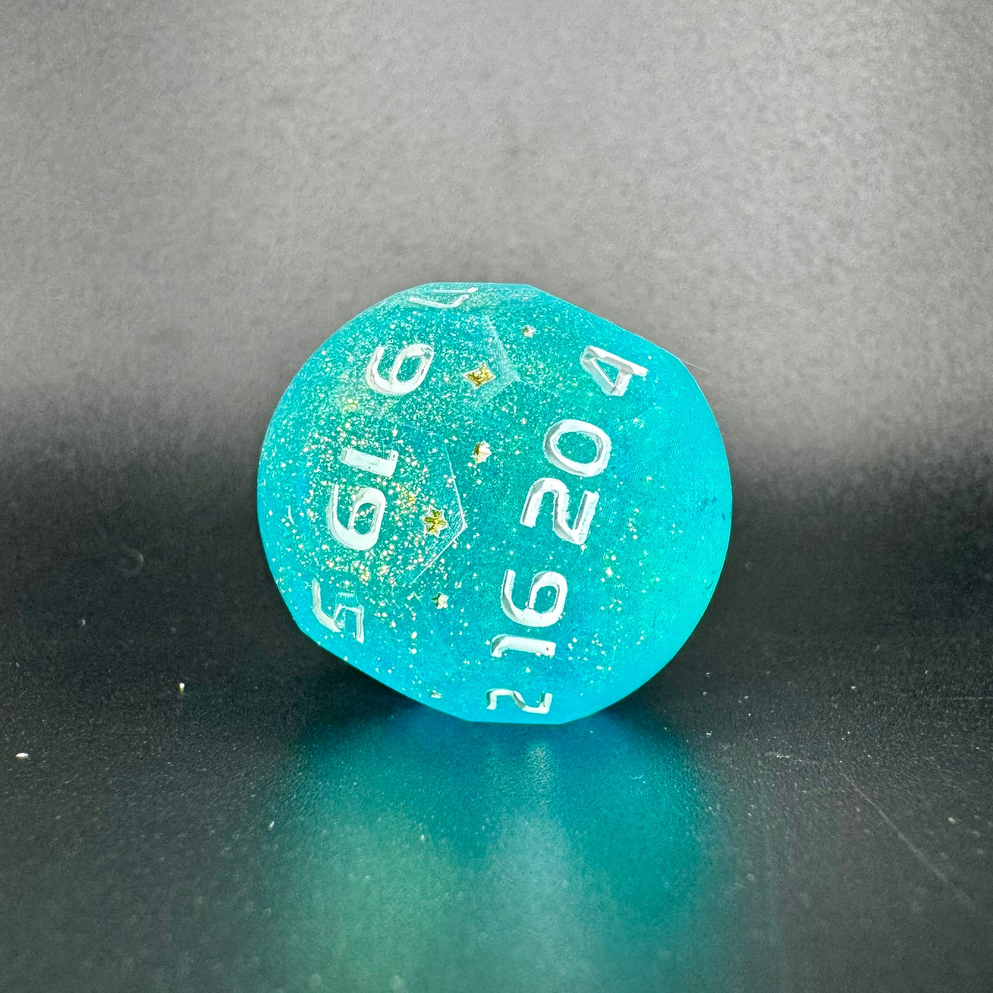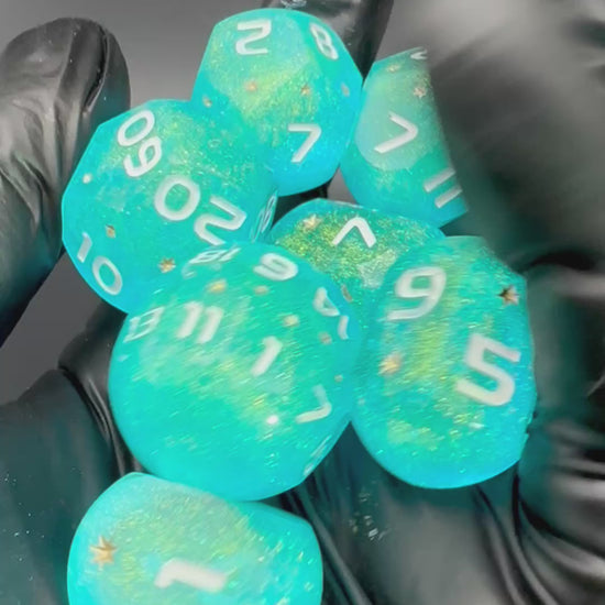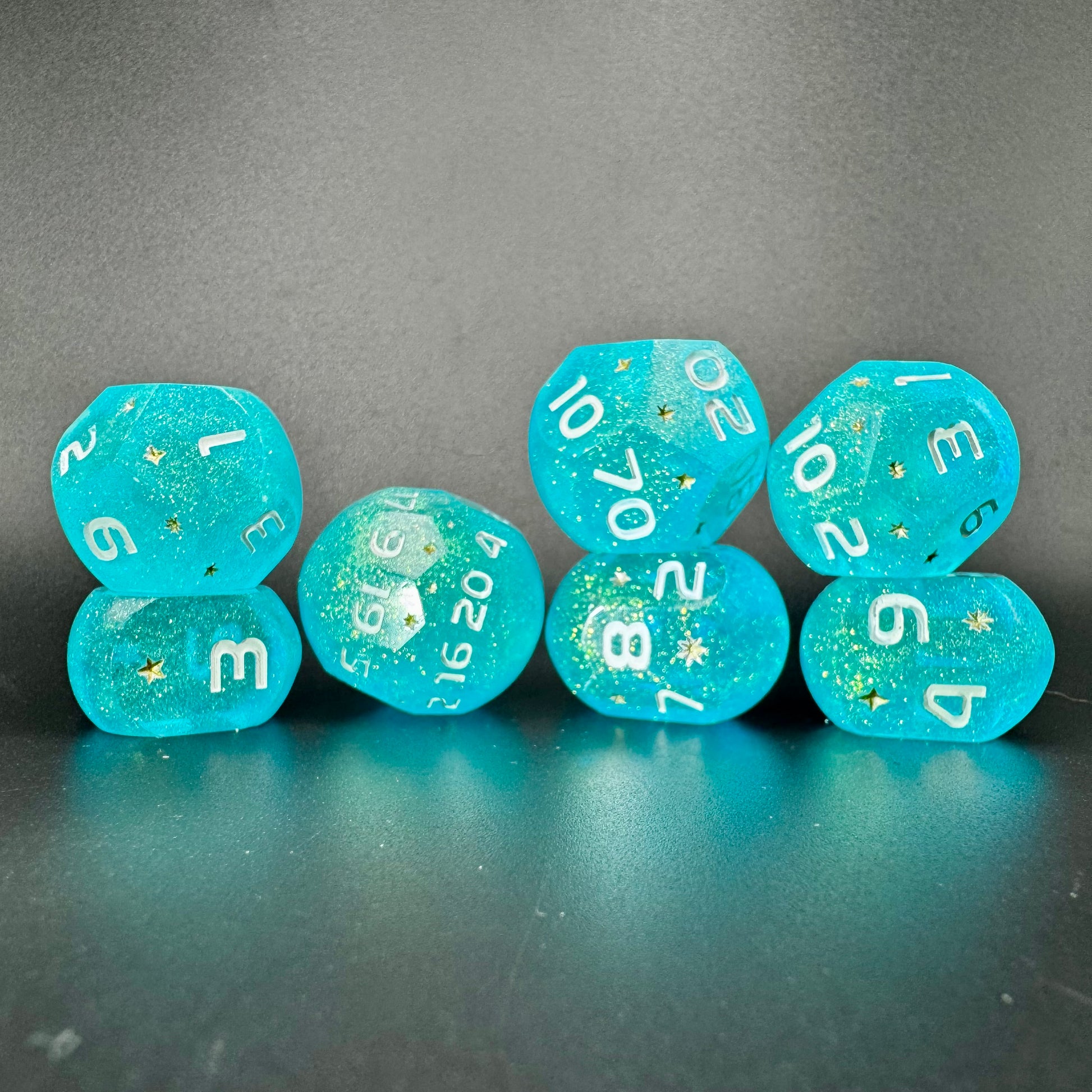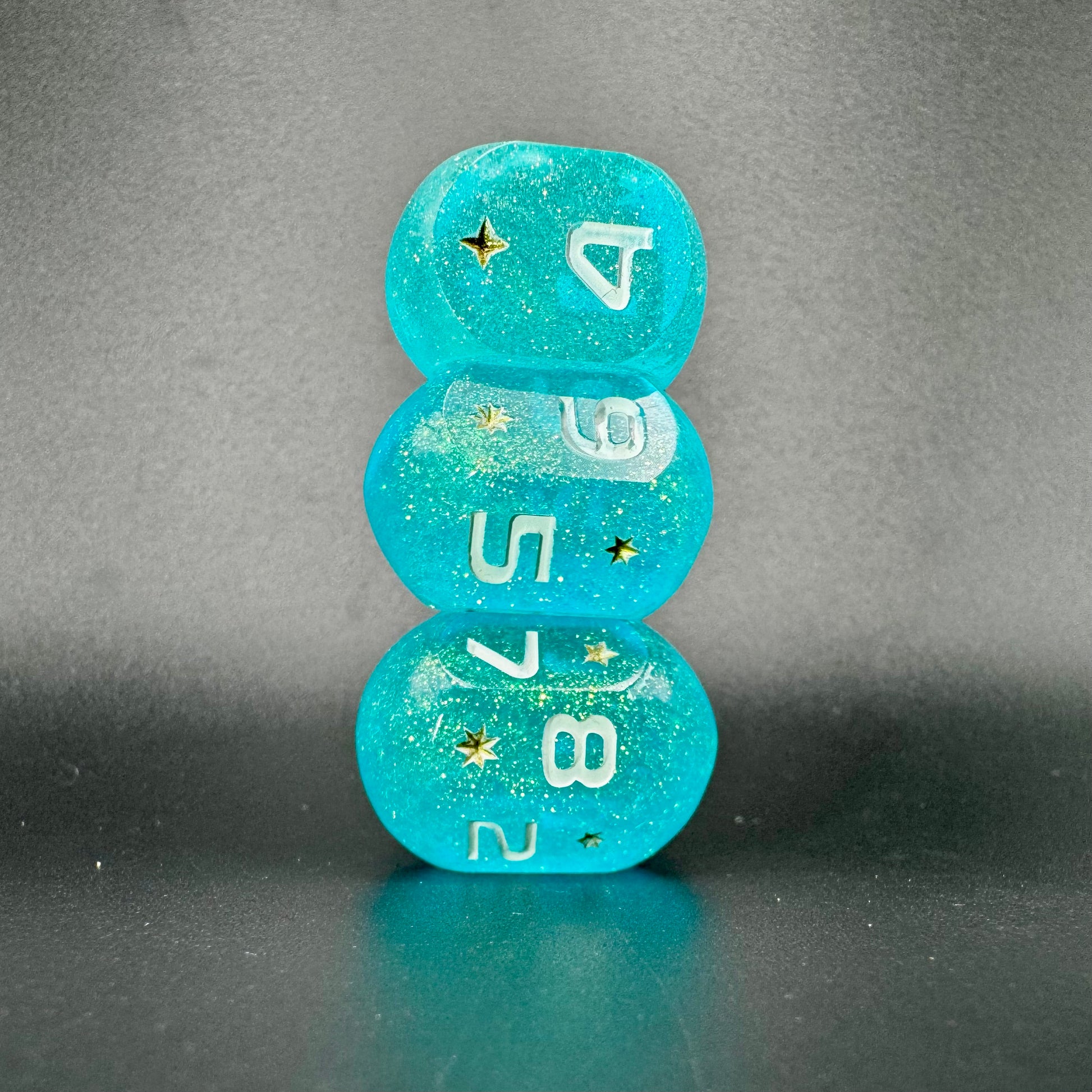 Bright sky blue orb style dice with a shimmering green-gold colourshift. Numbers inked in white with star details in metallic gold.