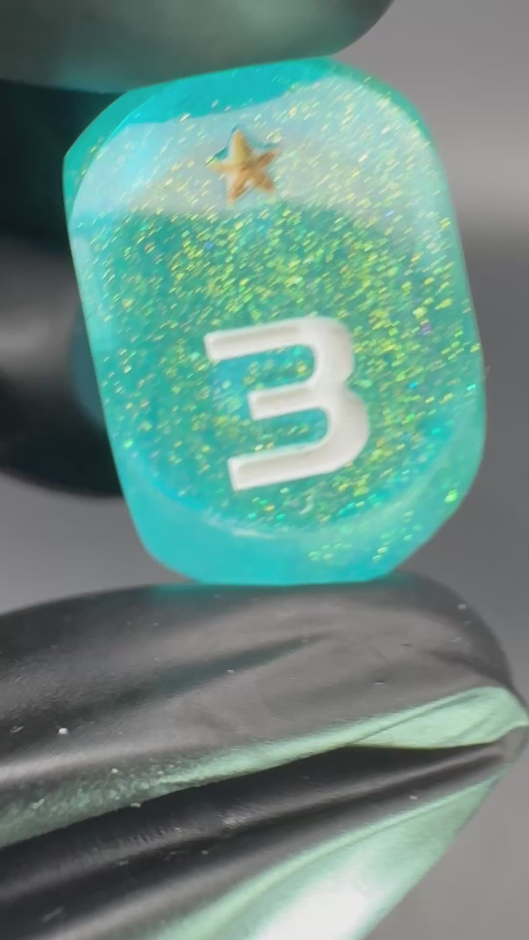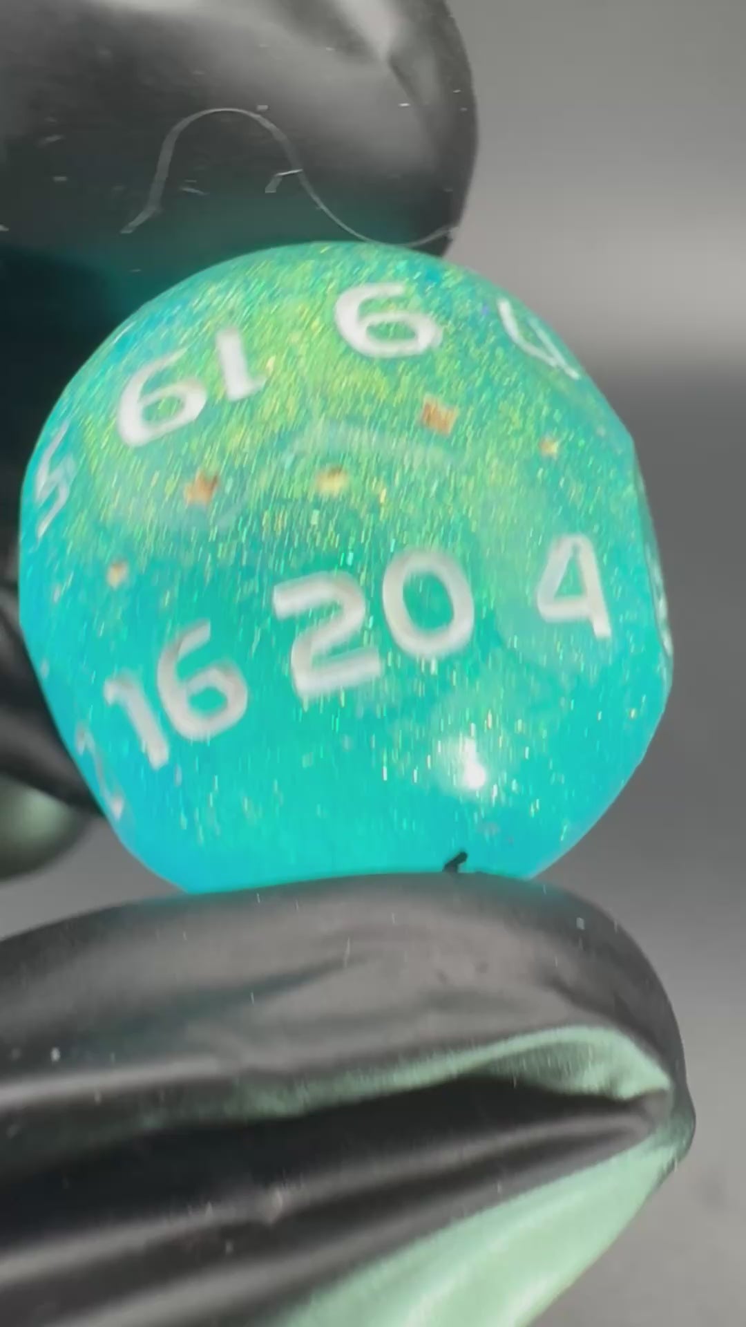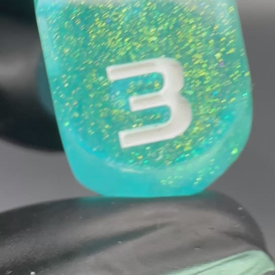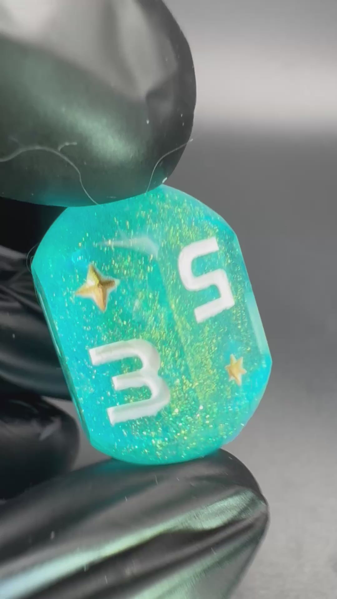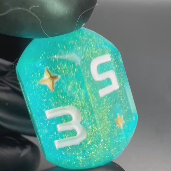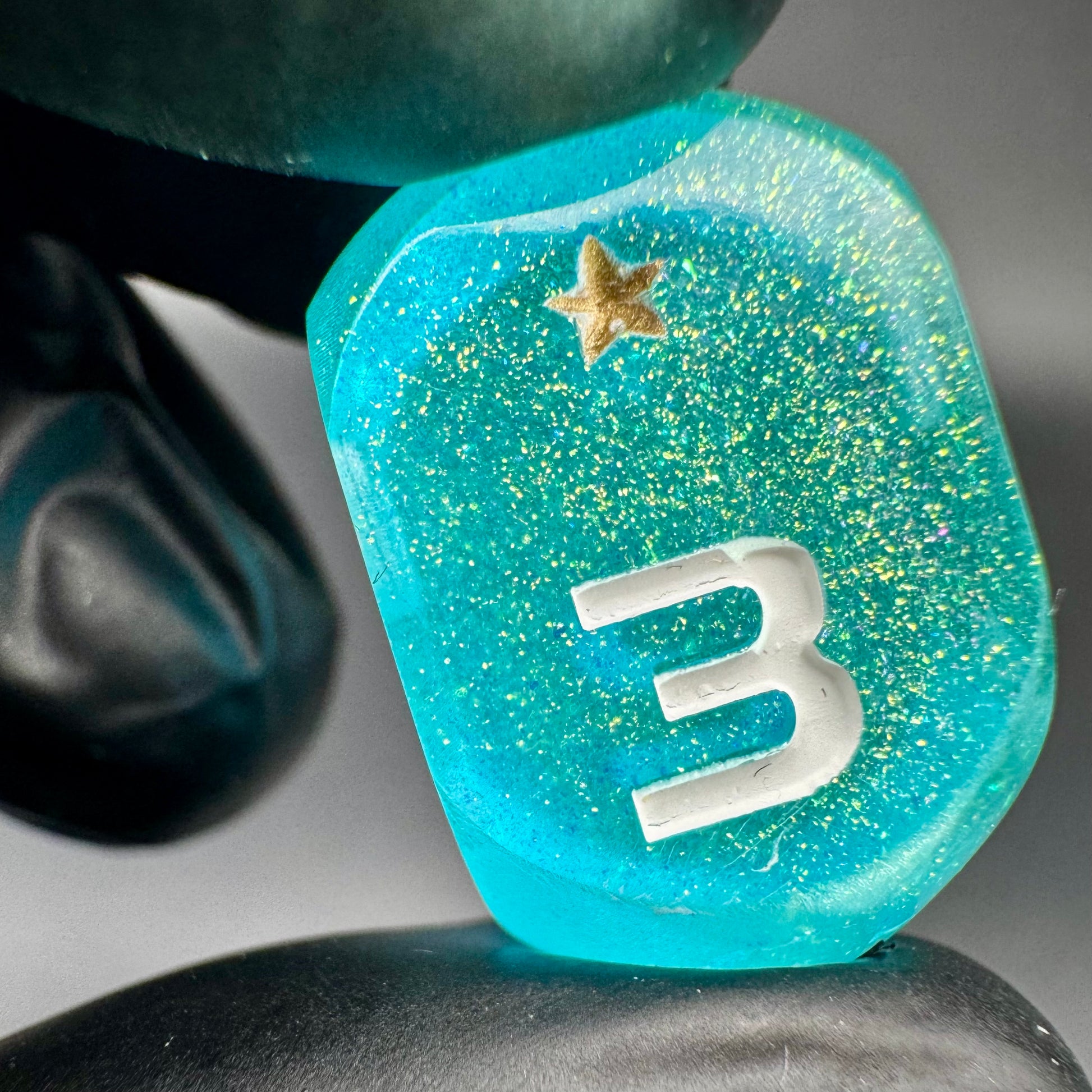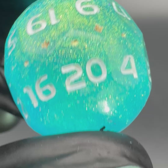 Bright sky blue orb style dice with a shimmering green-gold colourshift. Numbers inked in white with star details in metallic gold.